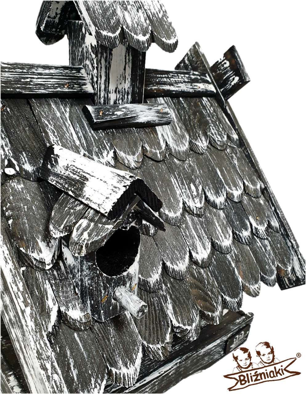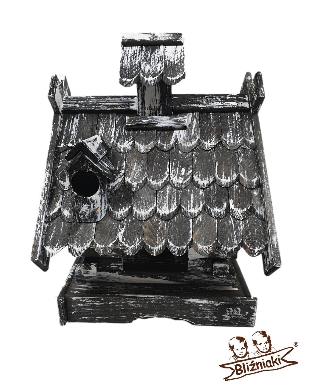 Wytworzony w całości z drewna, dach pokryty jest kolorową dachówką. Całość wykonana jest bardzo starannie i z wielką precyzją. Karmnik posiada otwierany komin będący dozownikiem pokarmu sypkiego dla ptaków. Wyposażony jest też w ślepe okiennice służące do umieszczenia w nich np. smalcu.
