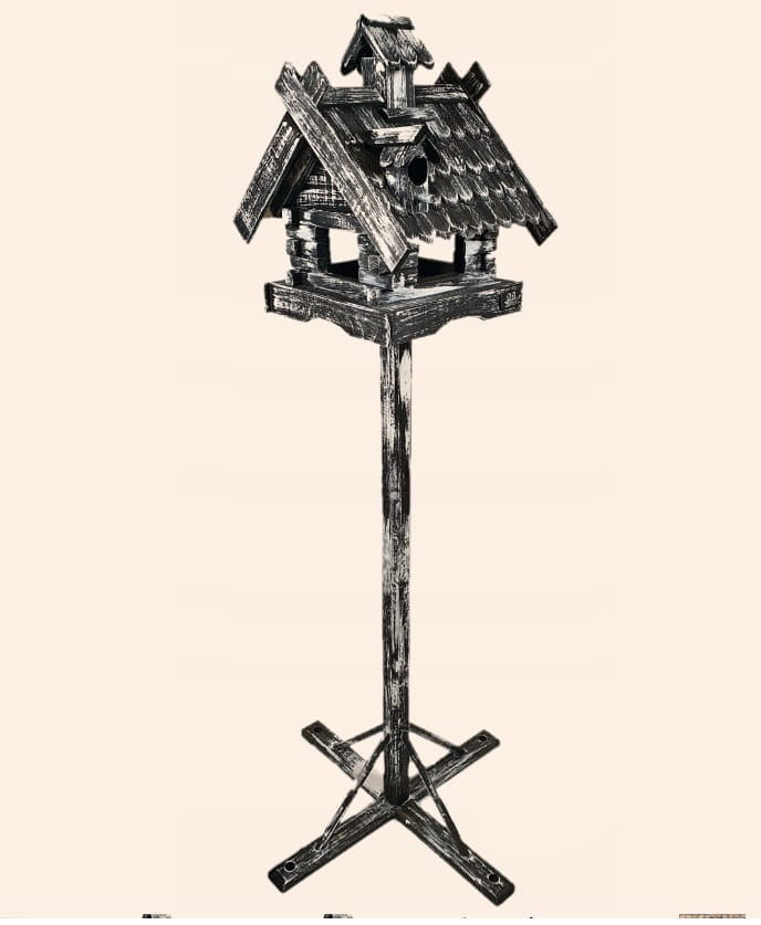 Przedmiotem sprzedaży jest ozdobny drewniany Karmnik dla ptaków w zestawie ze stojakiem .