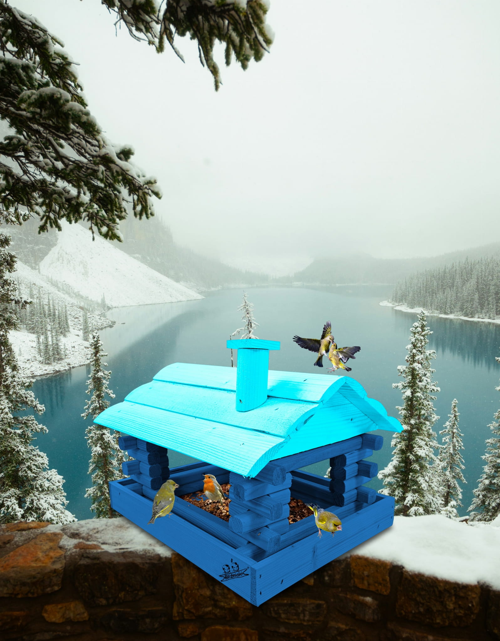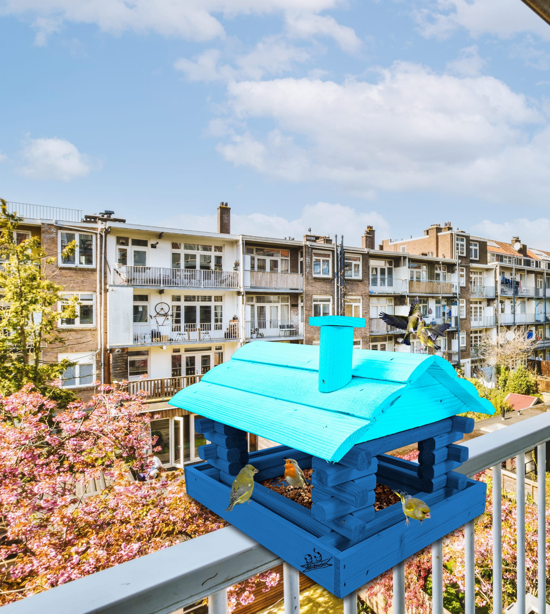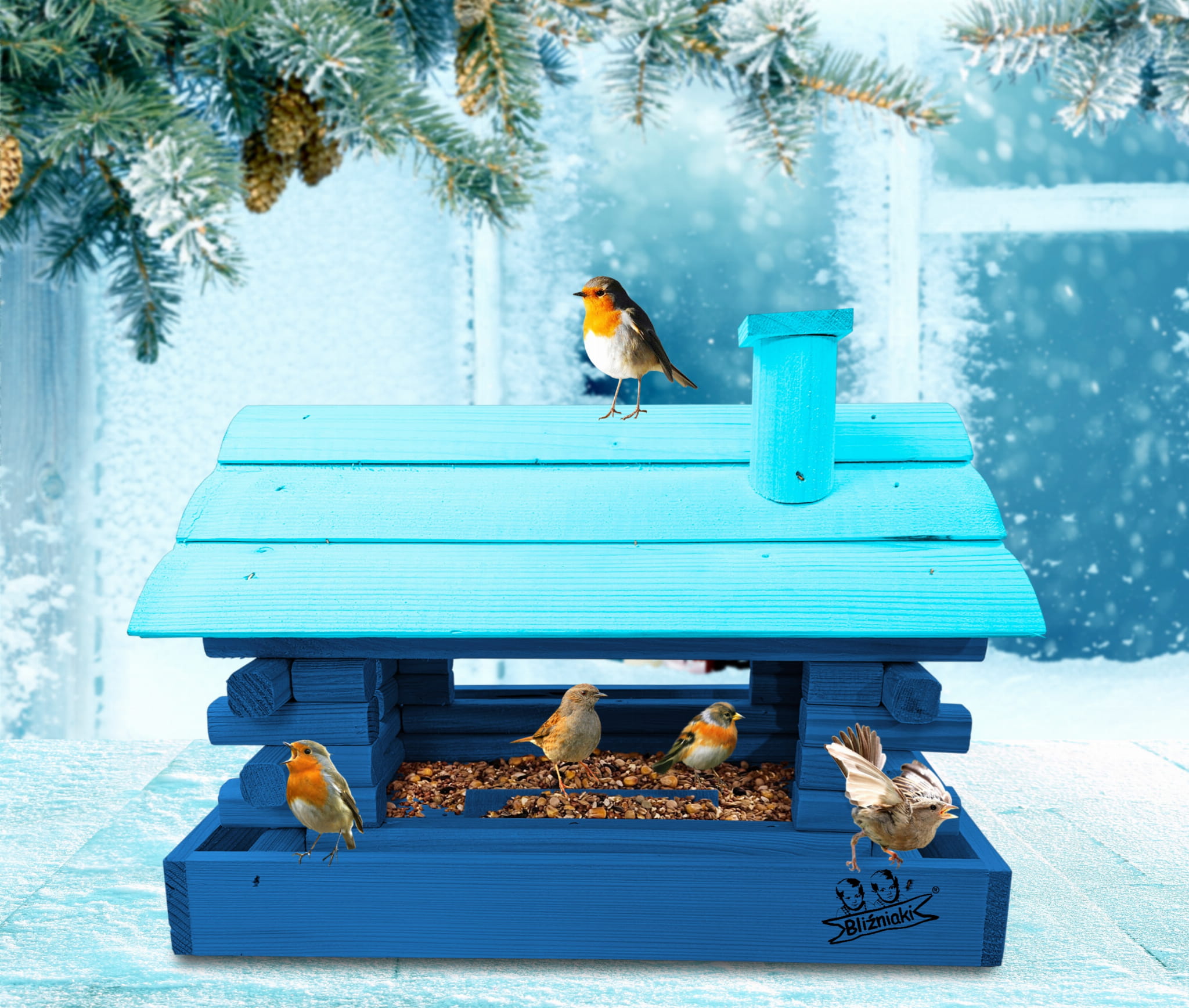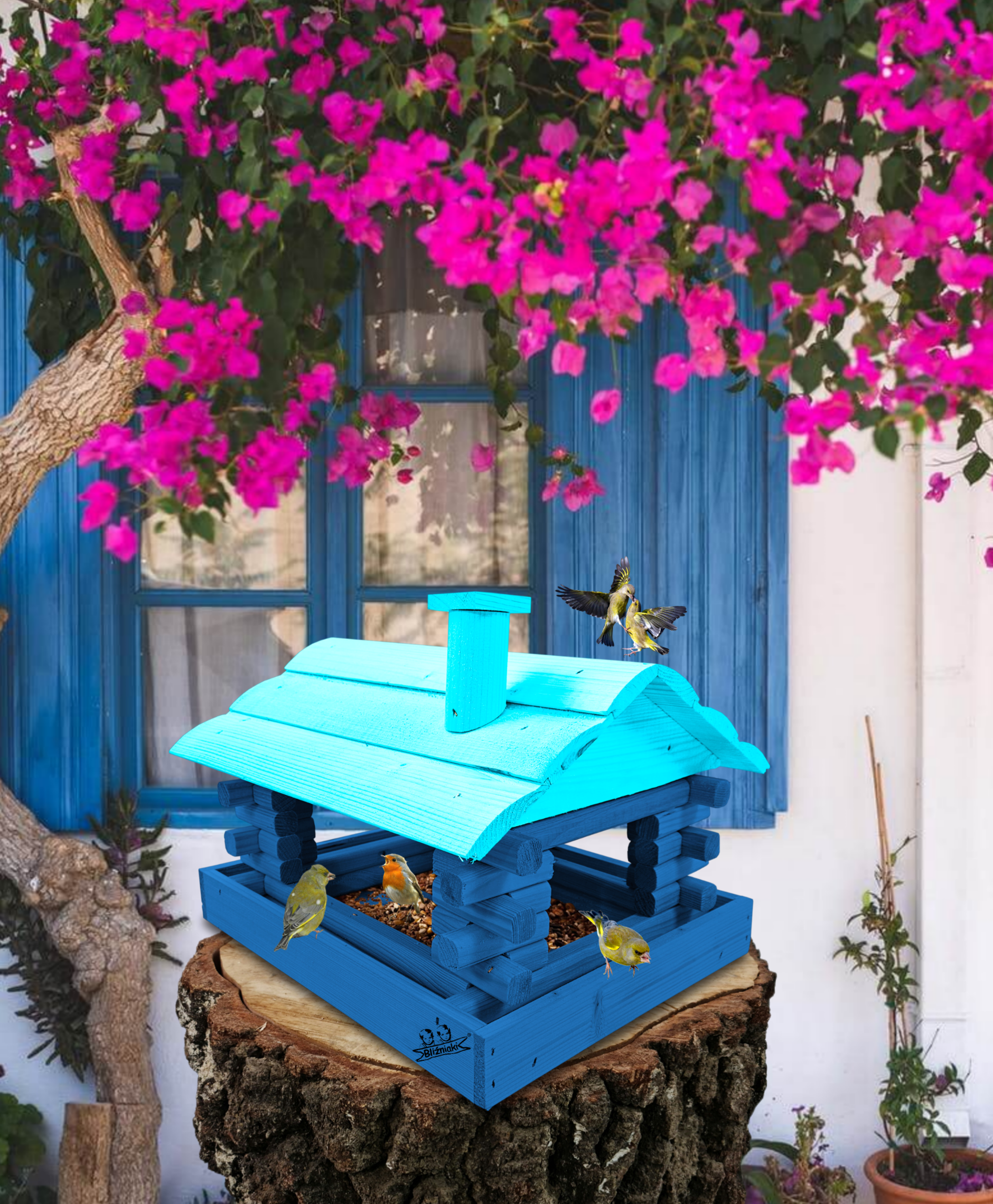 Duży Karmnik Drewniany Granatowy z Błękitnym dla Sikorek na Balkon Taras Okno Karmniki Ekologiczne Ozdobne Schronienie Domek Karmniczek na Pokarm dla Ptaków K182a NB NBP