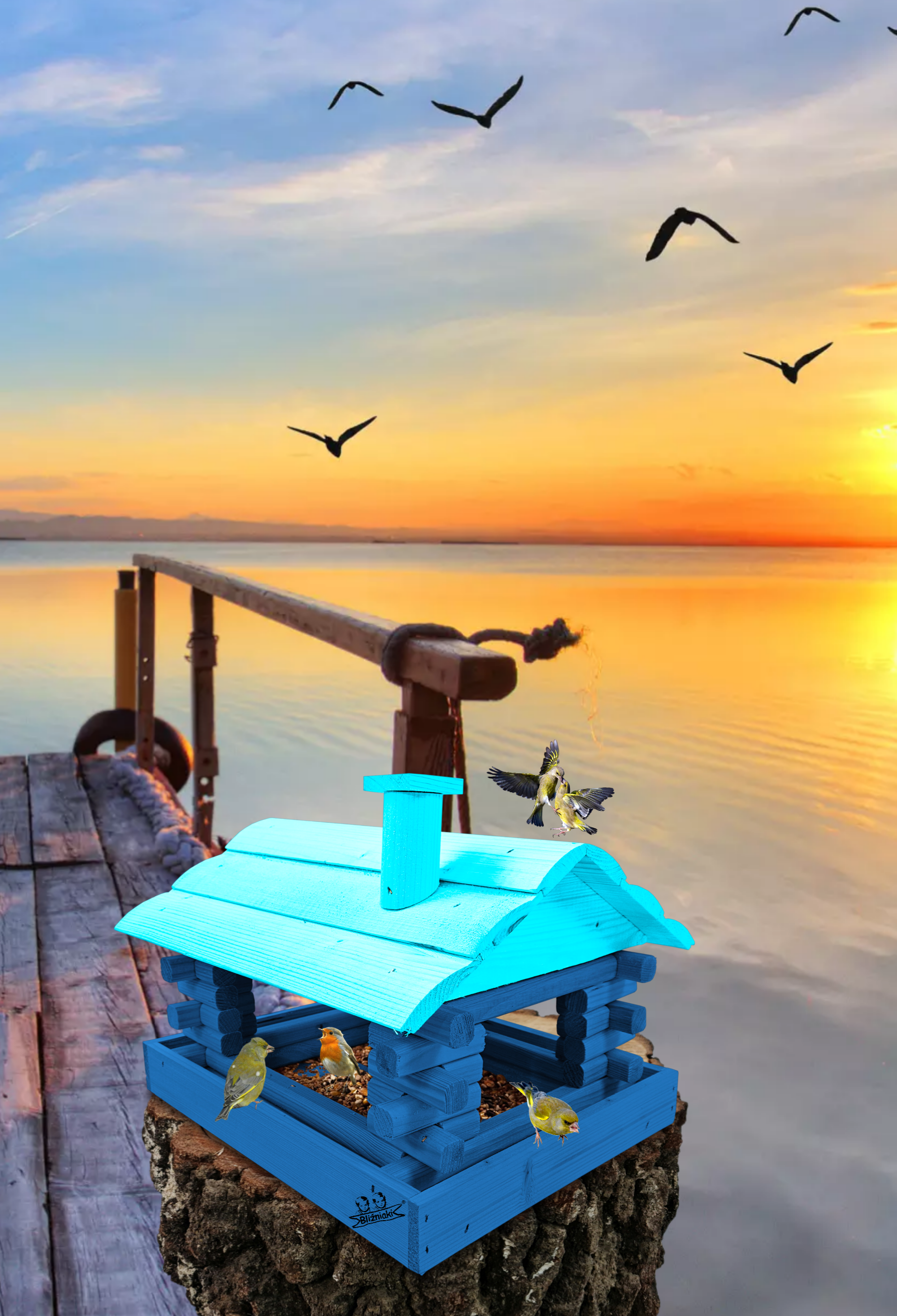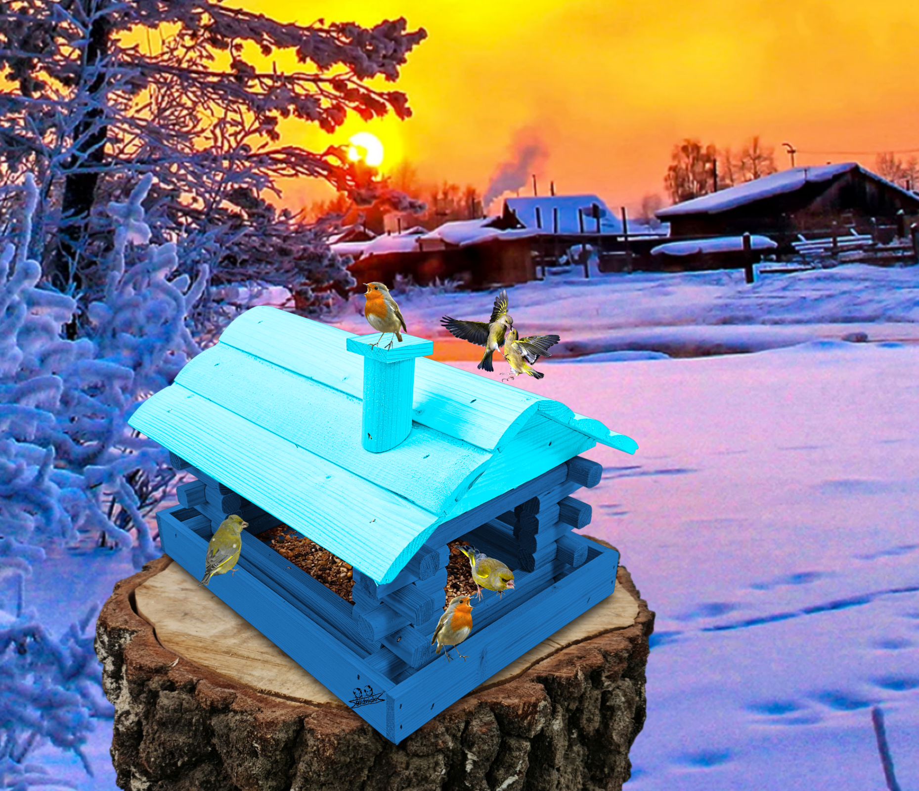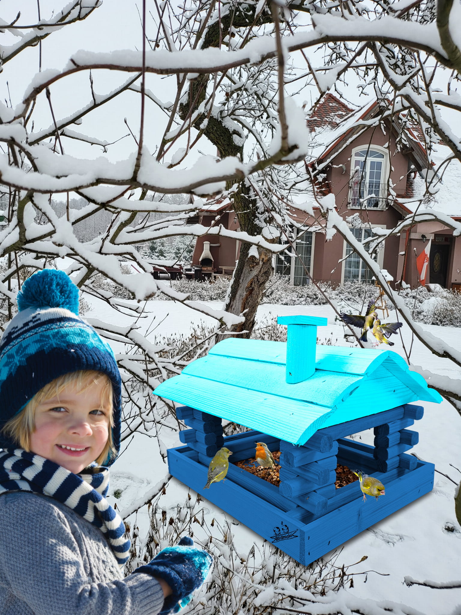 Karmnik wykonany z trwałego drewna, o starannym wykończeniu, przypomina klasyczny domek z kominem. Zapewnia ptakom bezpieczne i przytulne miejsce do odpoczynku oraz dostępu do pożywienia w zimniejszych miesiącach.