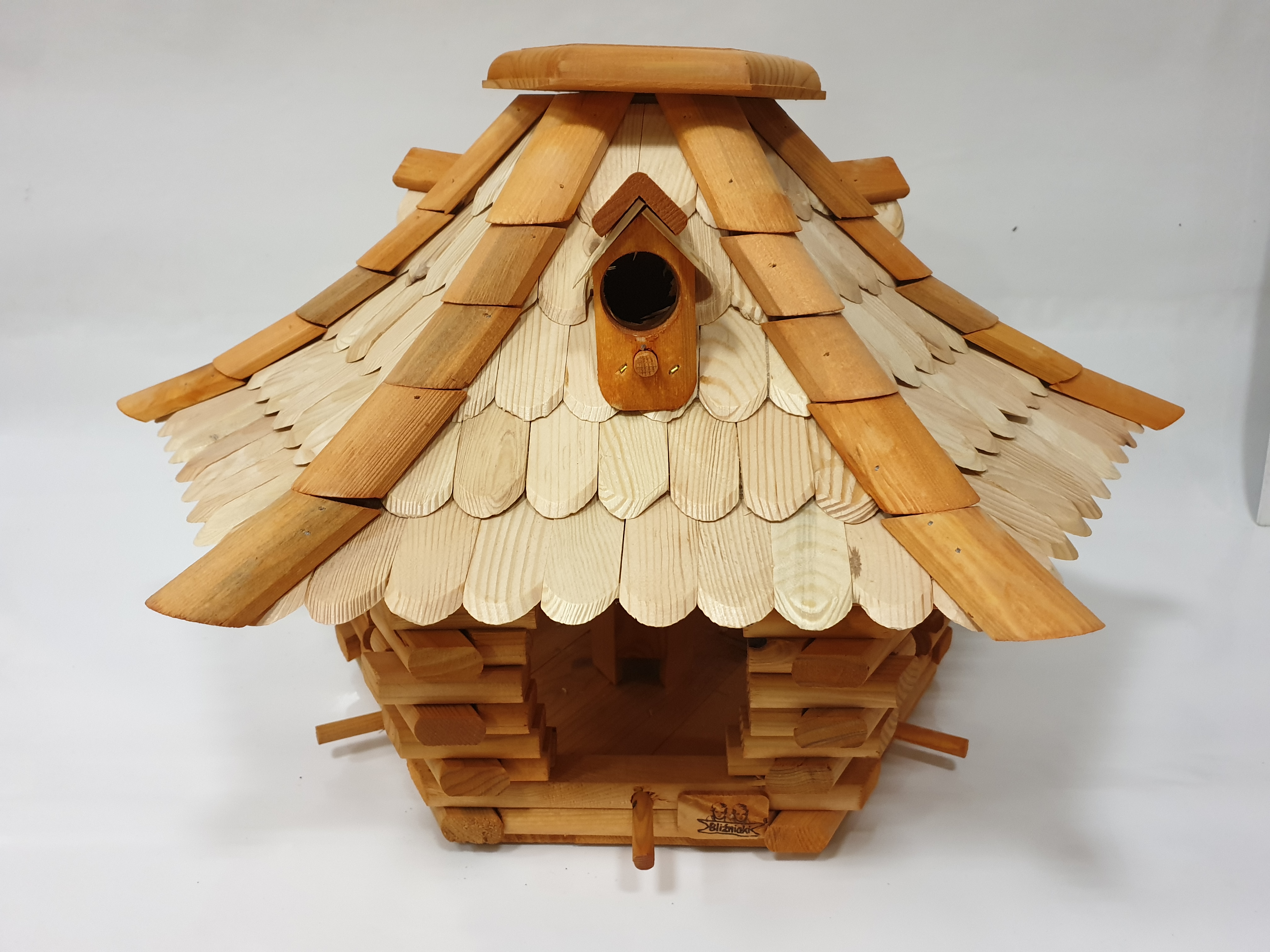 Wytworzony w całości z drewna, dach pokryty jest kolorową dachówką. Całość wykonana jest bardzo starannie i z wielką precyzją. Dodatkowo wyposażony jest w budkę lęgową, gdzie ptaki mogą stworzyć gniazdo.