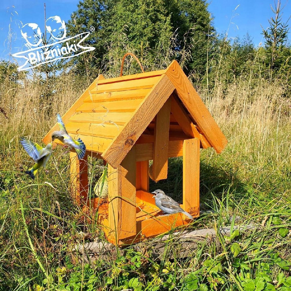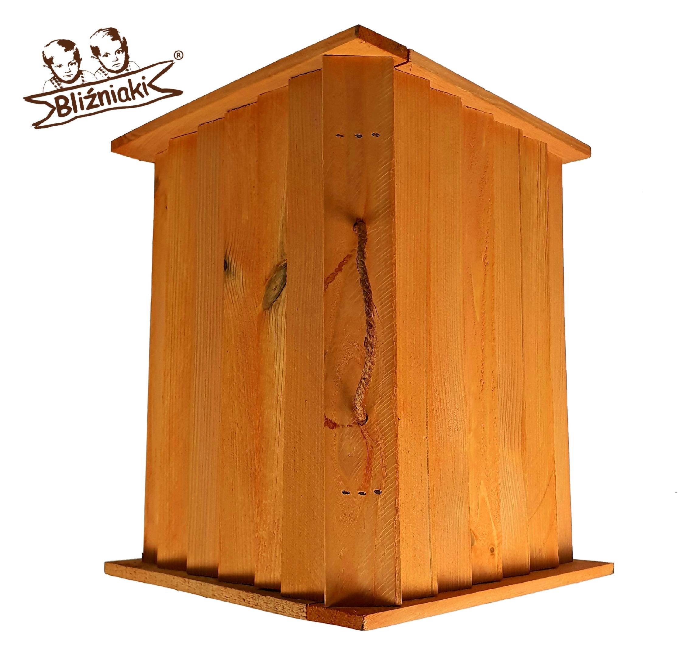 Wyposażony w szeroki dach, karmnik skutecznie chroni pożywienie przed deszczem i śniegiem. Dzięki temu zapewnia dłuższą świeżość dostarczanego pokarmu. Wykonany z wysokiej jakości drewna sosnowego, karmnik zachwyca estetyką oraz gwarantuje trwałość przez wiele sezonów zimowych. Posiada haczyk na karmę oraz zawieszkę na dachu ułatwiającą montaż budki na drzewie lub krzewach.