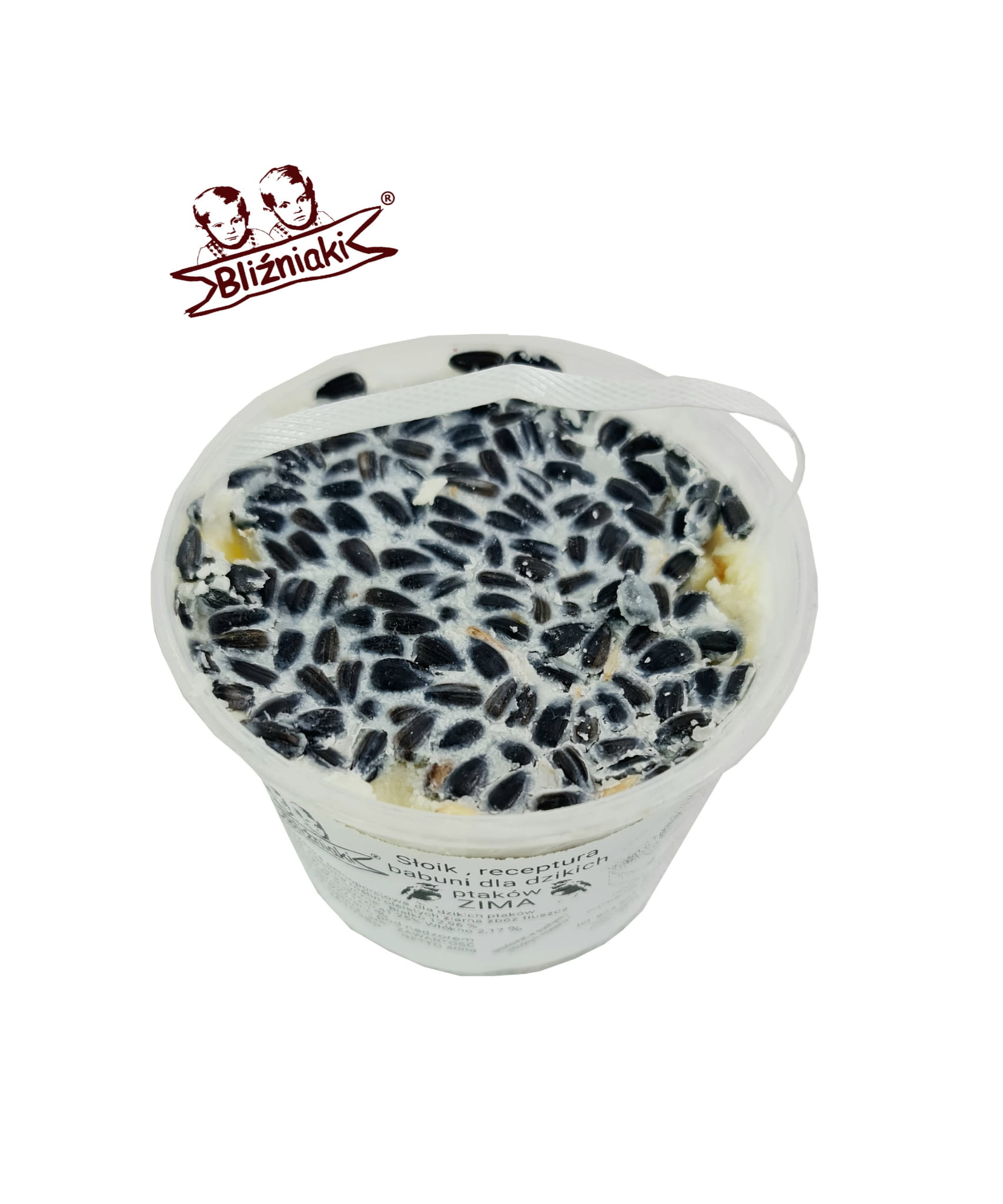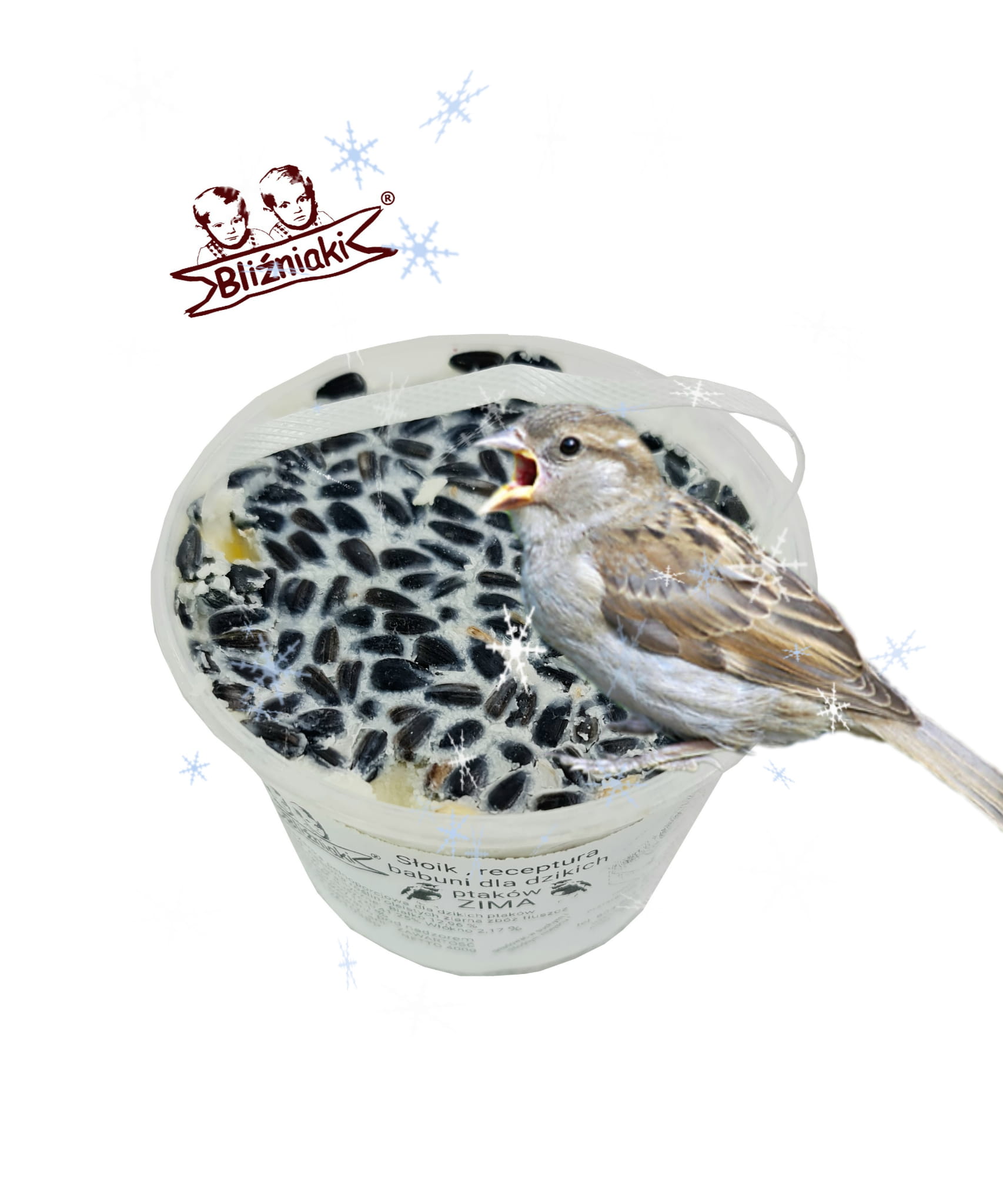 Nasz SŁOIK BABUNI w zestawie z karmnikiem przeznaczony jest dla wszystkich dzikich ptaków zimujących w Polsce. Jest to wysokoenergetyczny pokarm w postaci tłuszczowej mieszanki z ziarnami będący doskonałym uzupełnieniem dla karm sypkich. W jego składzie znajdują się ziarna zbóż, nasiona roślin oleistych i tłuszcz. Produkt został stworzony wyłącznie z surowców naturalnych. Mieszanka jest nie tylko smakołykiem, ale dzięki dużej zawartości minerałów, witamin, białka i tłuszczu jest wysokoenergetyczną karmą pozwalającą przetrwać ptakom okres zimowy.