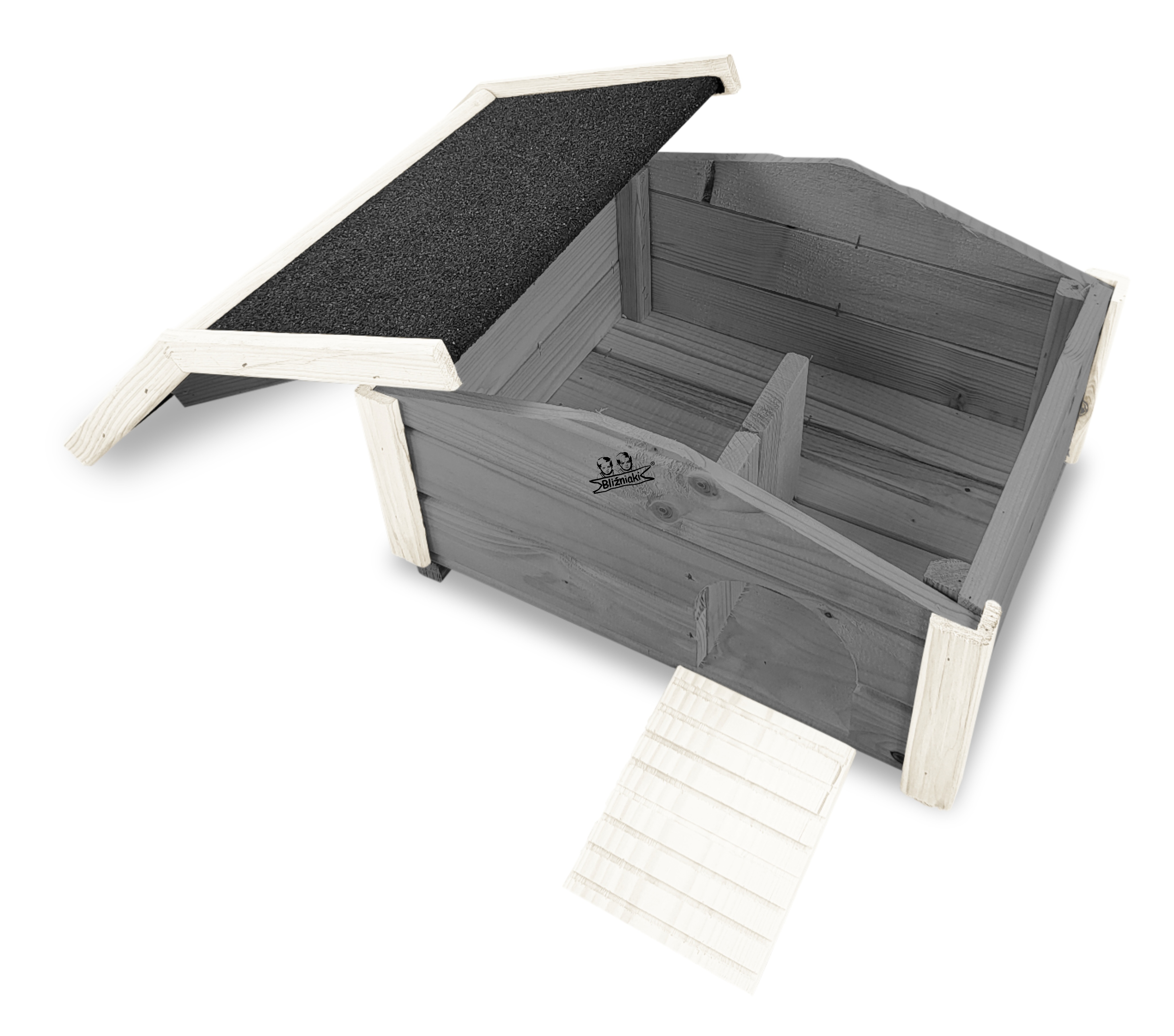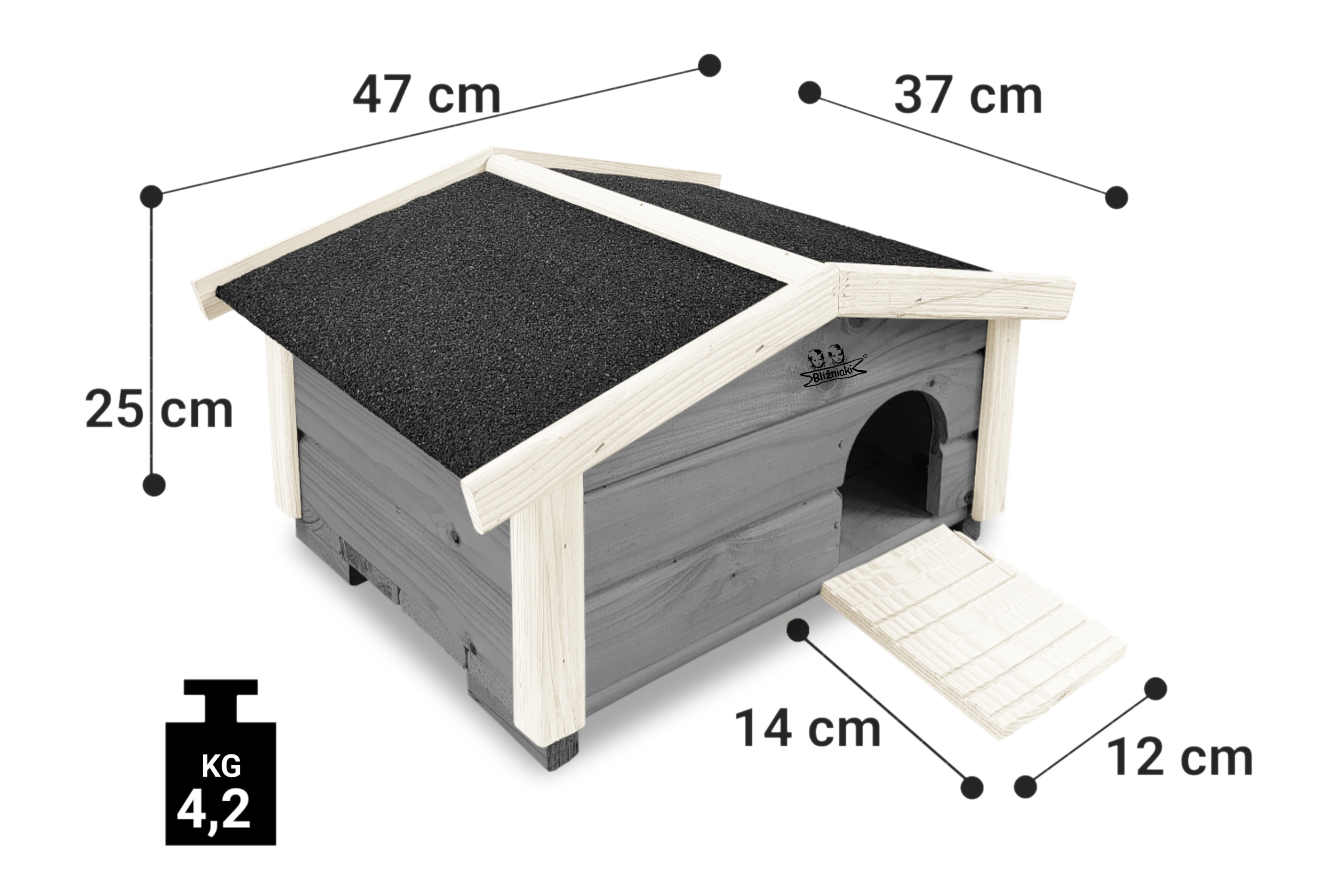 Konstrukcja domku jest stabilna, zdejmowany dwuspadowy dach ułatwi czyszczenie wnętrza budki a do środka prowadzi podest ryflowane schodki, ponadto kryta podłoga odizolowuje jeże od mokrego i zimnego podłoża co czyni ten domek komfortowym siedziskiem do lęgu małych jeżyków.