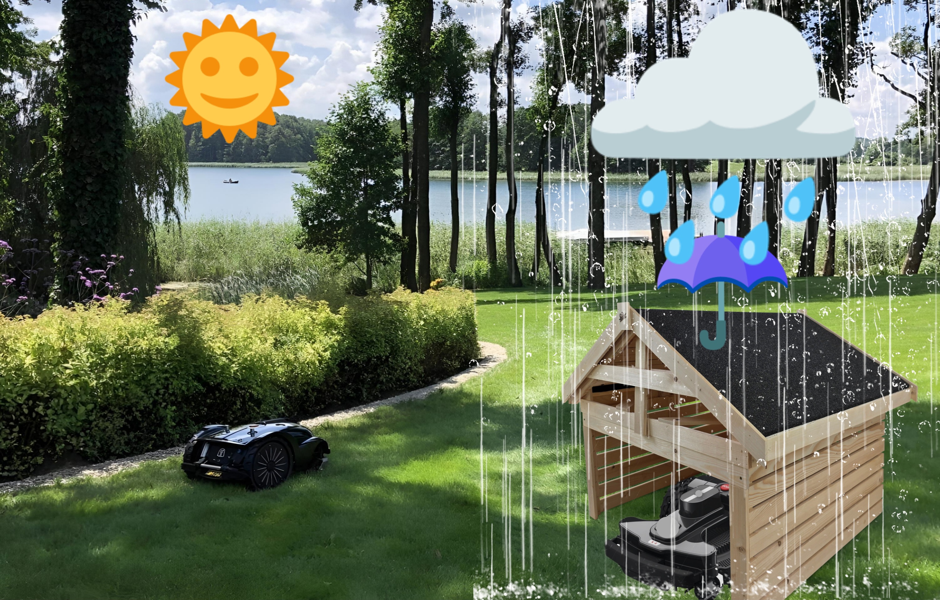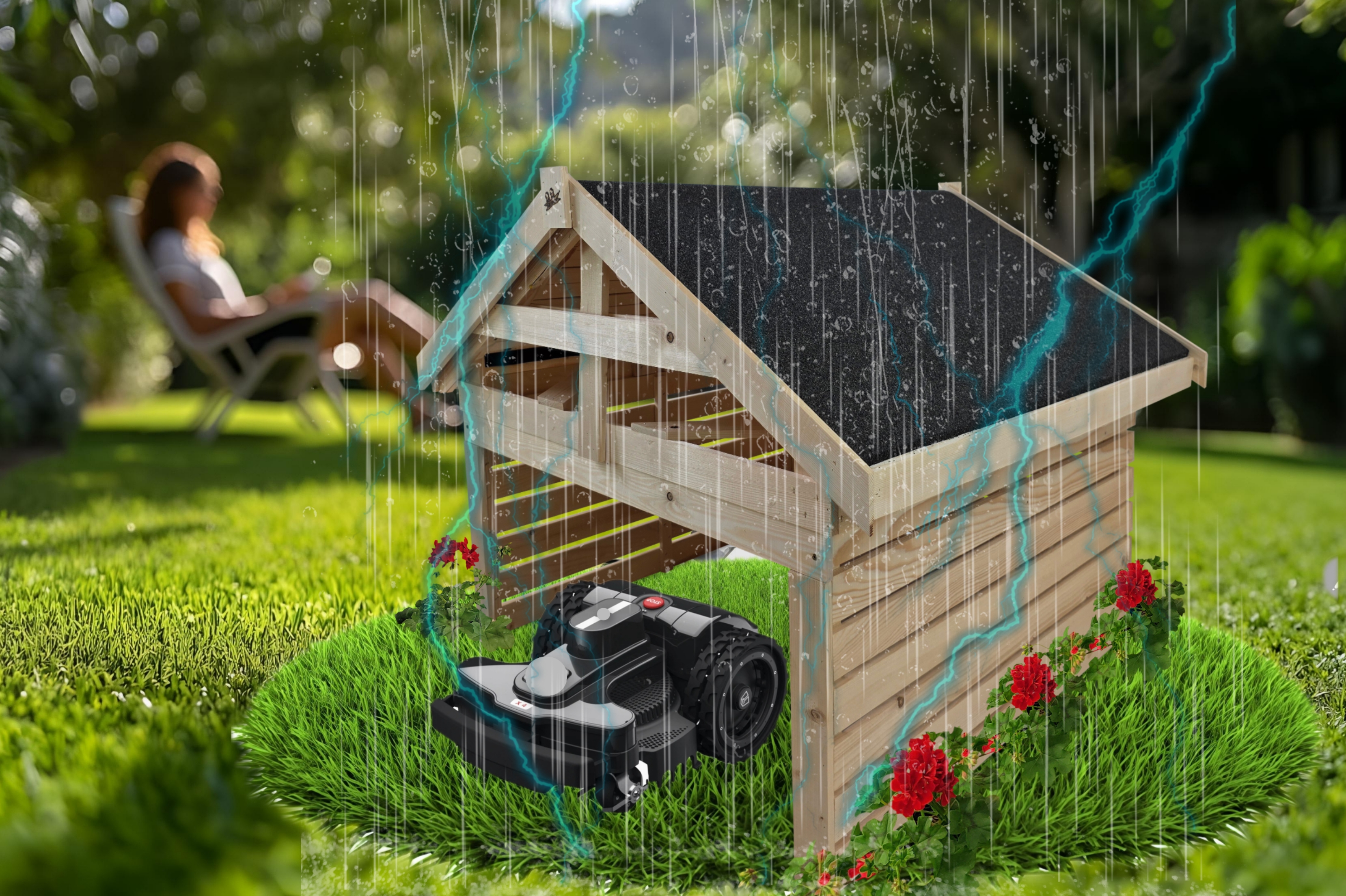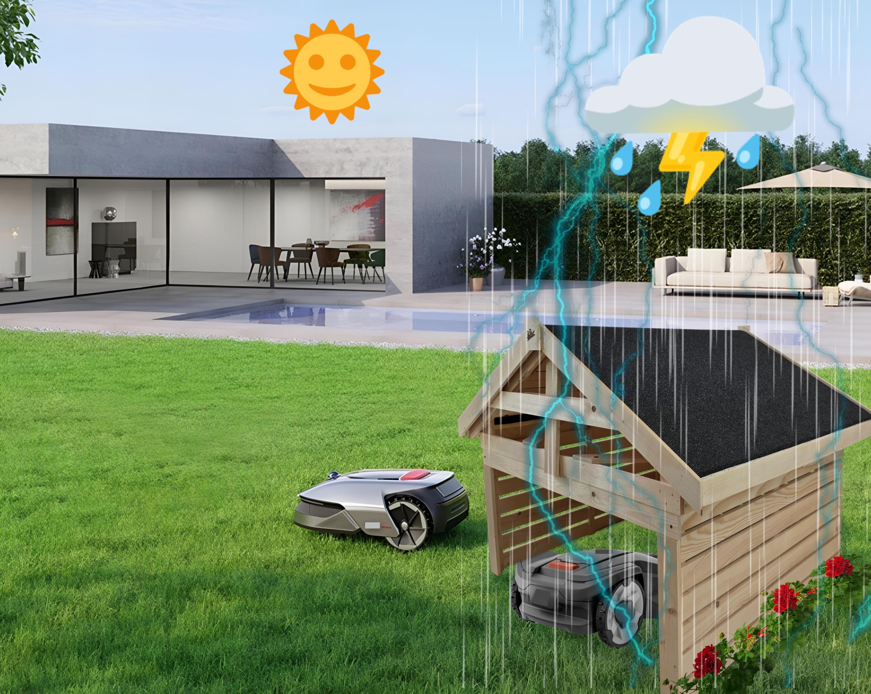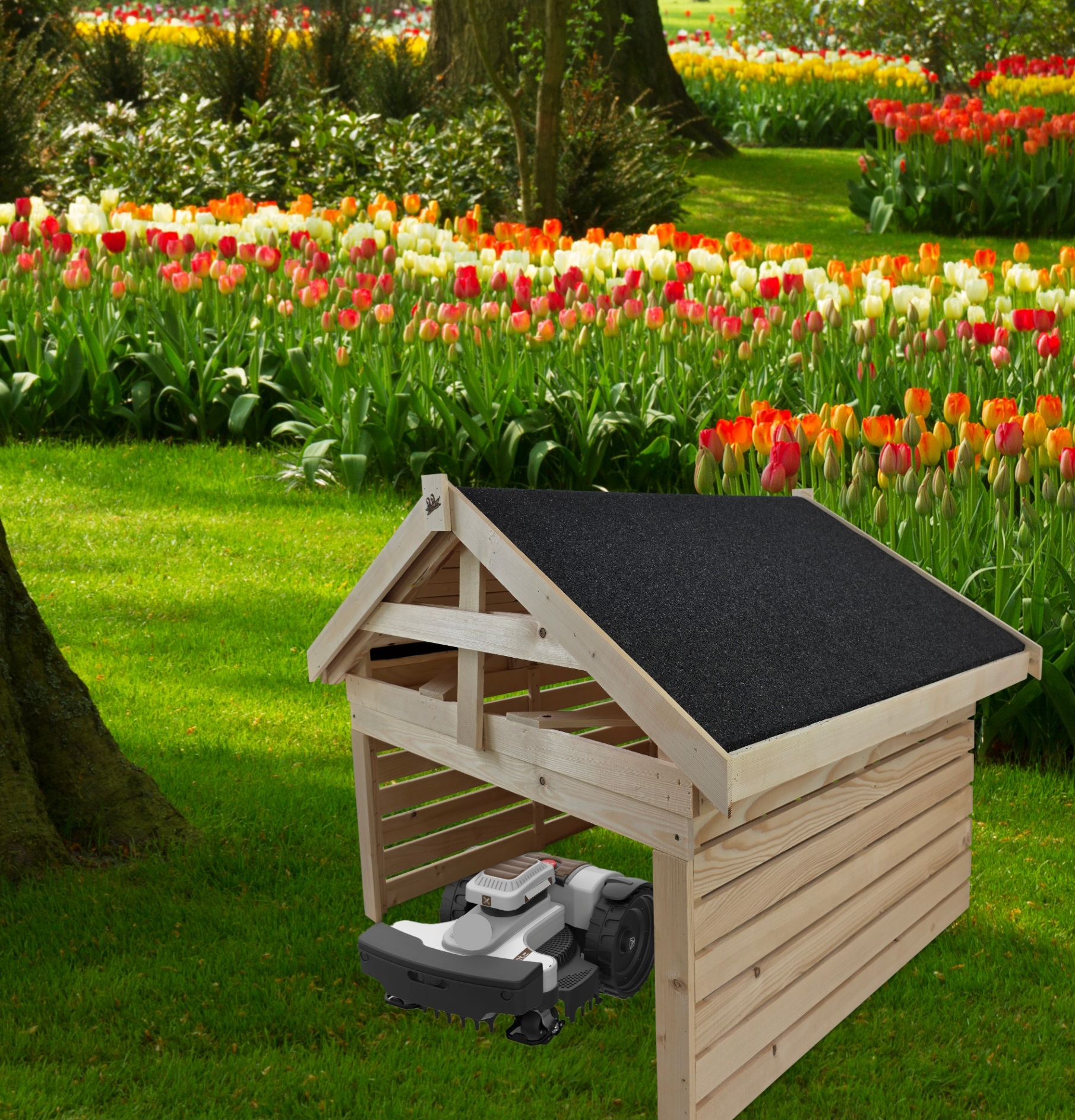 Roboty koszące są coraz częściej spotykane w naszych ogrodach. Wychodząc naprzeciw oczekiwaniom naszych klientów stworzyliśmy domek - garaż, który zapewni Twojej kosiarce ochronę przed niekorzystnymi warunkami atmosferycznymi oraz przypadkowymi uszkodzeniami mechanicznymi, przedłużając tym żywotność urządzenia. W domku robot może się również ładować gdy nie jest używany.