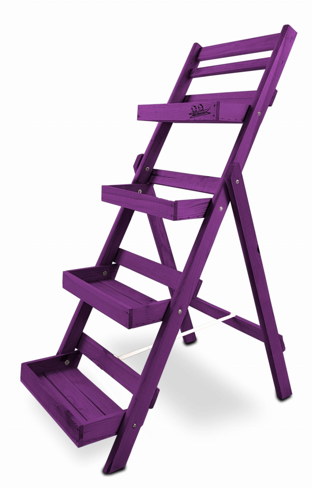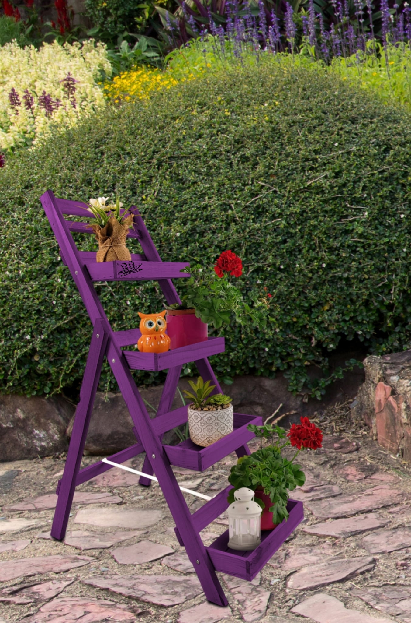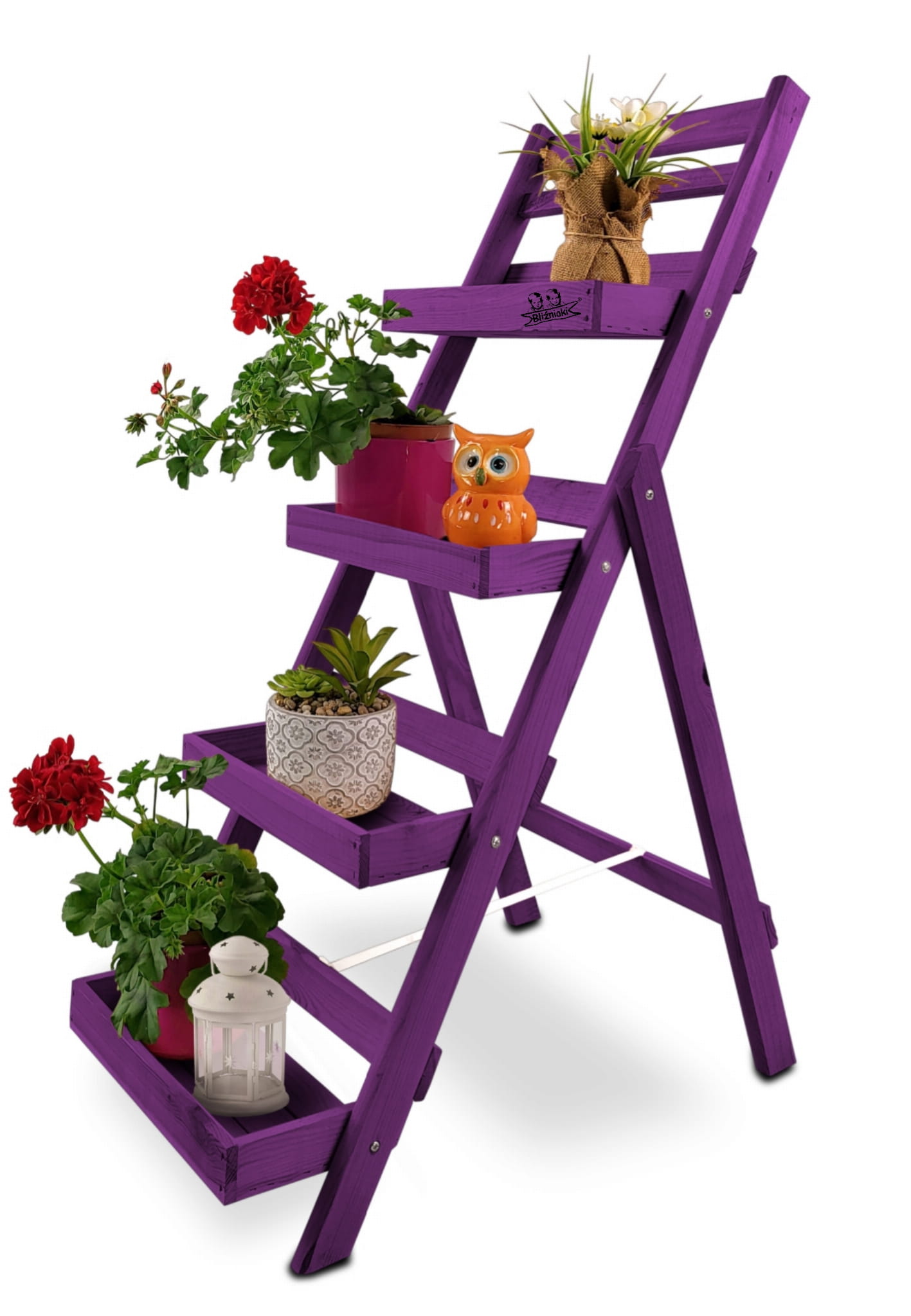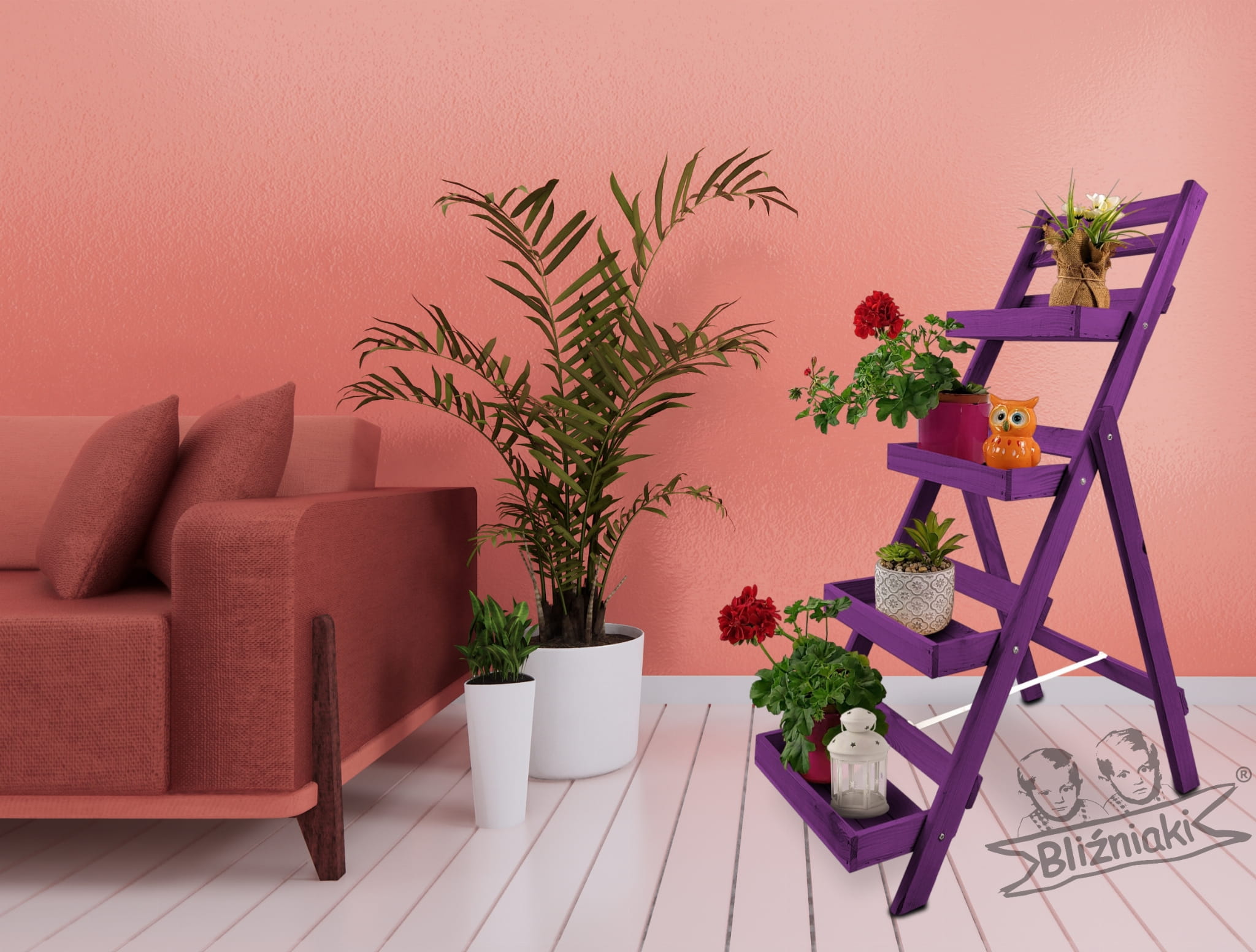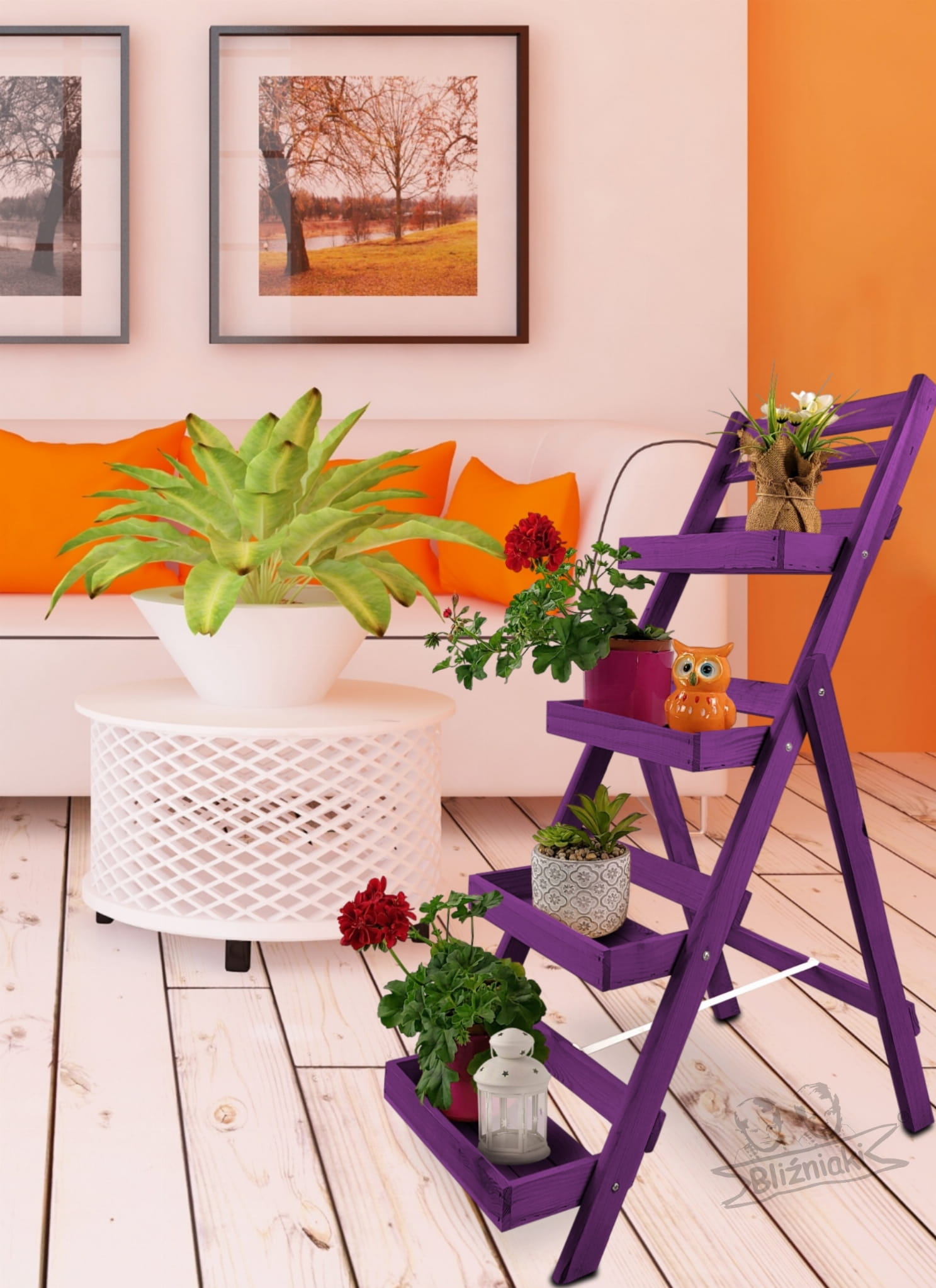 Regał został wykonany z solidnego drewna sosnowego, w kolorze FIOLETOWYM. To bardzo praktyczny i stylowy element wyposażenia nowoczesnego domu pozwalający zadbać o należny porządek w pomieszczeniach jak i na zewnątrz. Nasz stojak może również pełnić rolę ozdobnego kwietnika do ustawienia na nim doniczek z Twoimi ulubionymi kwiatami na tarasie lub balkonie.