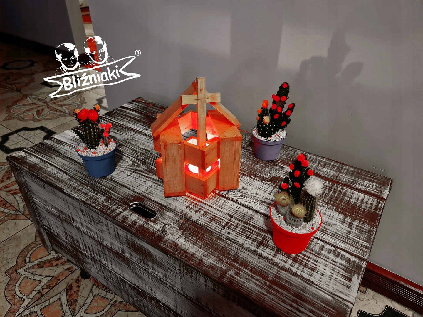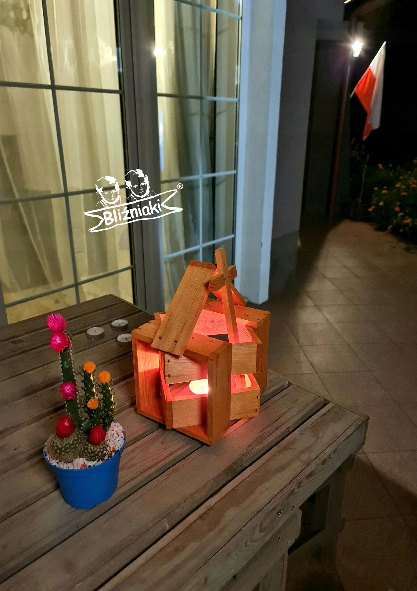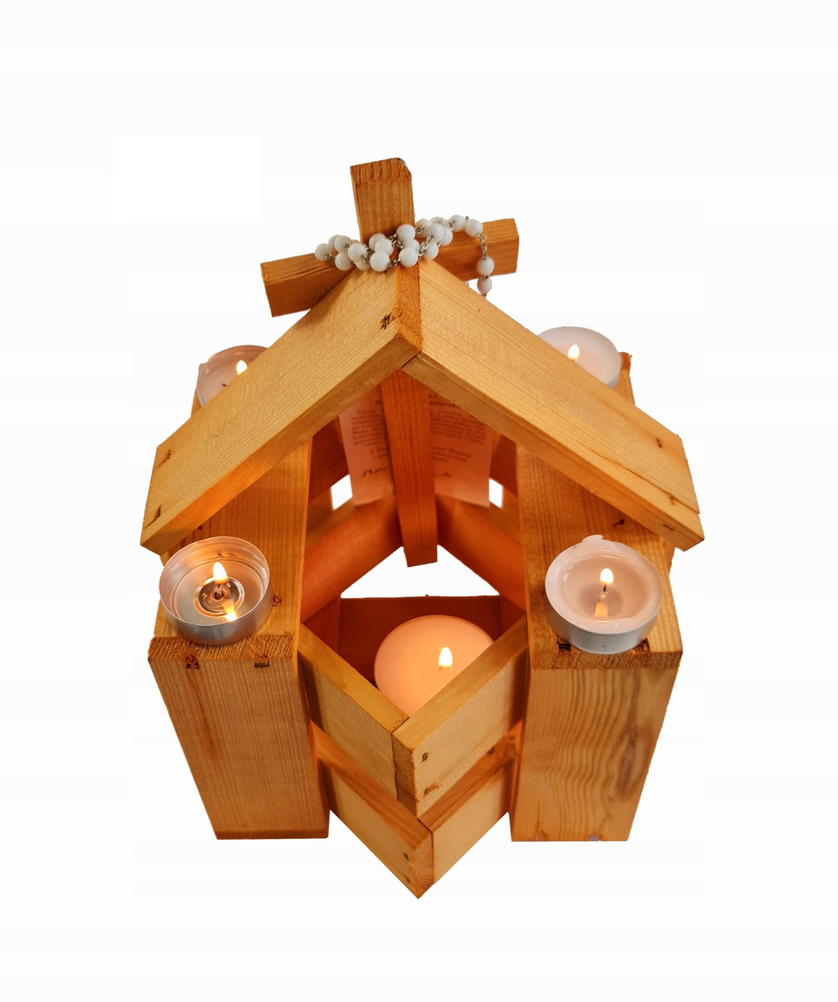 Kapliczka z drewna na podstawie kwadratu, stanowi konstrukcję do łatwego umieszczenia w niej świec, zniczy czy lamp LED.
