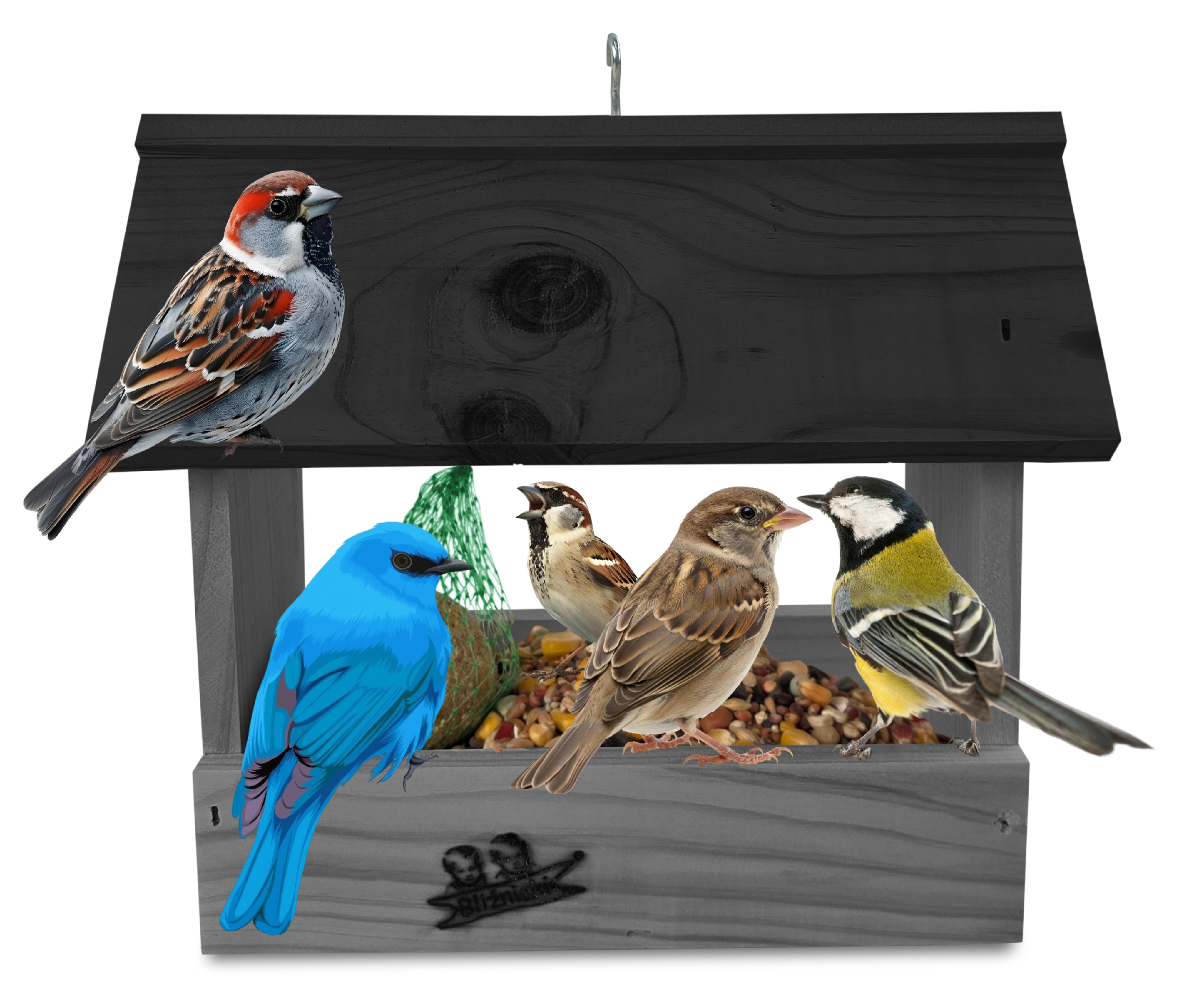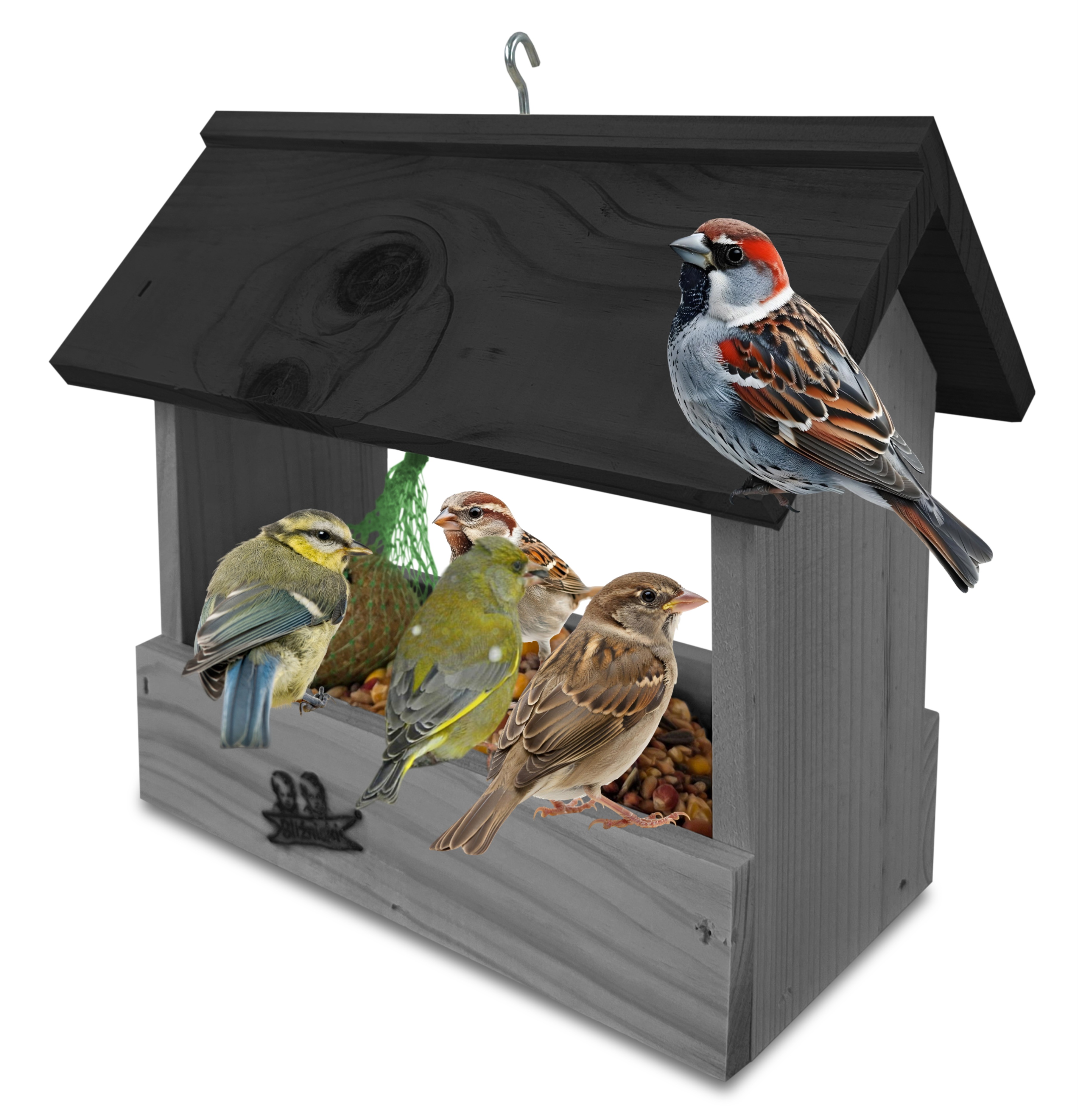 - U góry widoczny jest haczyk umożliwiający zawieszenie karmnika w dowolnym miejscu, możliwe jest również jego postawienie