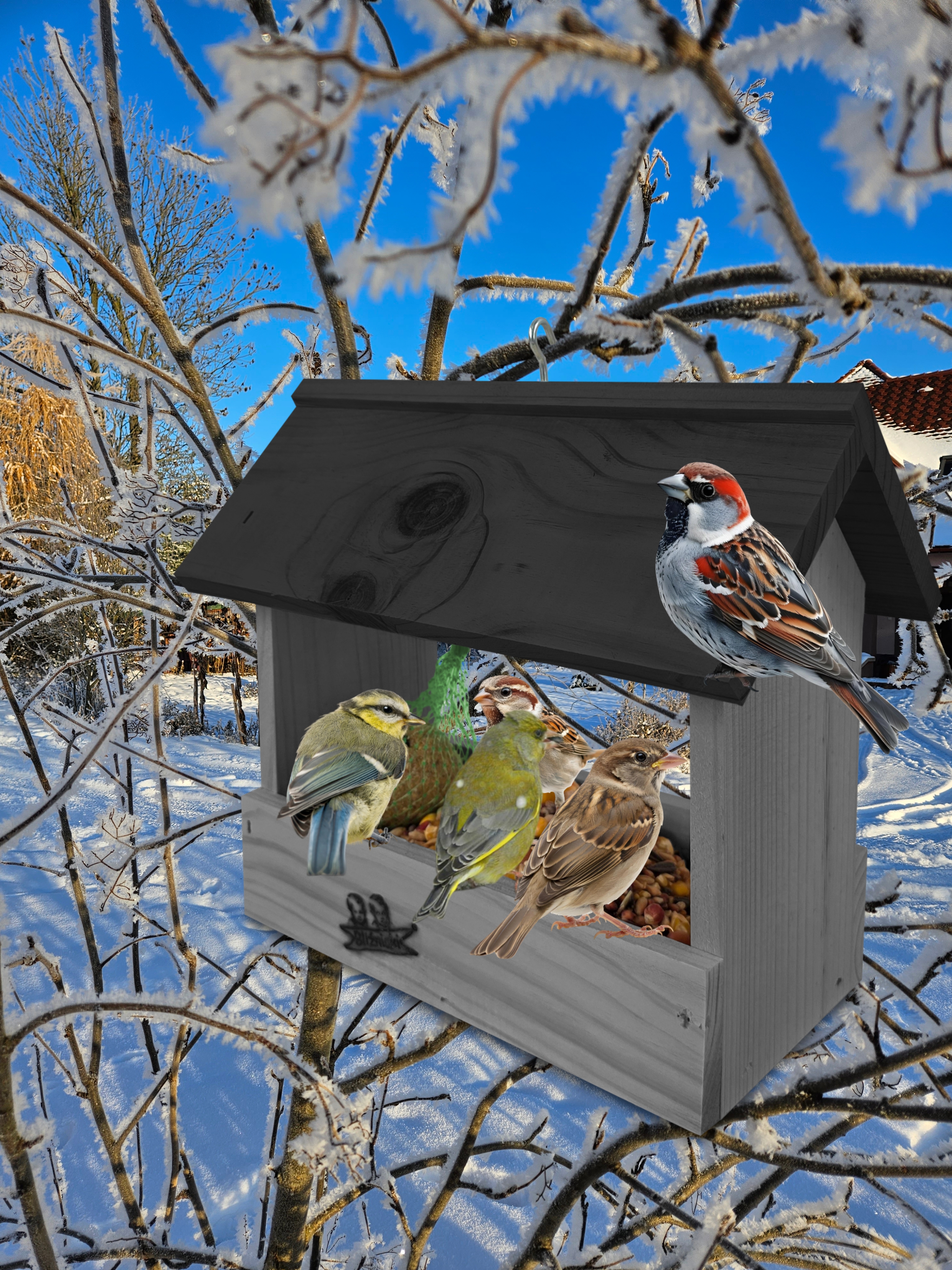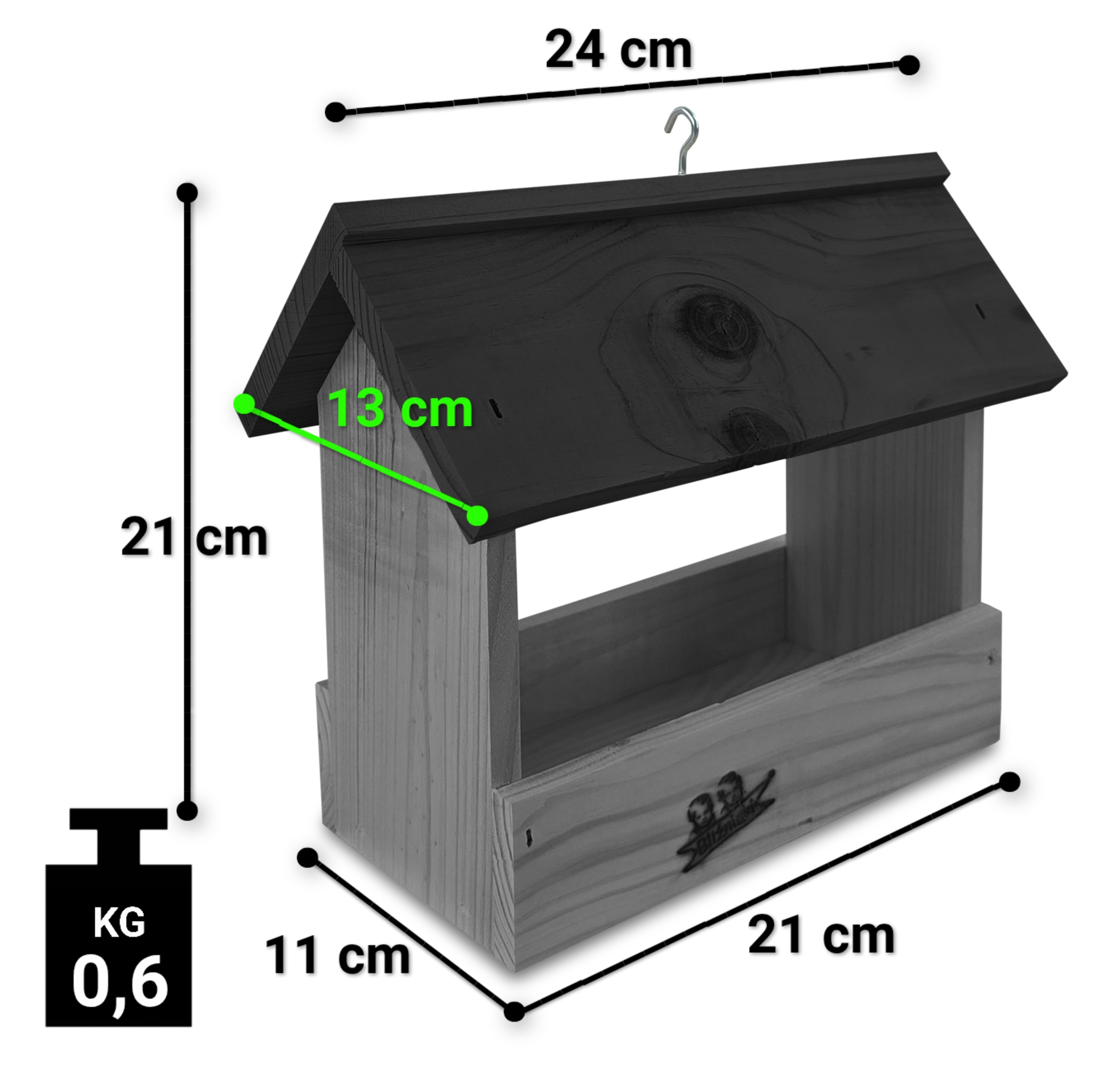 - Karmnik wykonany jest w całości z drewna iglastego, KOLOR CIEMNY SZARY Z CZARNYM DACHEM