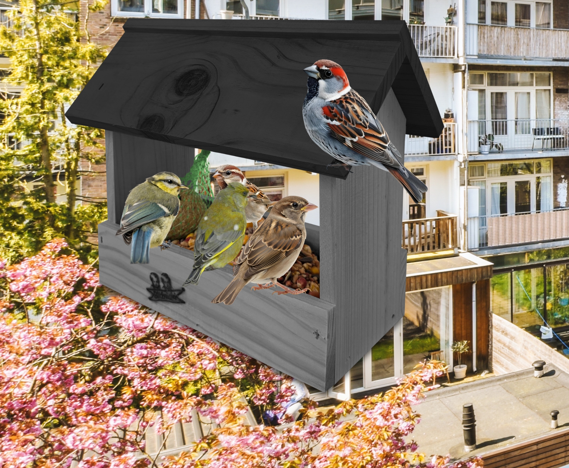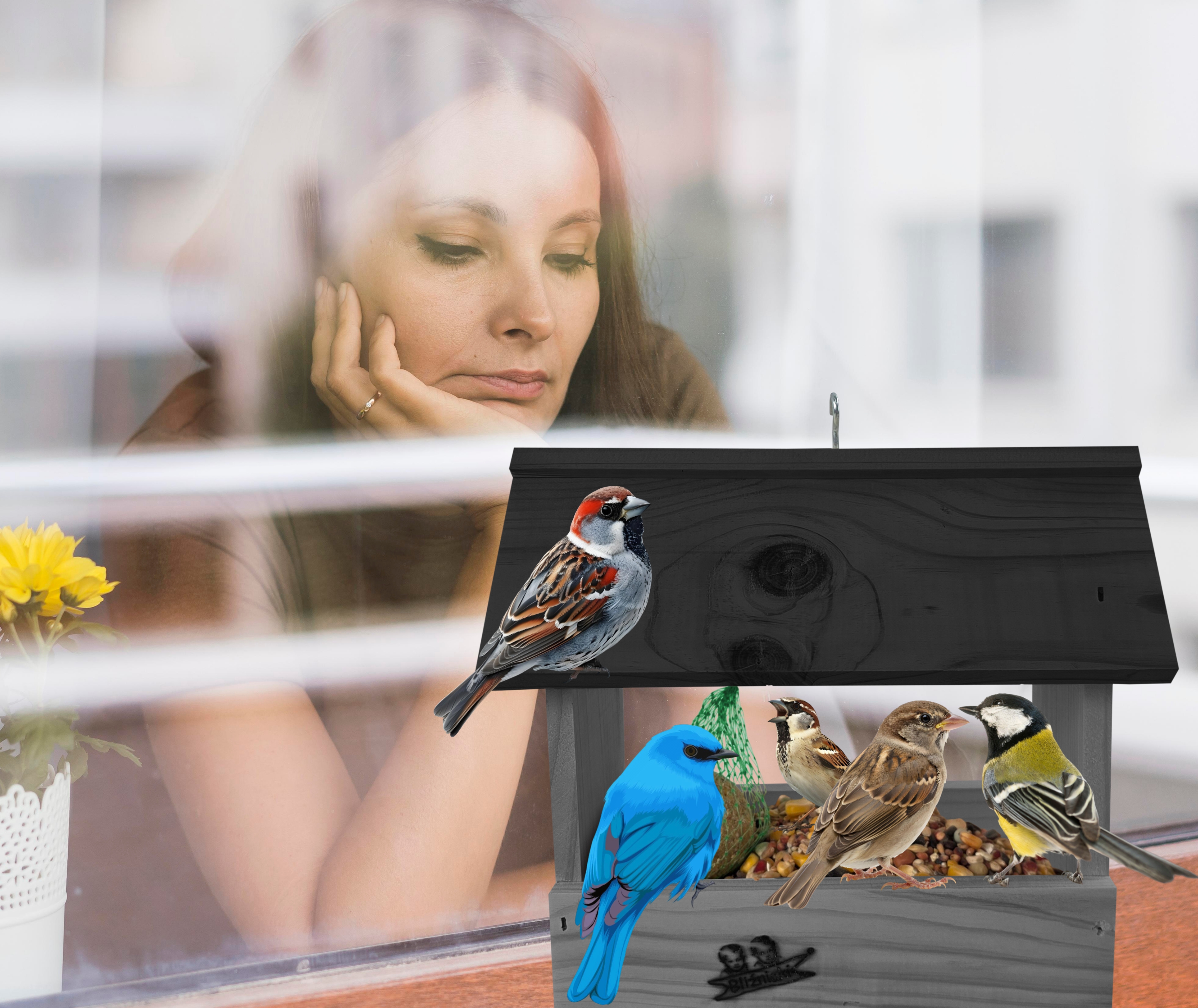 Przedmiotem sprzedaży jest ozdobny drewniany karmnik dla ptaków budka domek na balkon K204 SN CZ w kolorze ciemnoszarym z czarnym dachem