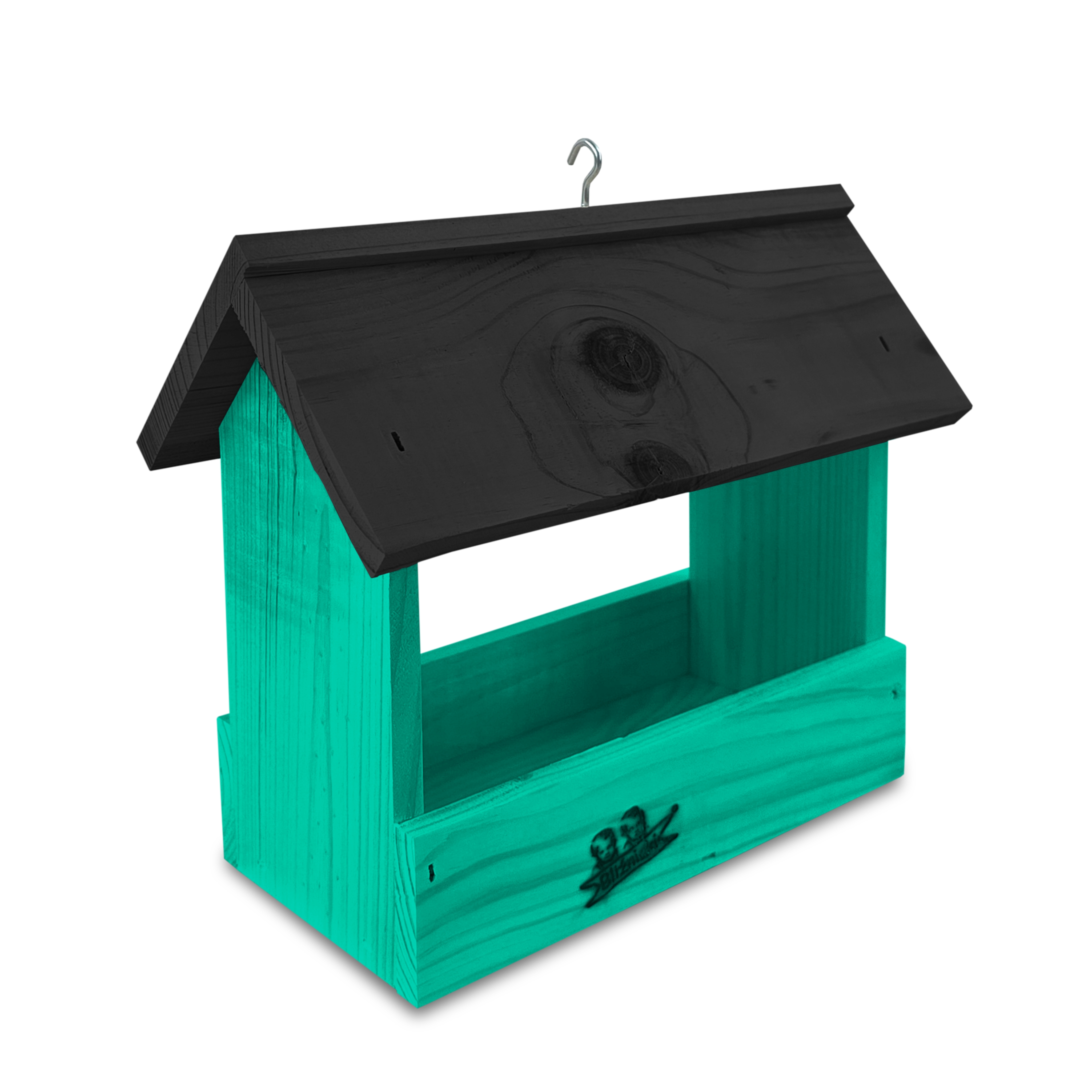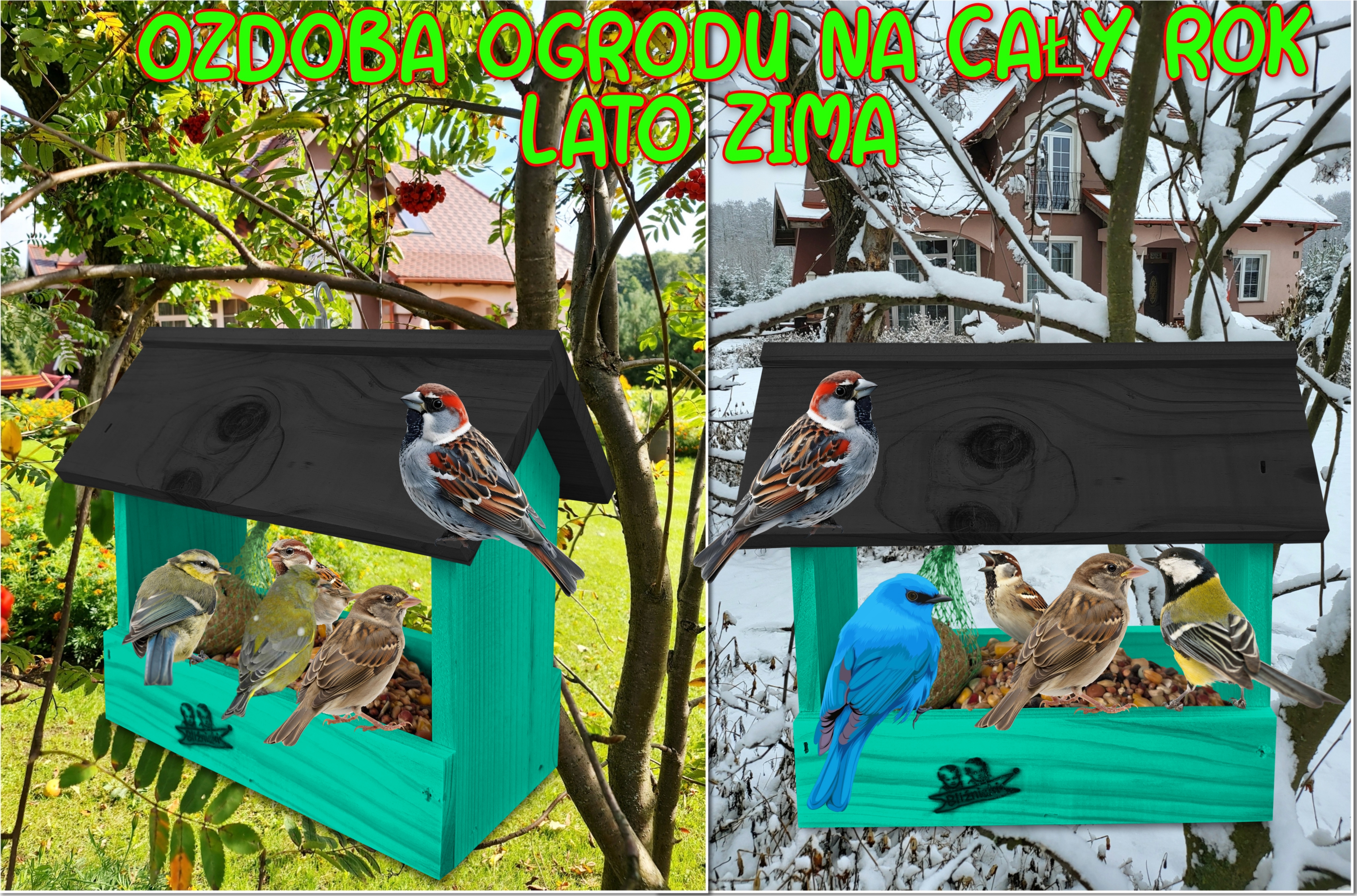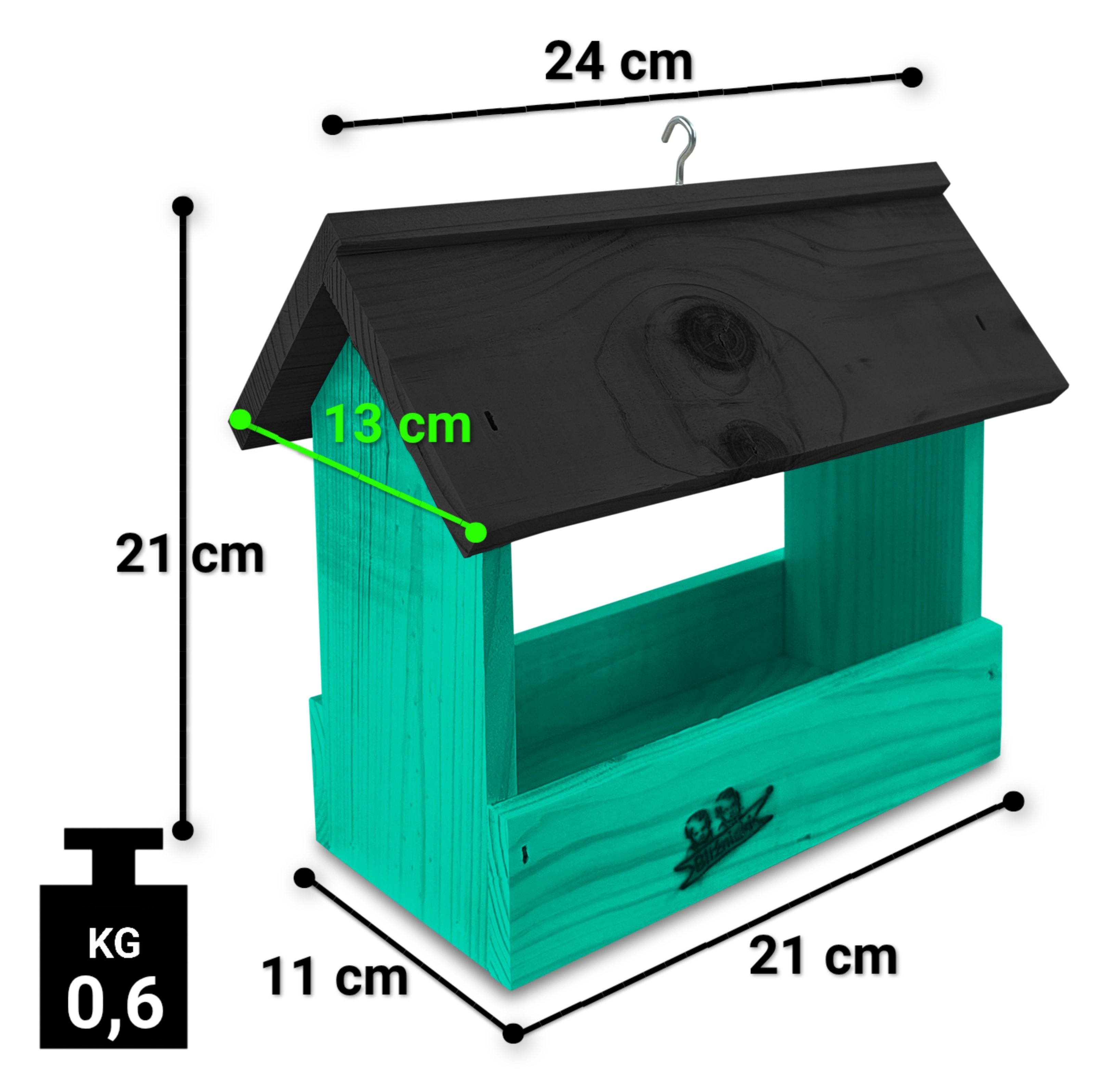 - Karmnik wykonany jest w całości z drewna iglastego, KOLOR MORSKA ZIELEŃ Z CZARNYM DACHEM