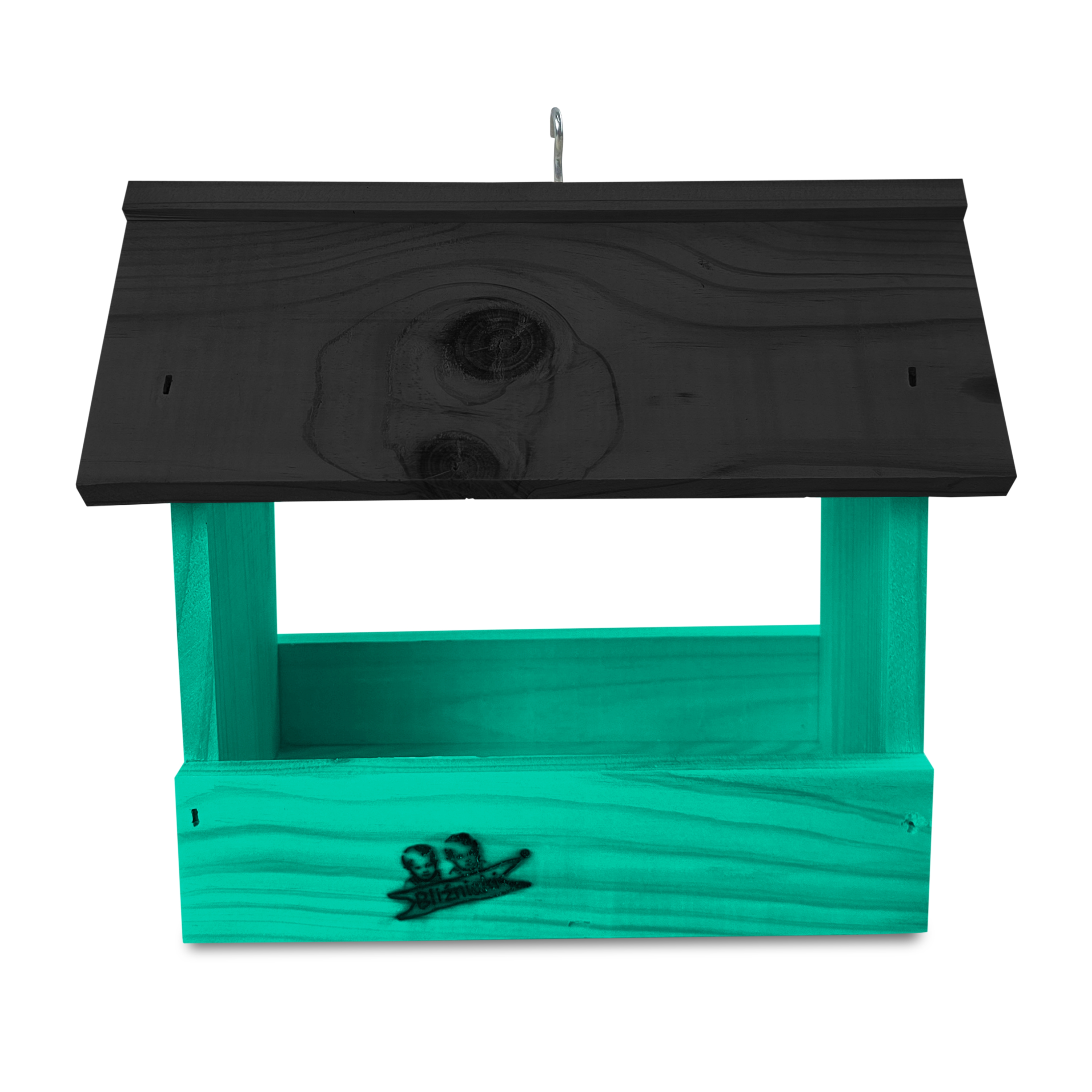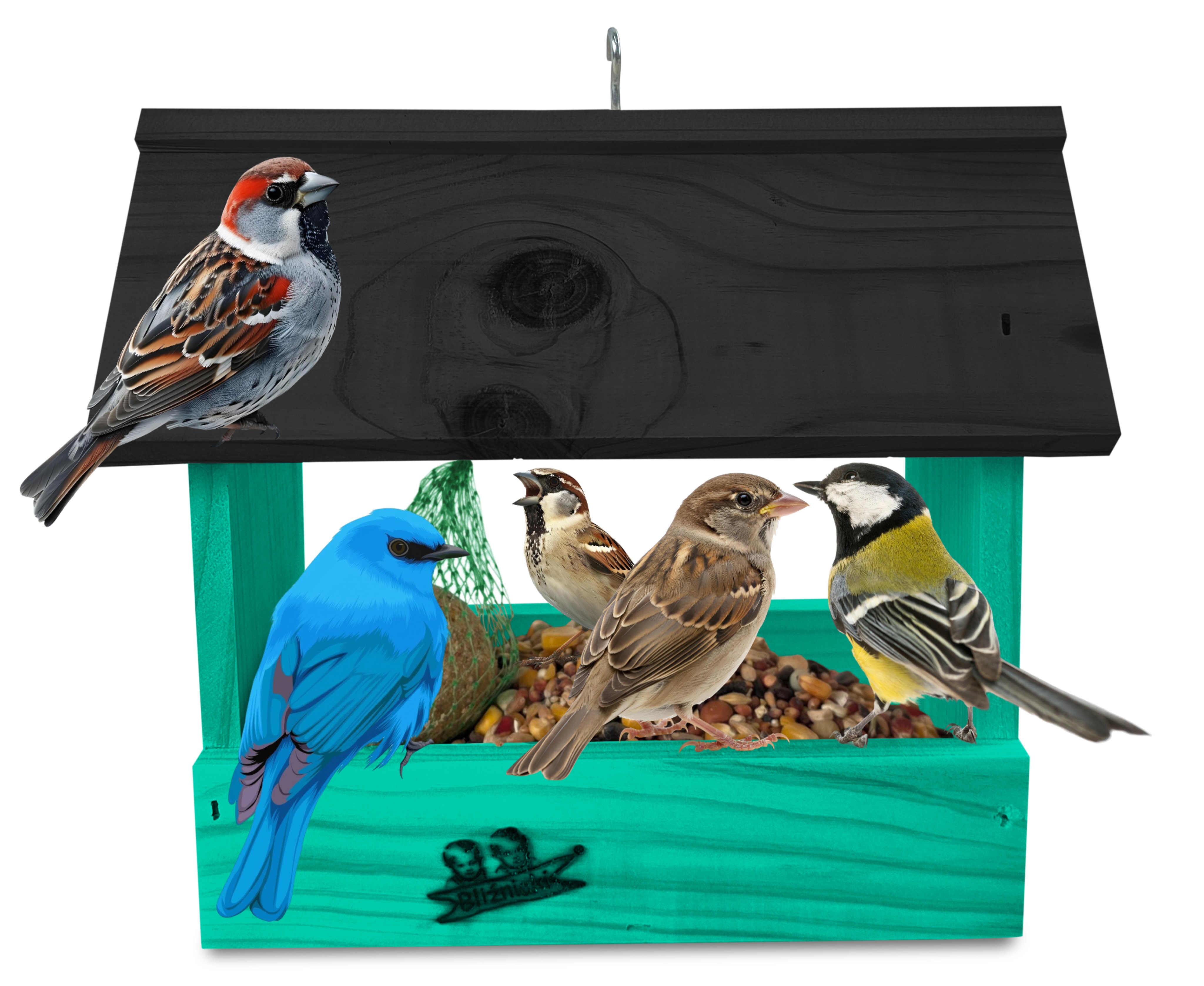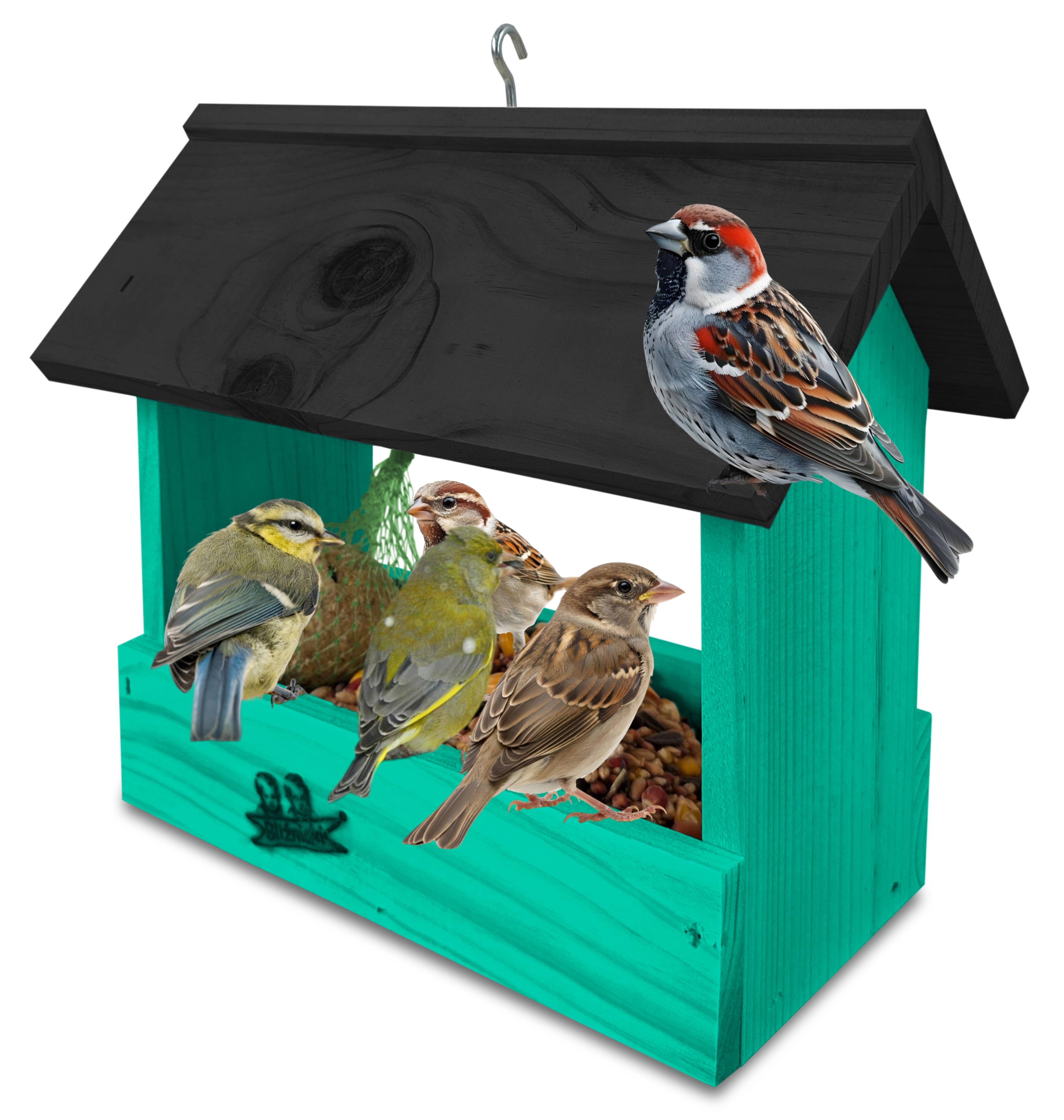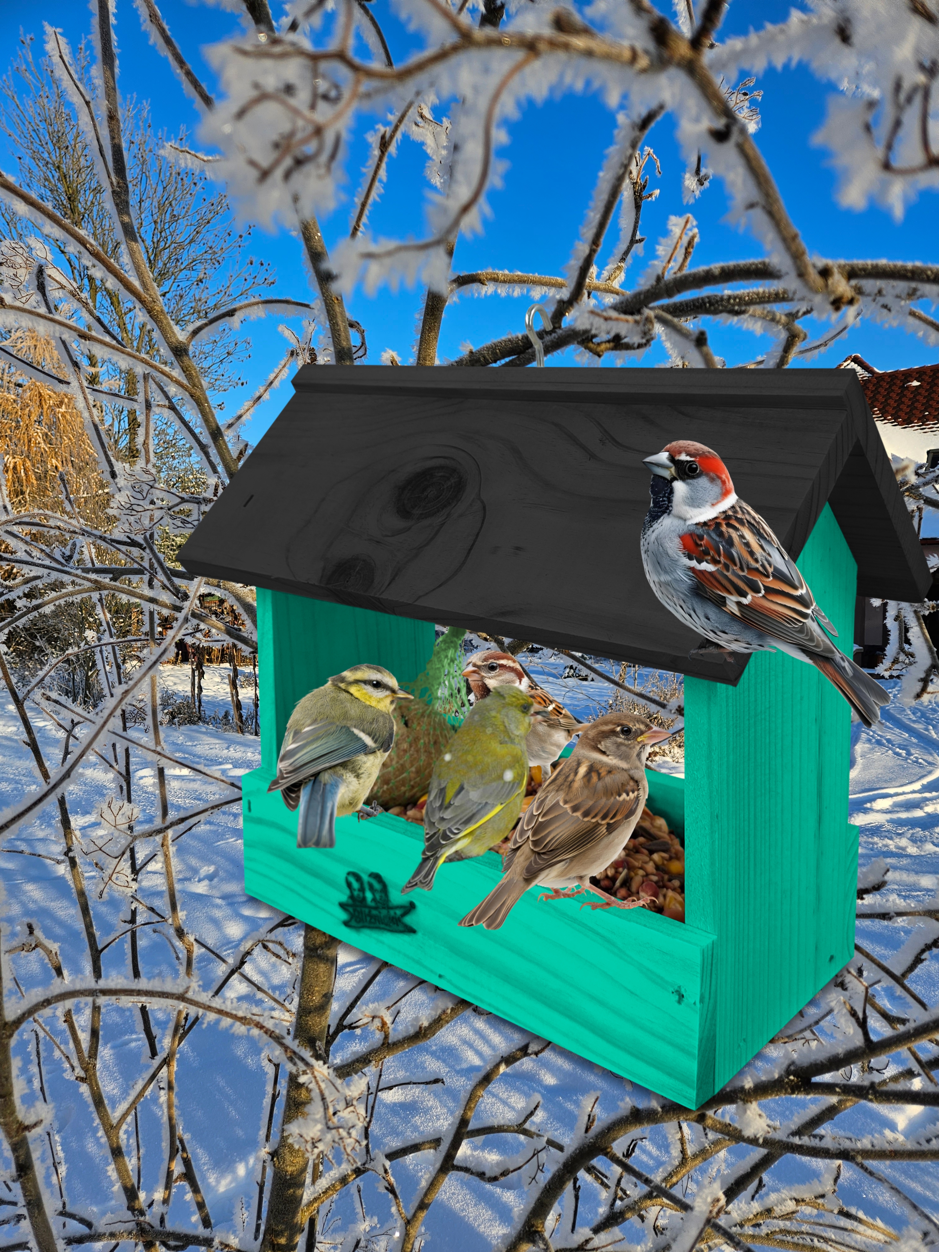 - Karmnik wykonany jest w całości z drewna iglastego, KOLOR MORSKA ZIELEŃ Z CZARNYM DACHEM