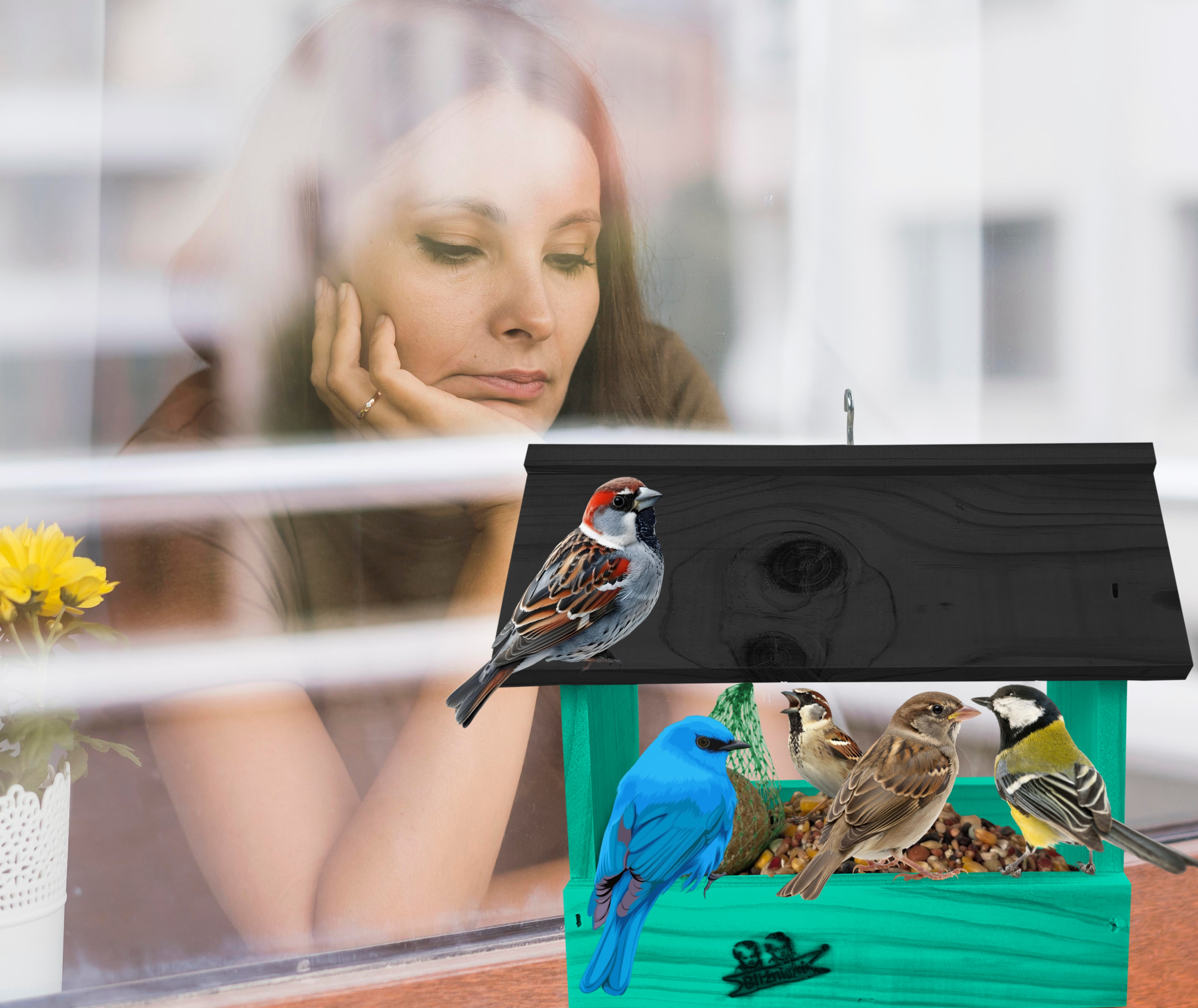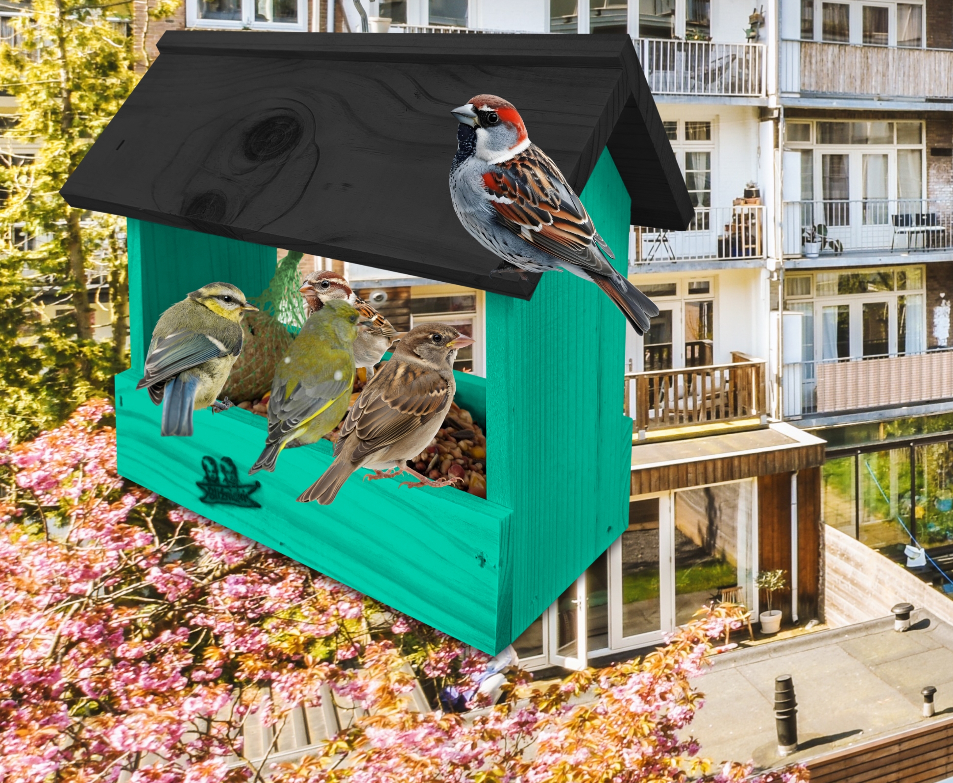 Przedmiotem sprzedaży jest ozdobny drewniany karmnik dla ptaków budka domek na balkon K204 MR CZ kolor morska zieleń z czarnym dachem