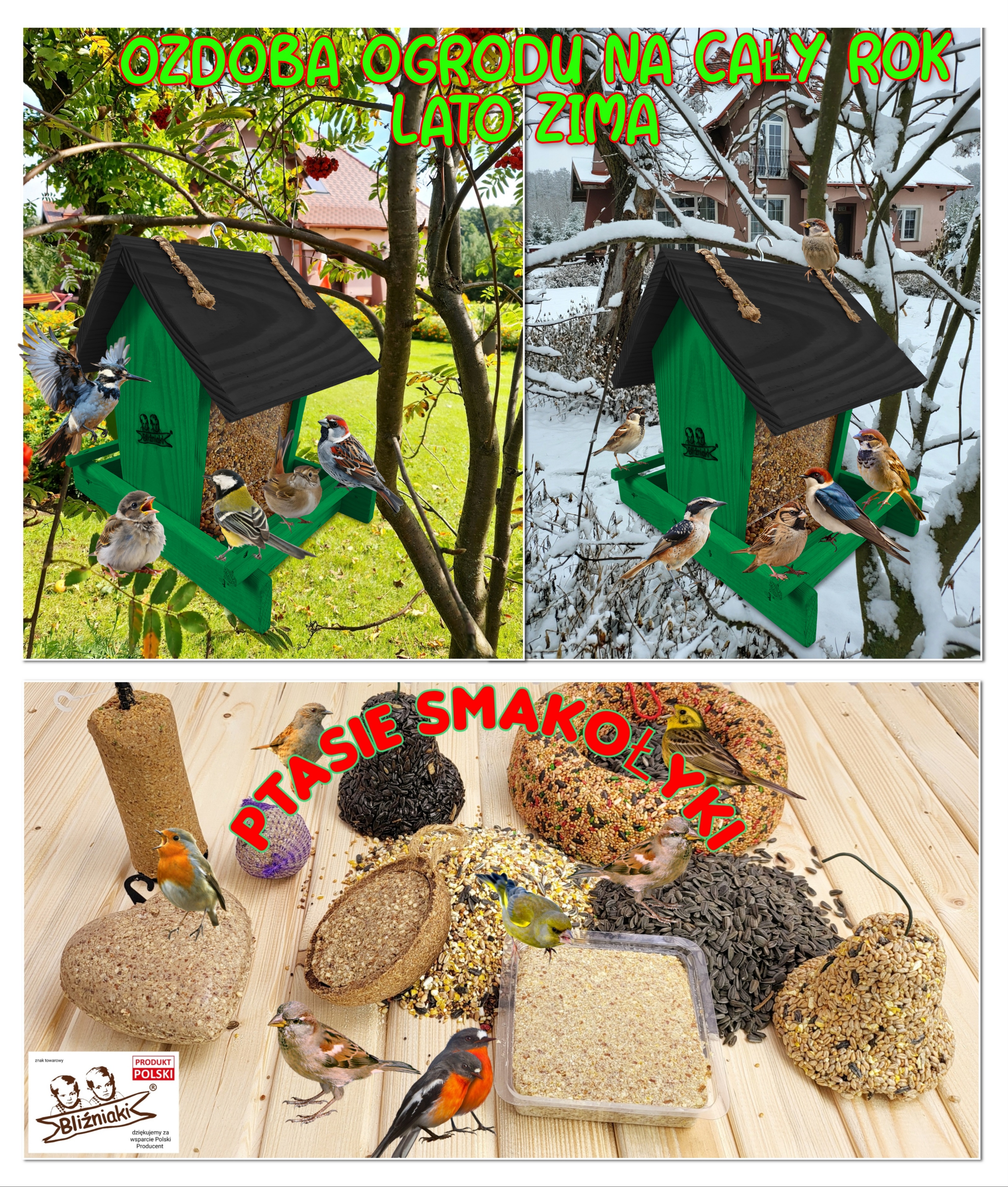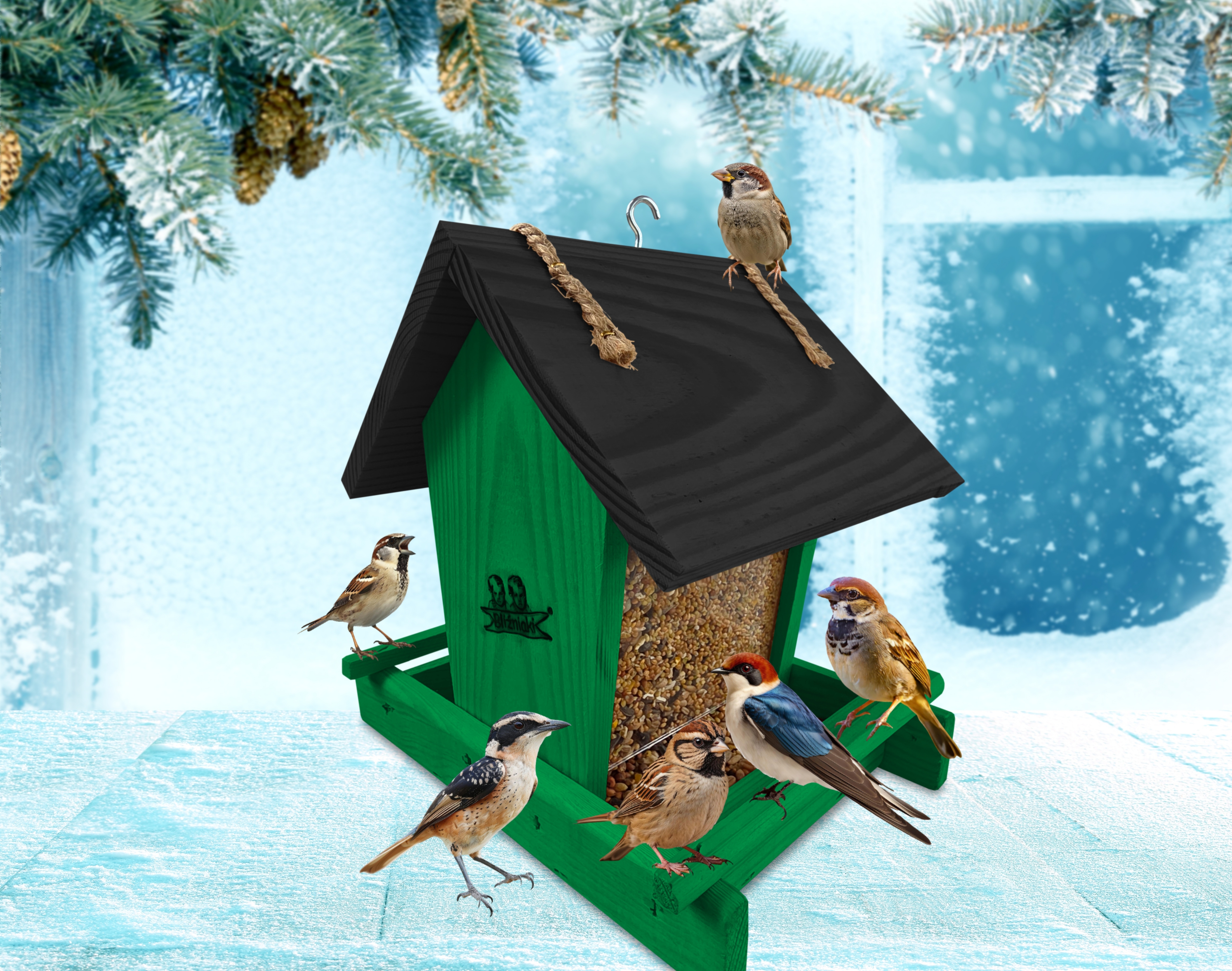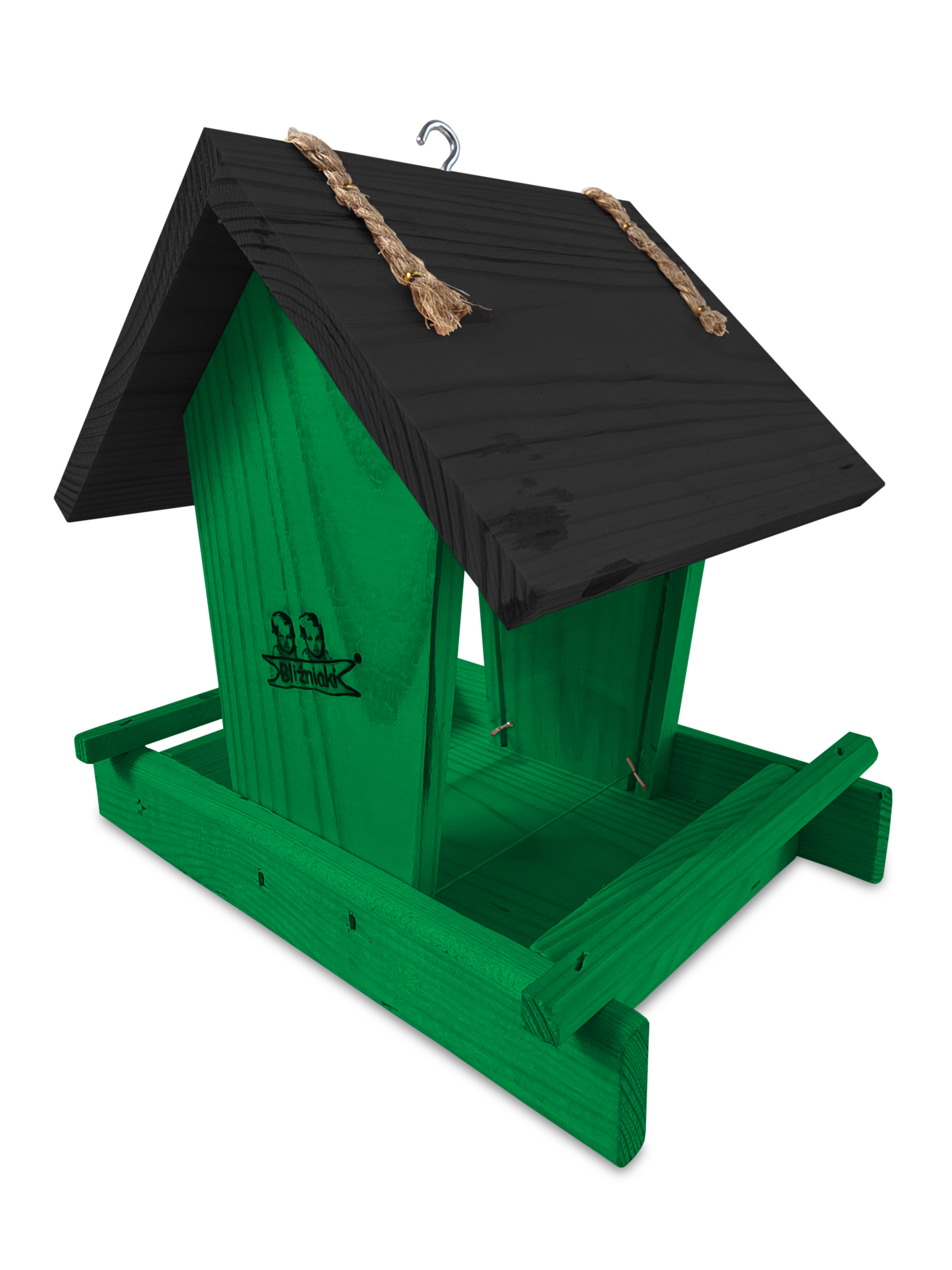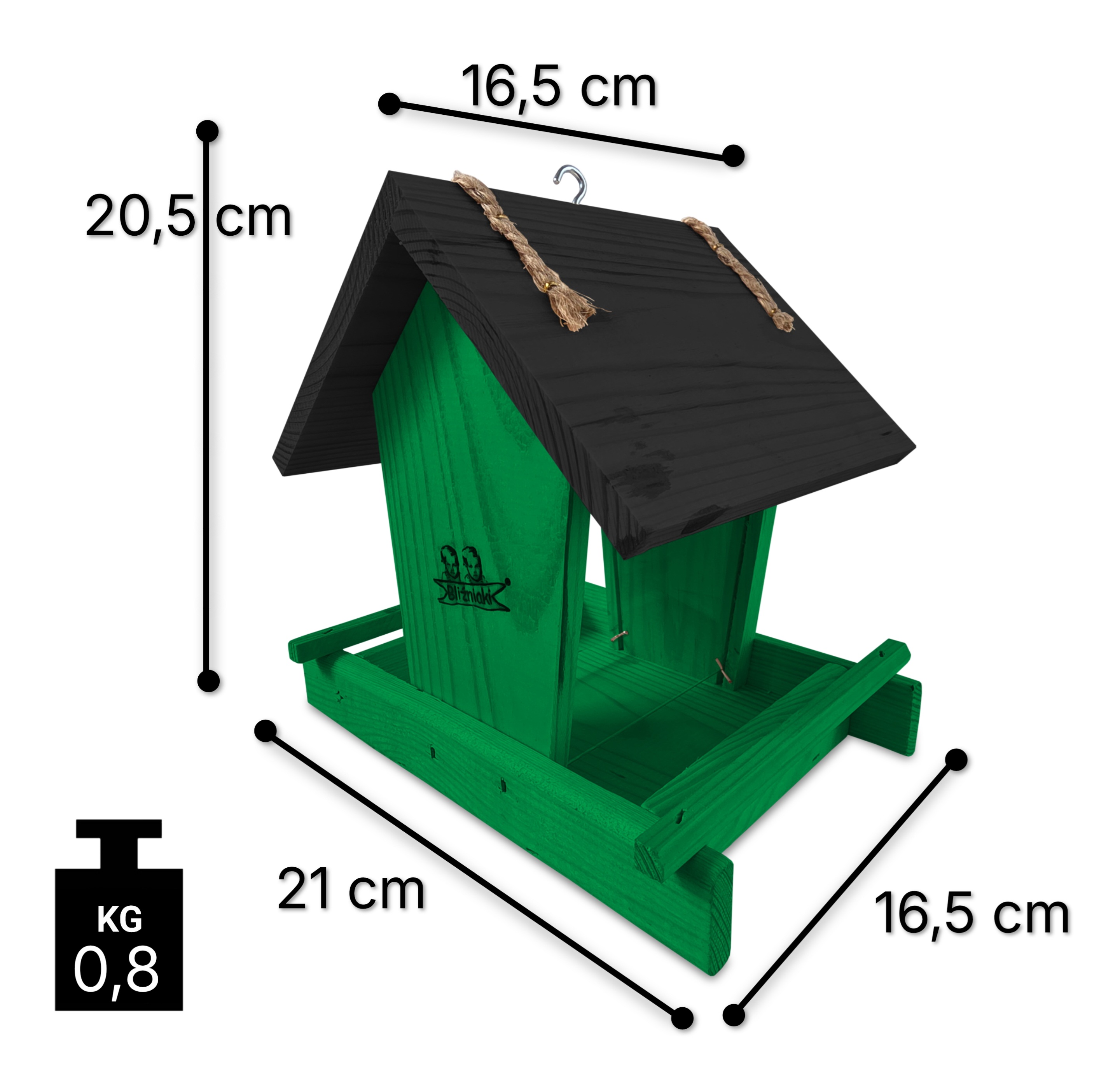 - Karmnik wykonany jest w całości z drewna iglastego, KOLOR CIEMNOZIELONY Z CZARNYM DACHEM