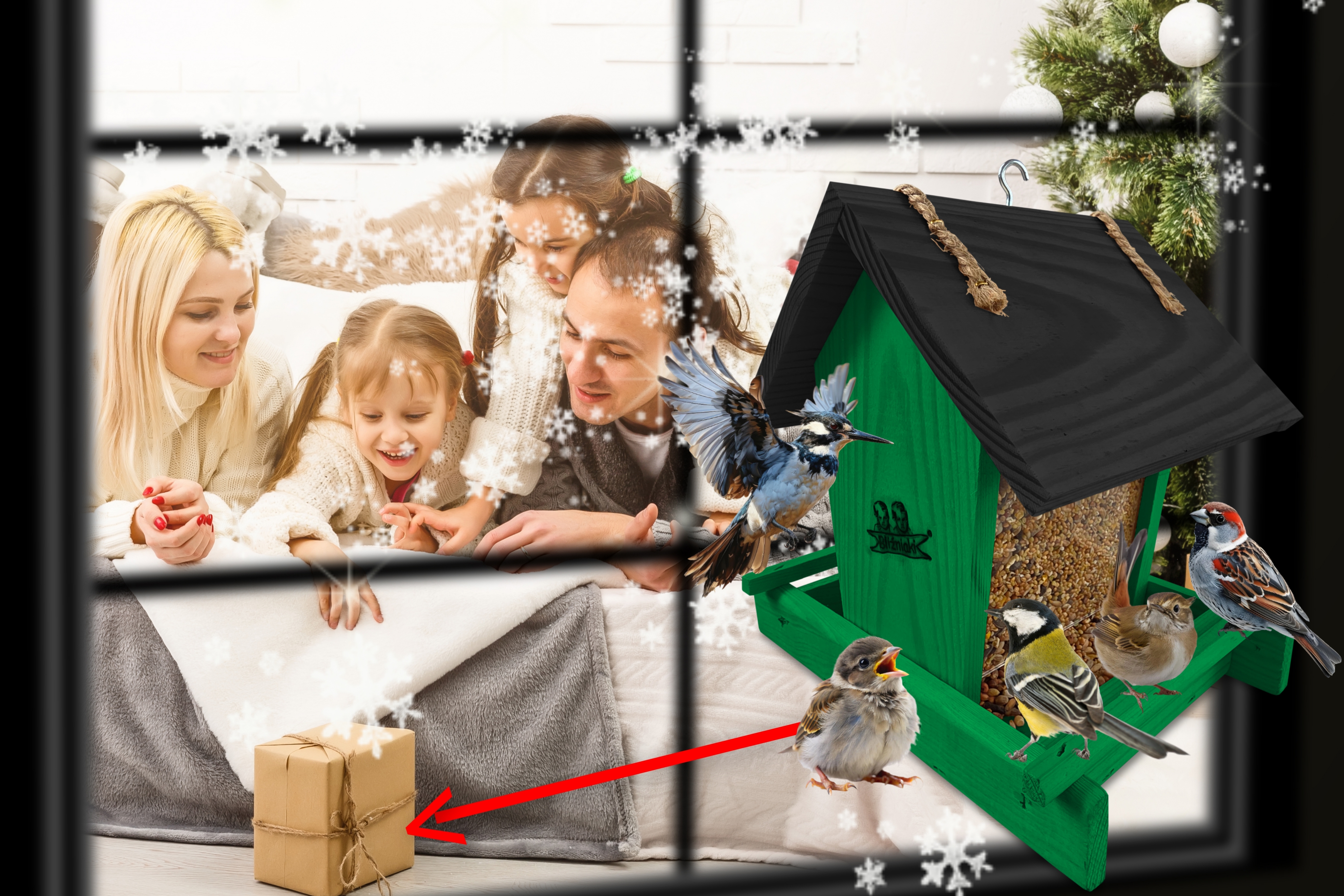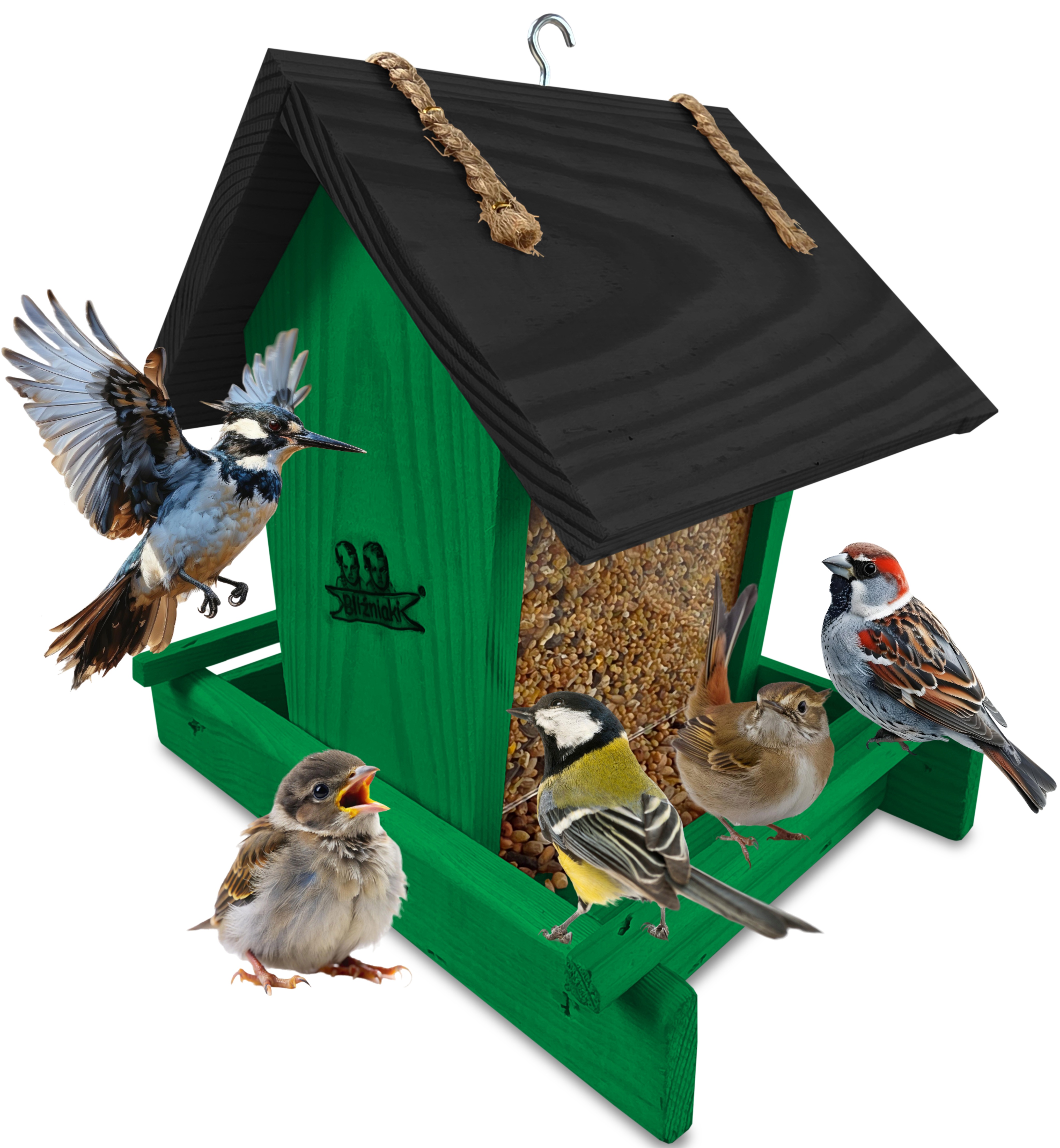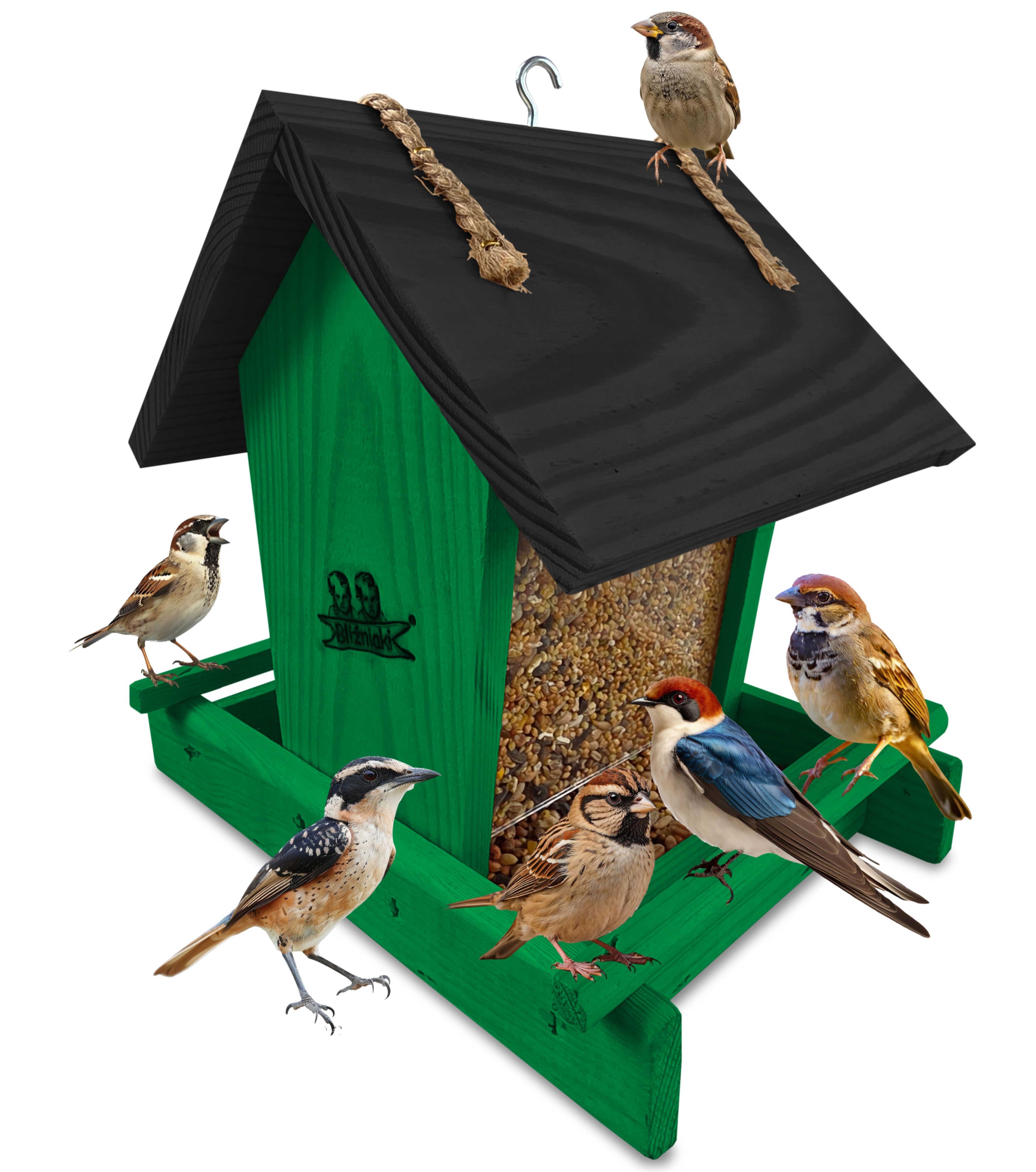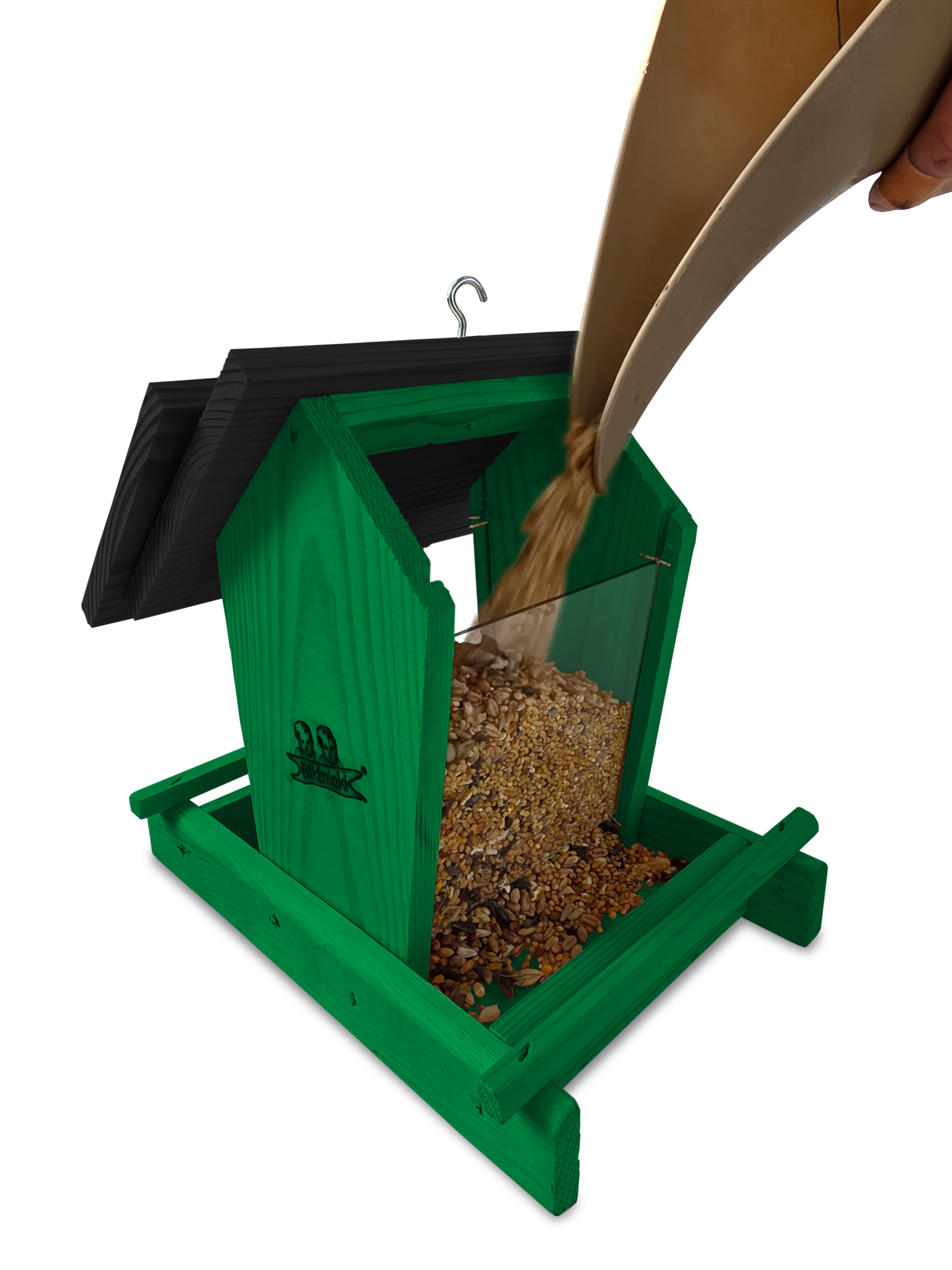 - Karmnik wykonany jest w całości z drewna iglastego, KOLOR CIEMNOZIELONY Z CZARNYM DACHEM