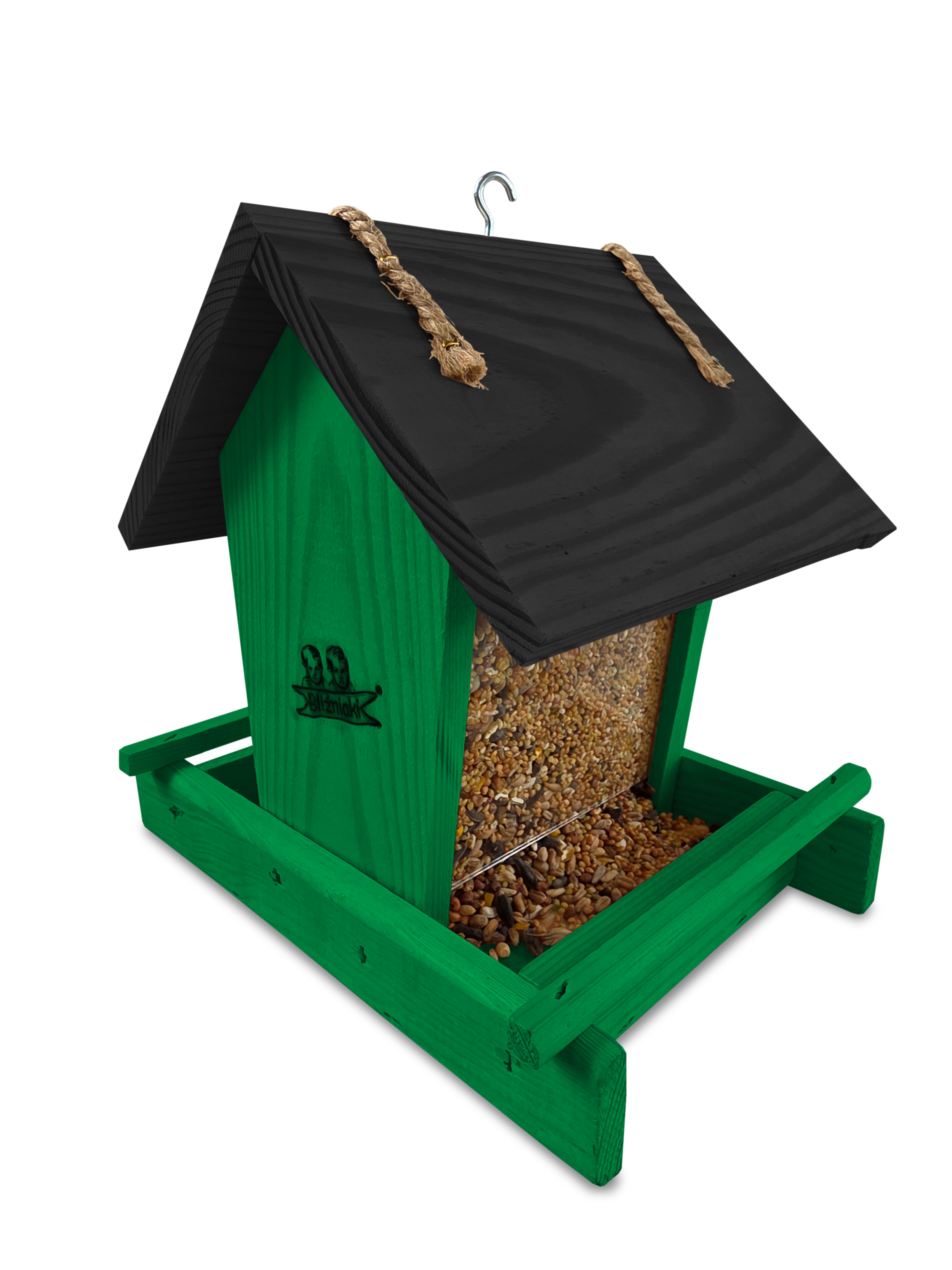 Przedmiotem sprzedaży jest ozdobny drewniany karmnik dla ptaków z dozownikiem ziarna model K29 K CZ kolor ciemnozielony z czarnym dachem