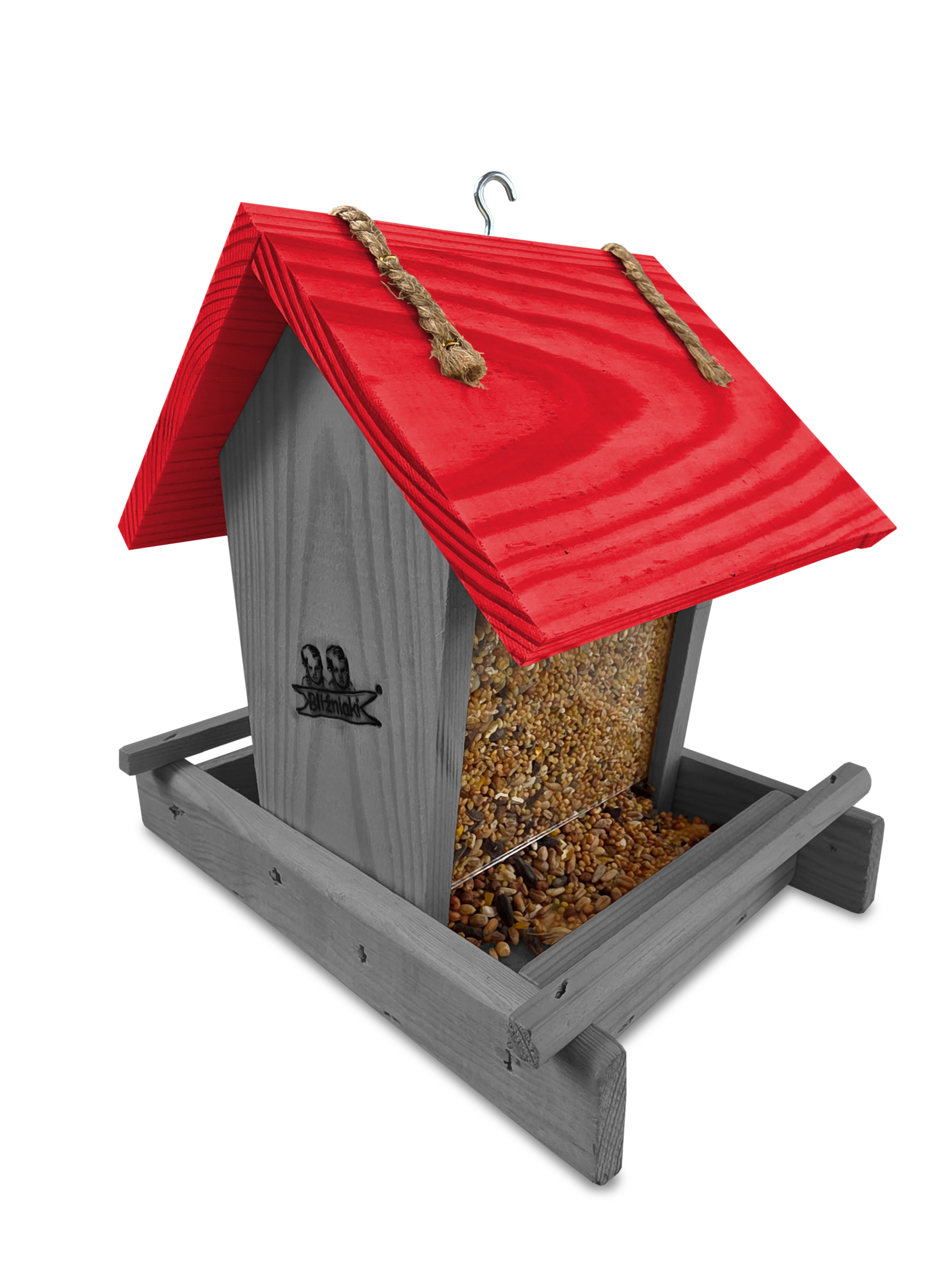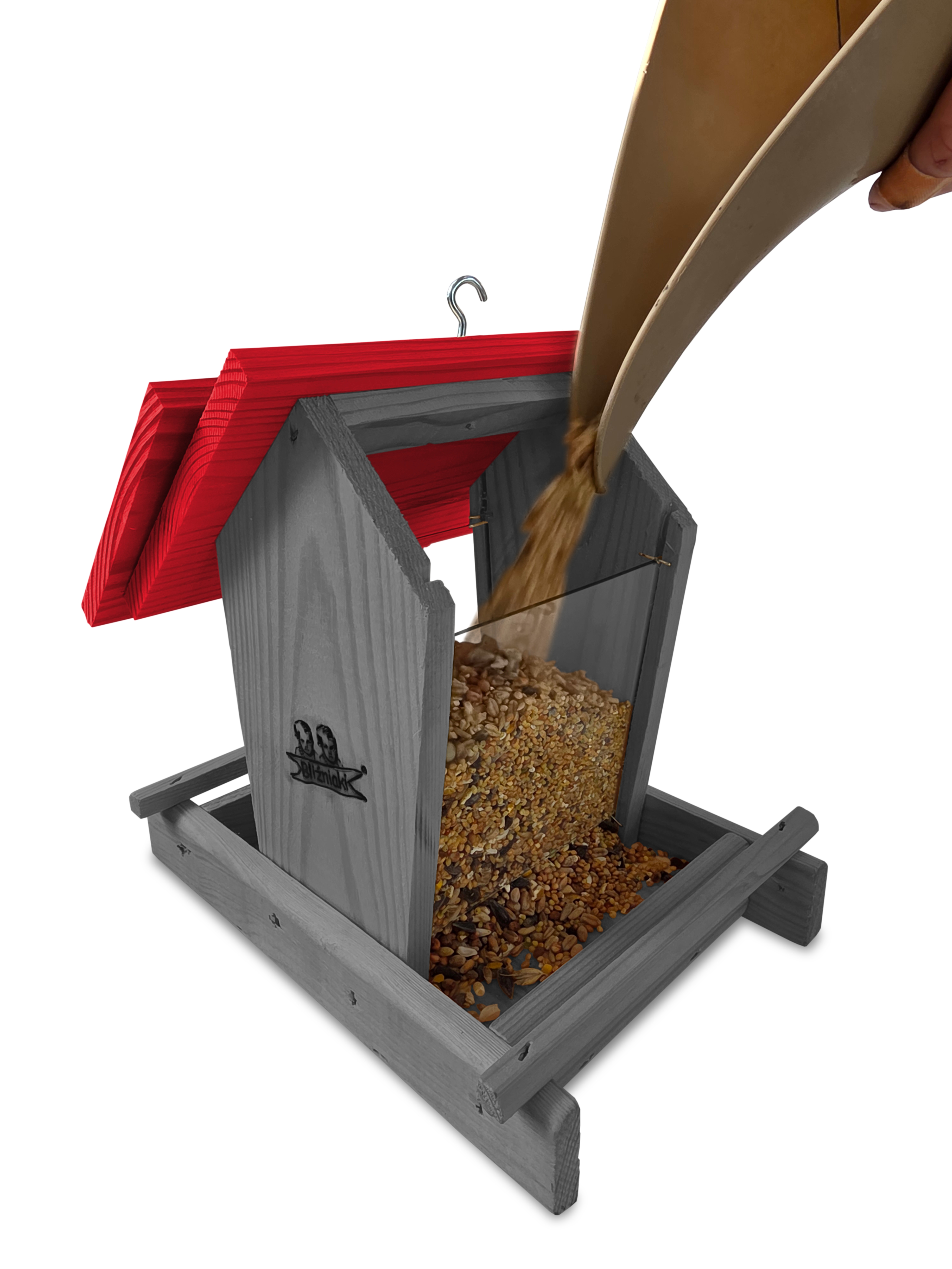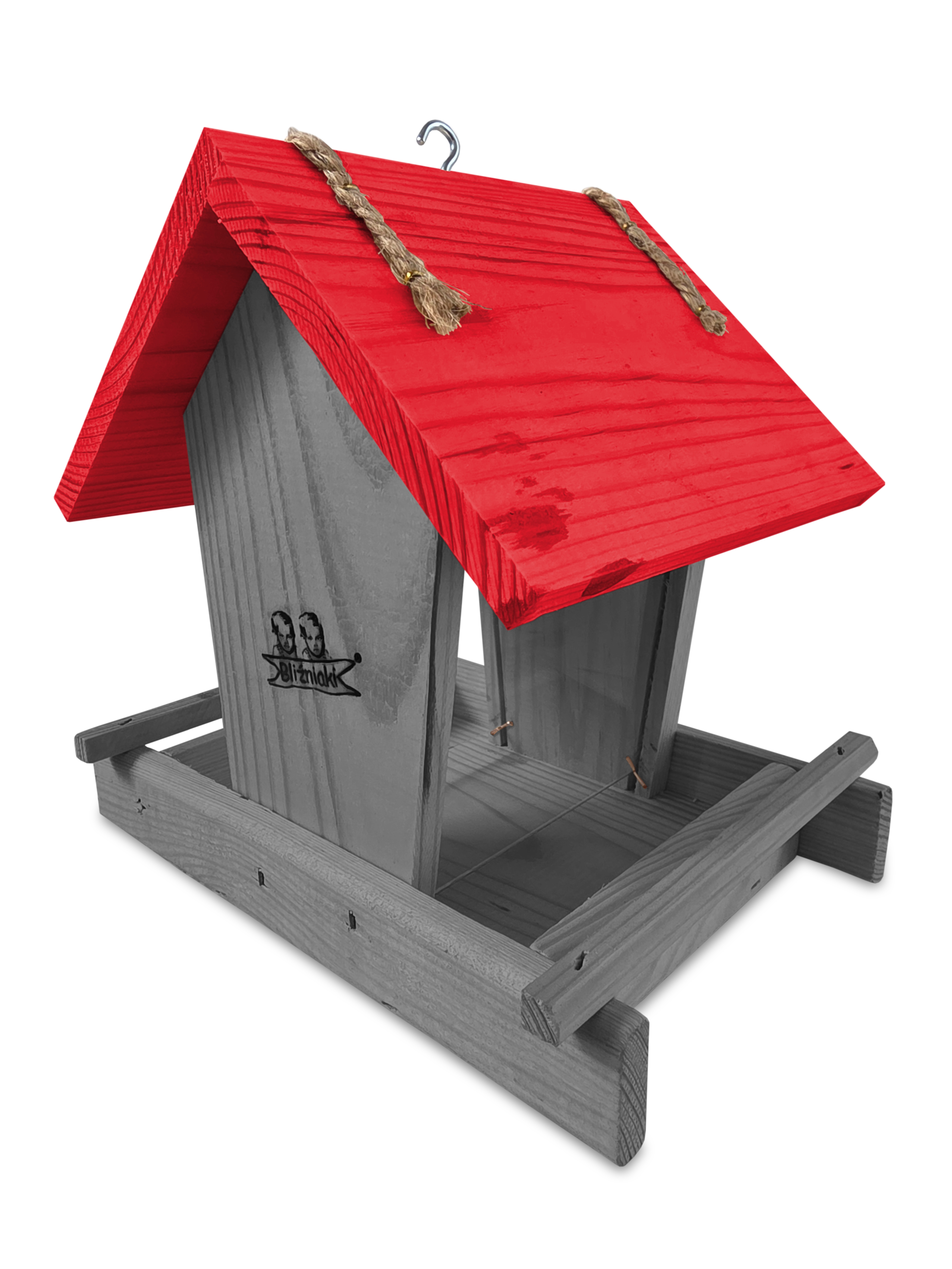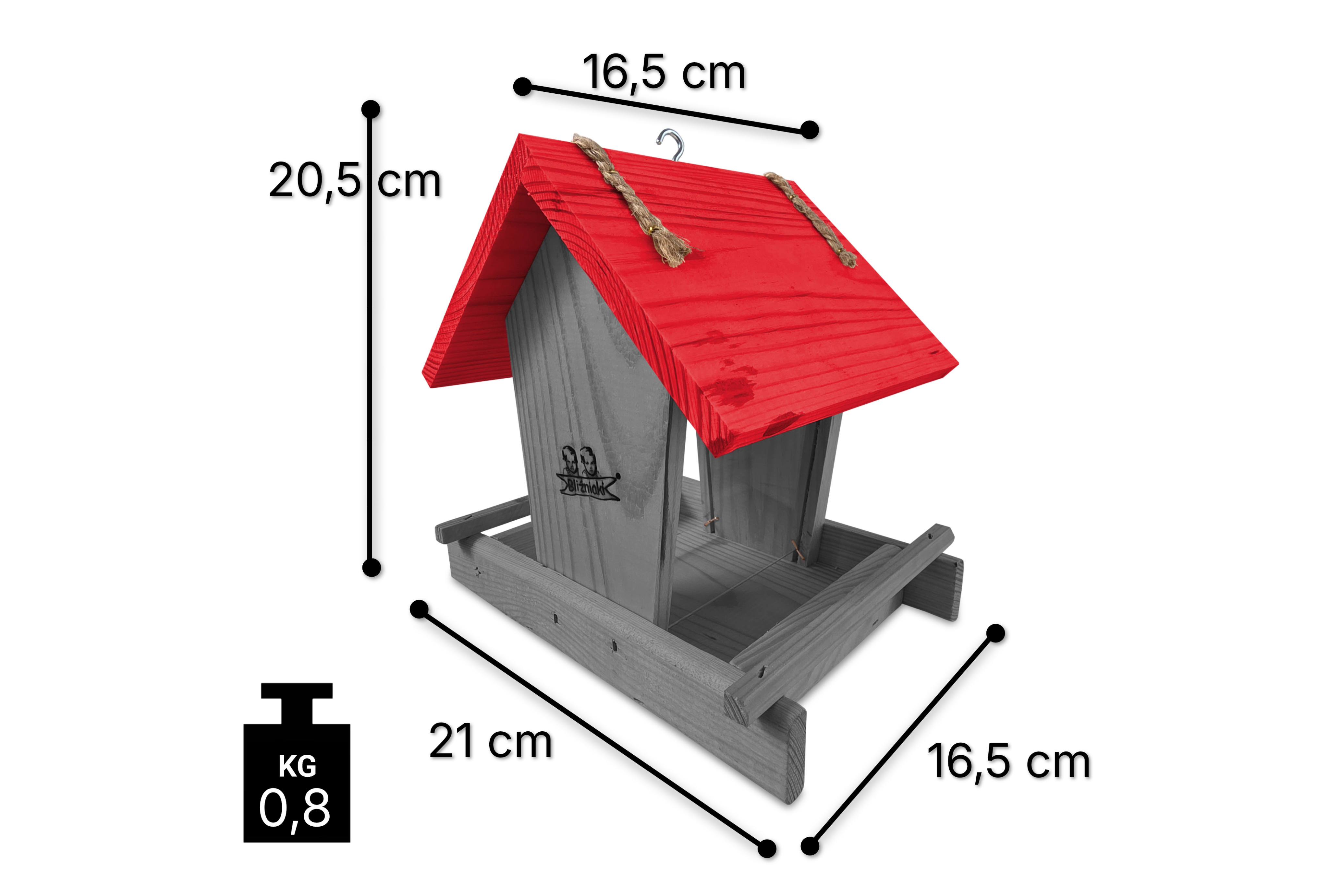 - Karmnik wykonany jest w całości z drewna iglastego, KOLOR CIEMNOSZARY Z CZERWONYM DACHEM