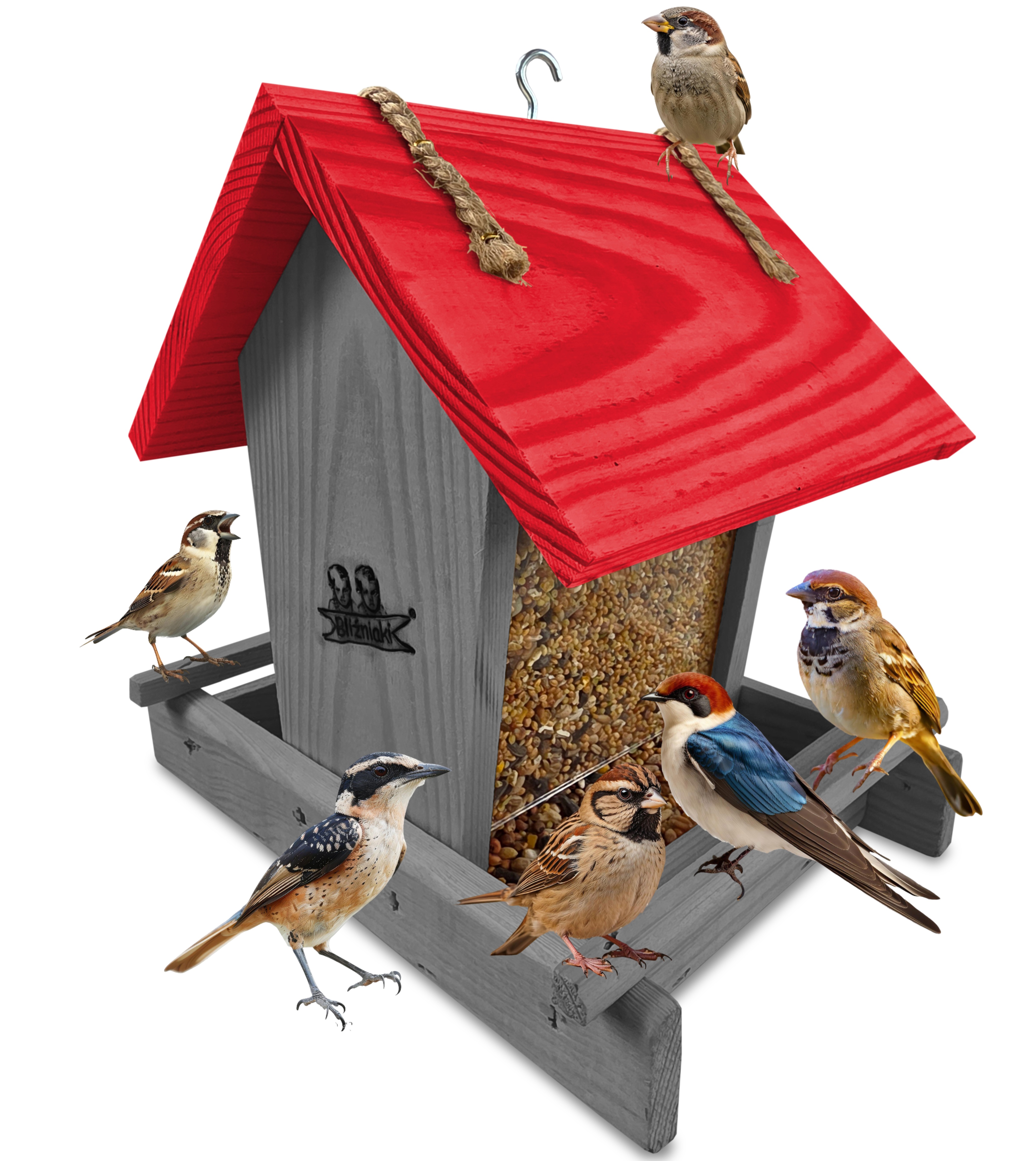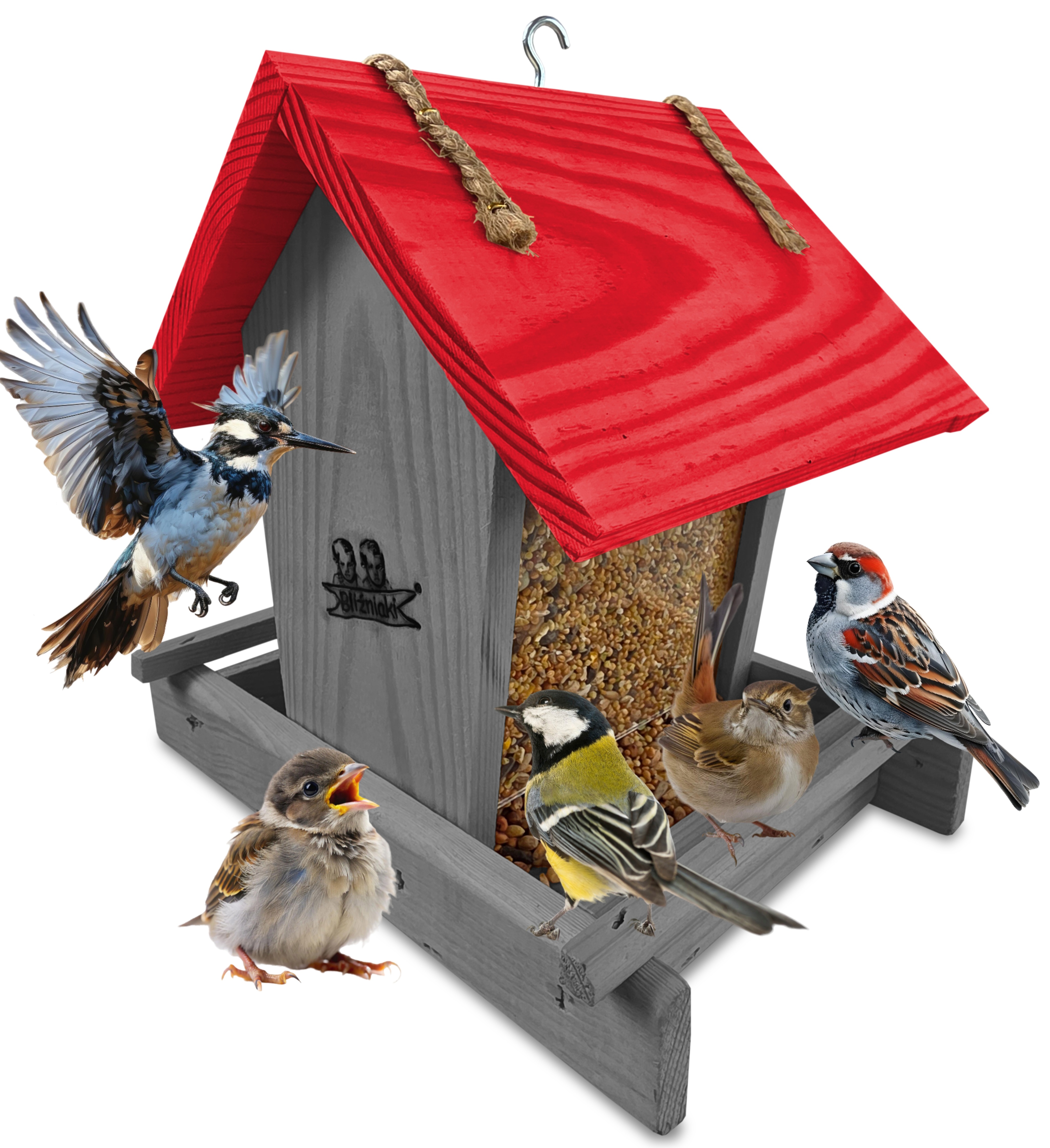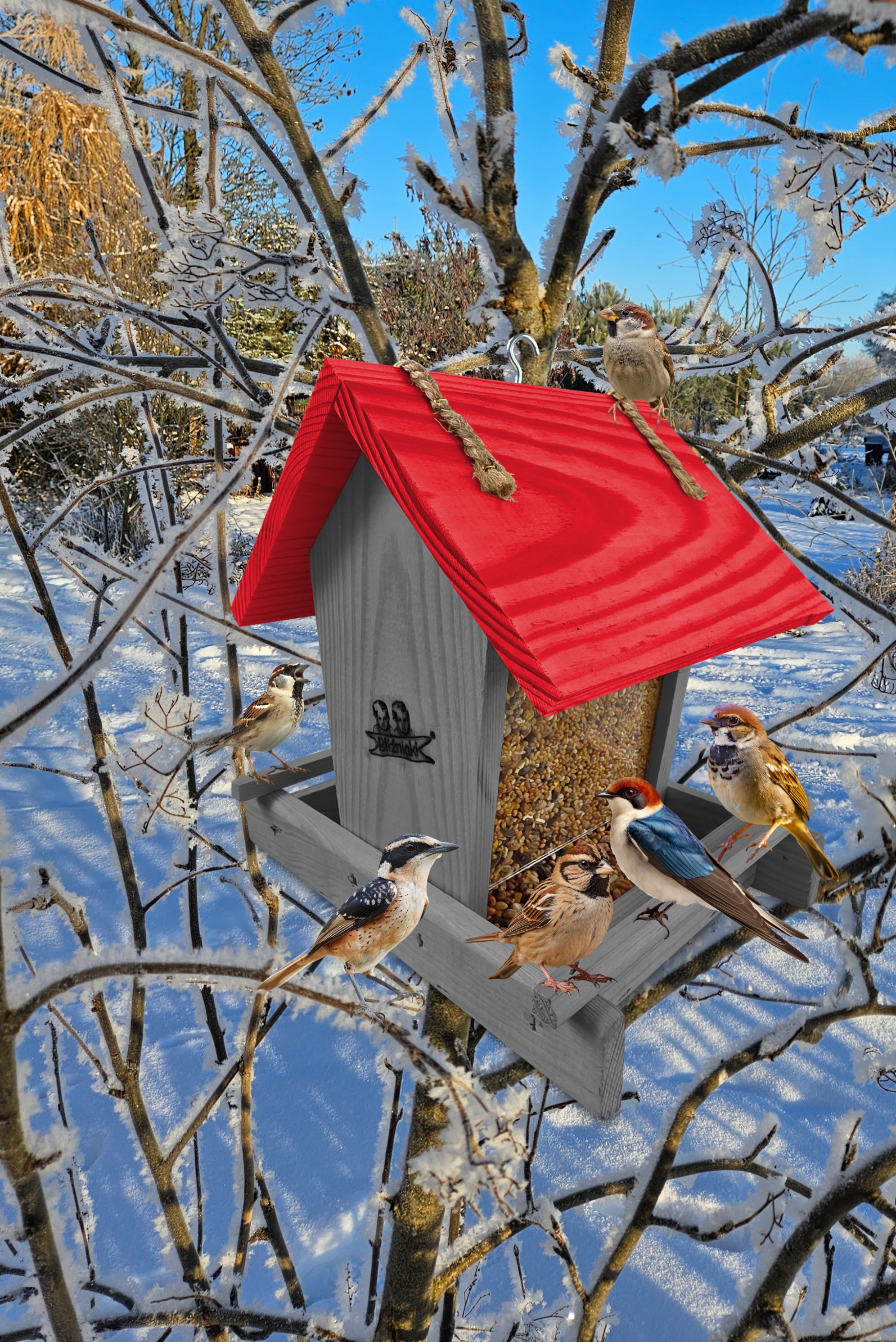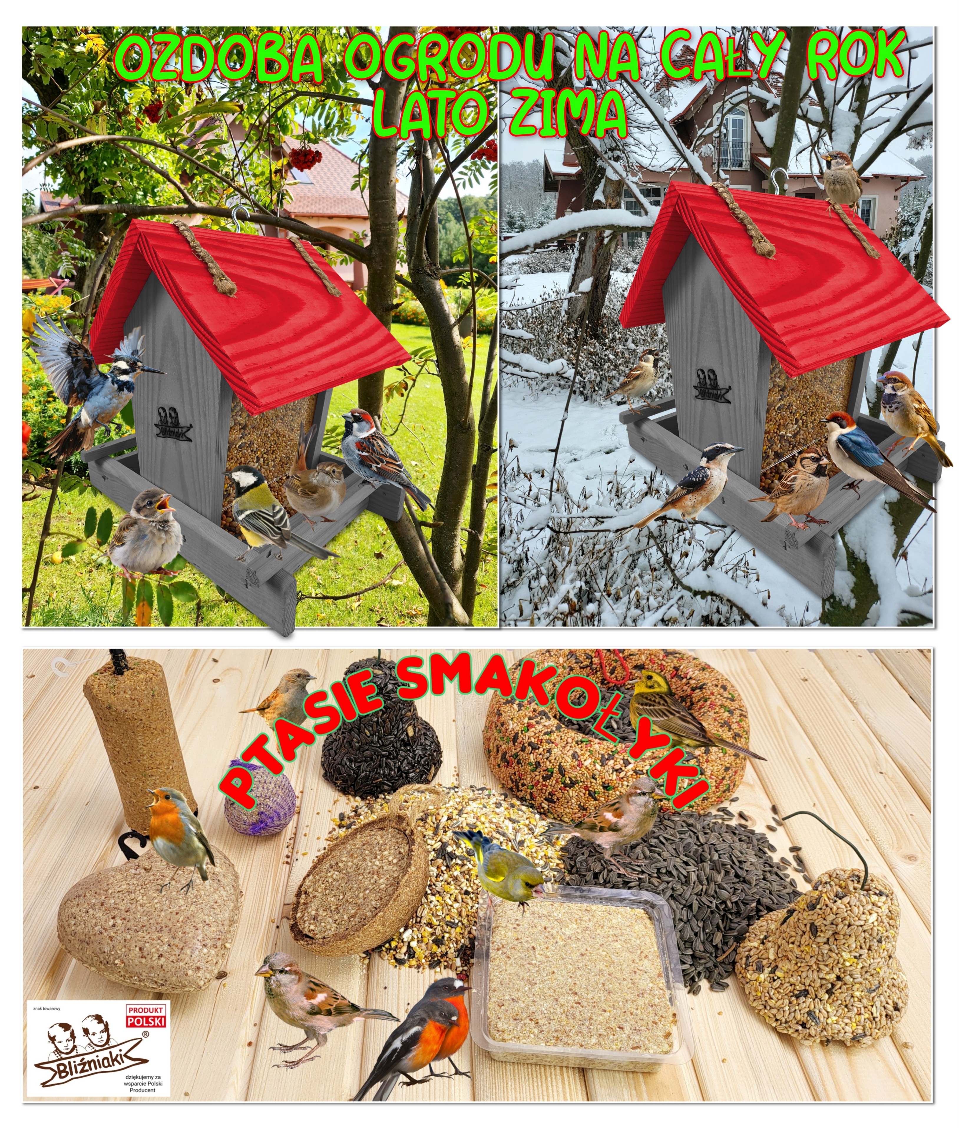 - Karmnik wykonany jest w całości z drewna iglastego, KOLOR CIEMNOSZARY Z CZERWONYM DACHEM