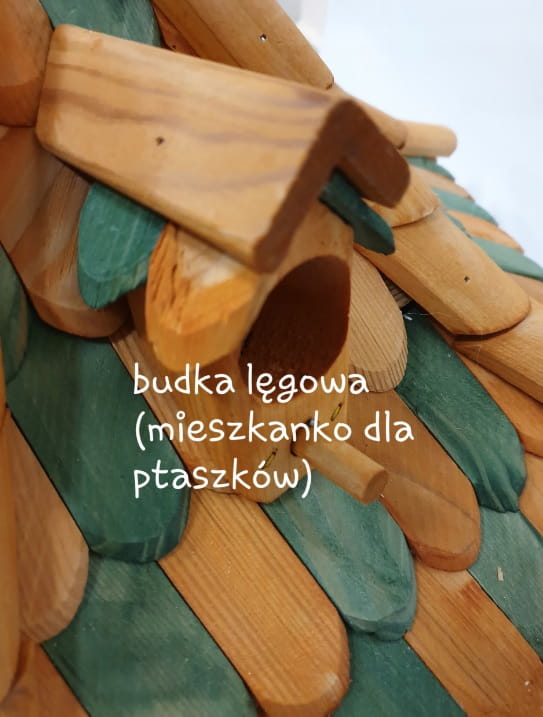 Wytworzony w całości z drewna, dach pokryty jest kolorową dachówką. Całość wykonana jest bardzo starannie i z wielką precyzją. Dodatkowo wyposażony jest w budkę lęgową, gdzie ptaki mogą stworzyć gniazdo.