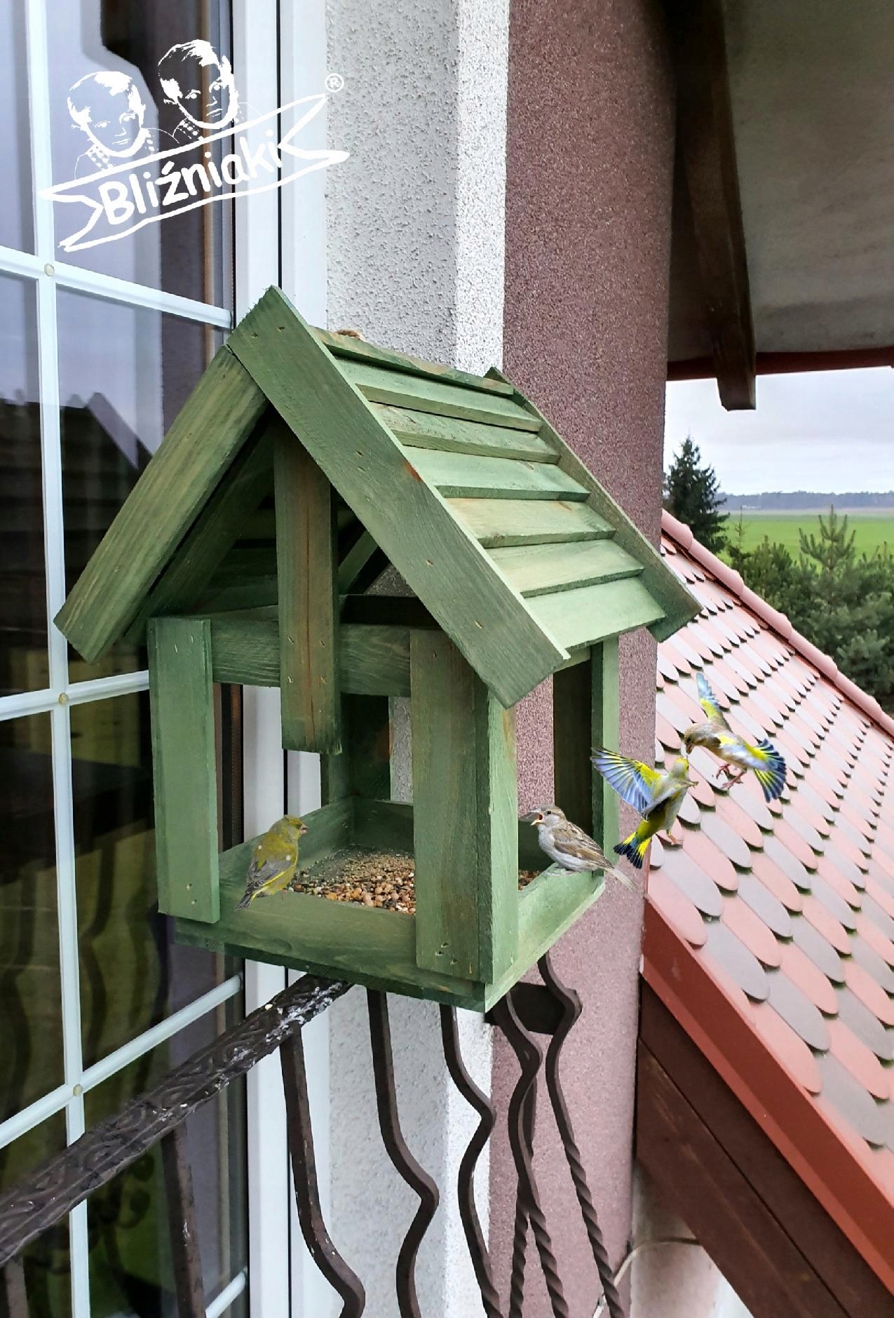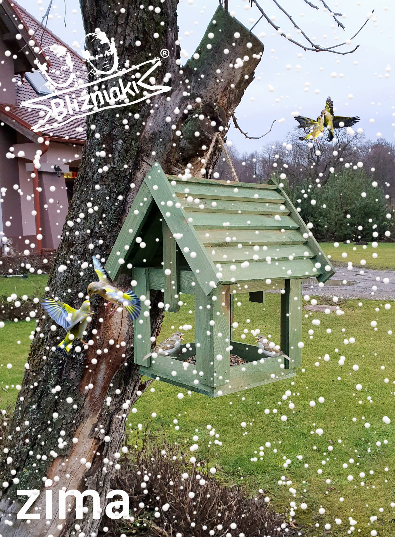 - Posiada szeroki dach chroniący karmę przed deszczem oraz innymi czynnikami atmosferycznymi