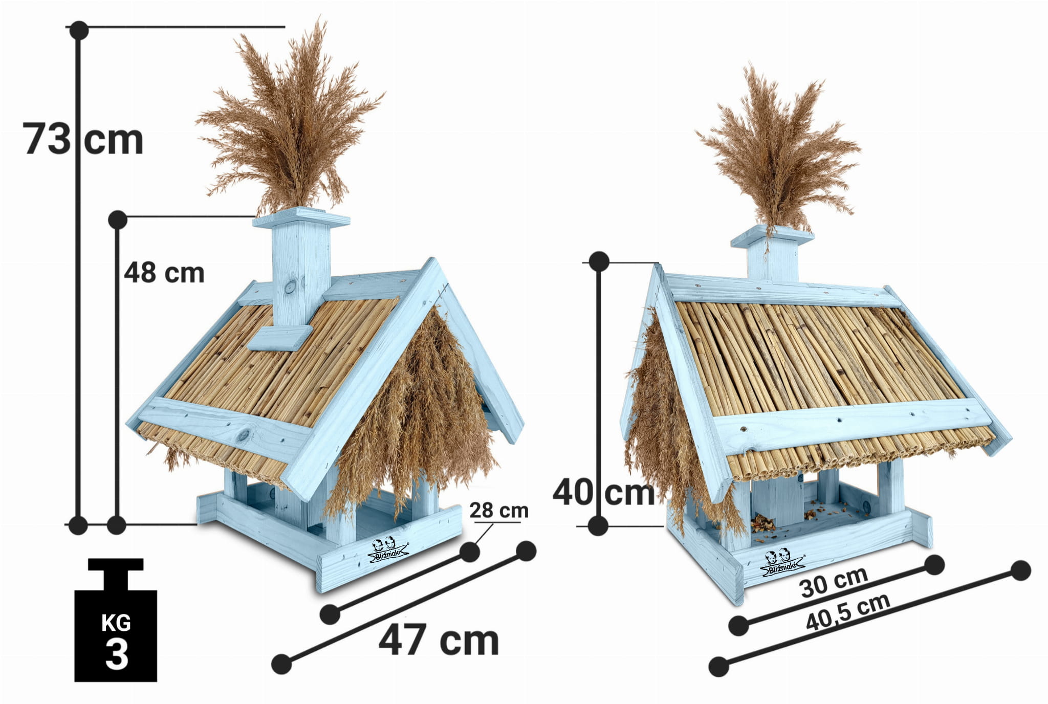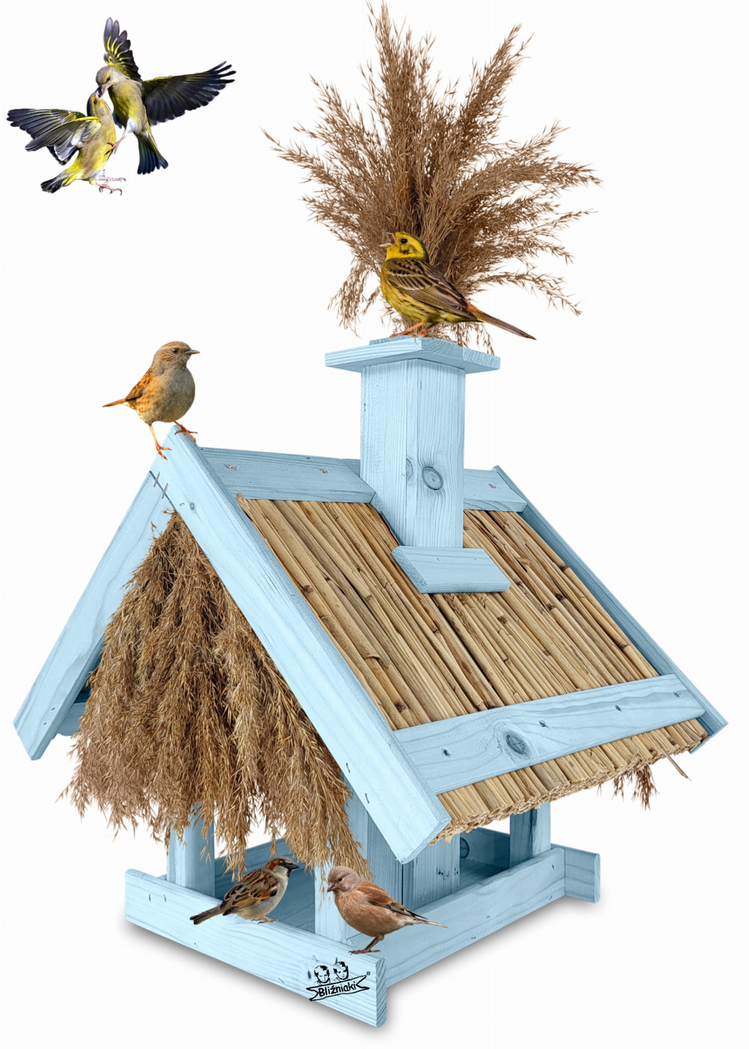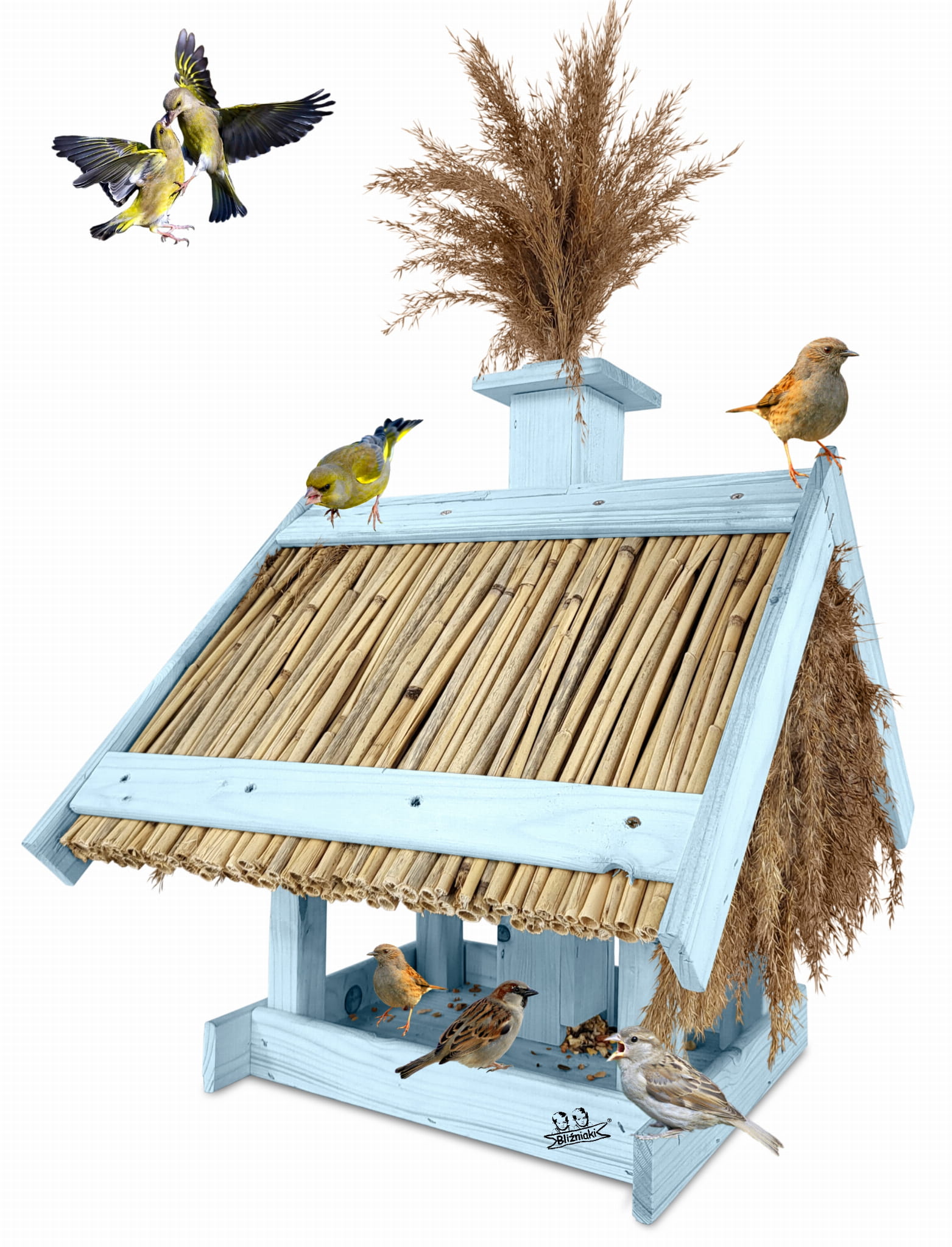 Dach pokryty trzciną, nie tylko zdobi karmnik, ale również chroni pokarm przed zamakaniem i wywiewaniem, a także zapewnia dłuższą świeżość dostarczanego pożywienia.