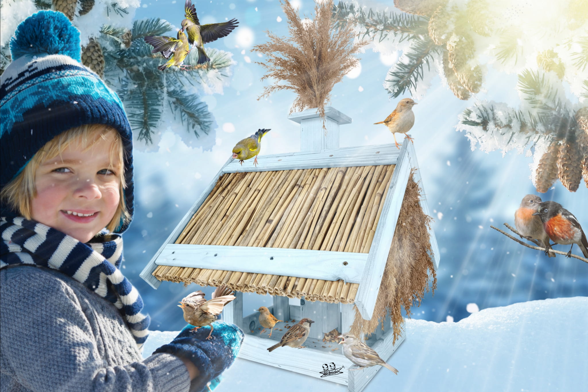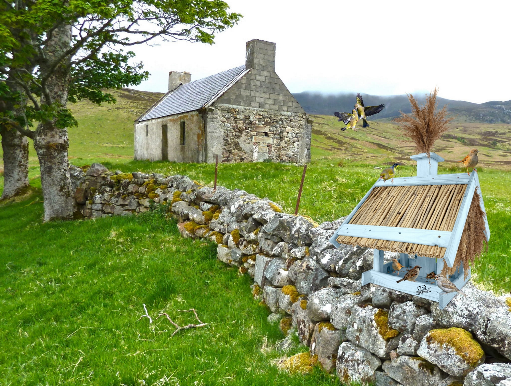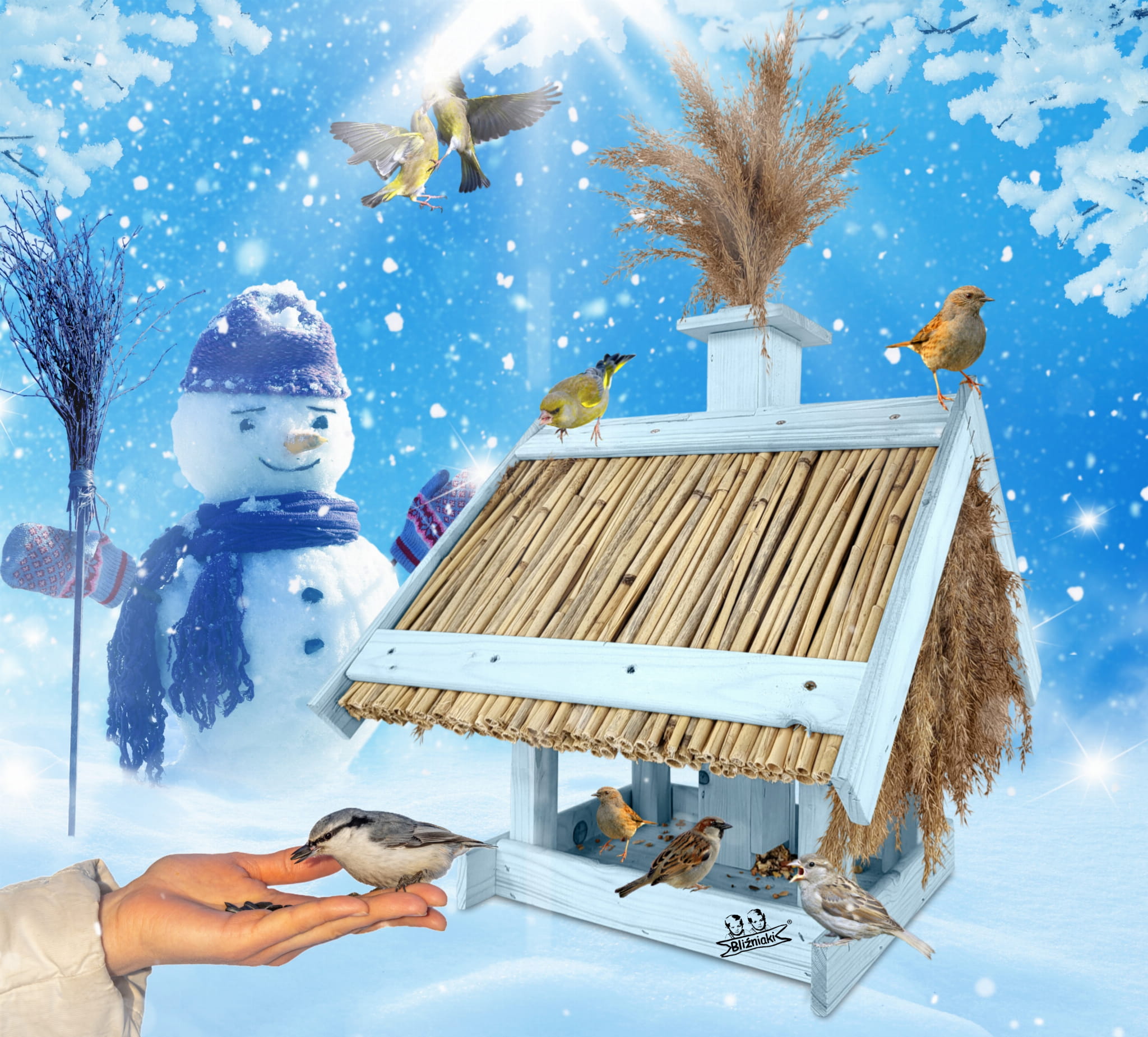 Dach pokryty trzciną, nie tylko zdobi karmnik, ale również chroni pokarm przed zamakaniem i wywiewaniem, a także zapewnia dłuższą świeżość dostarczanego pożywienia.