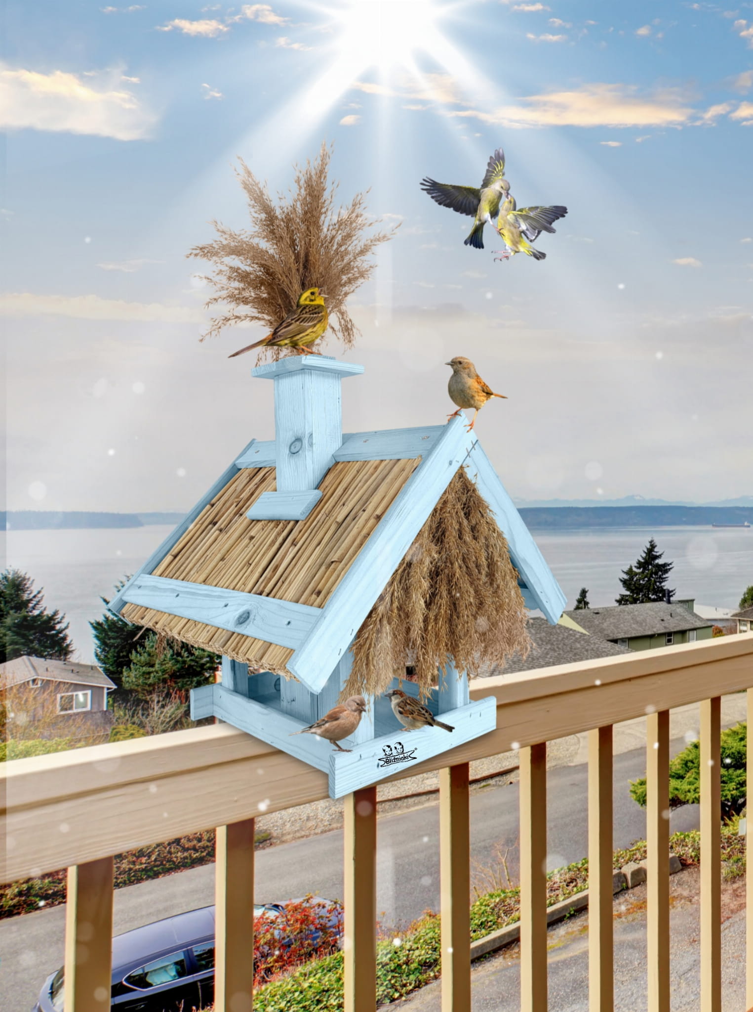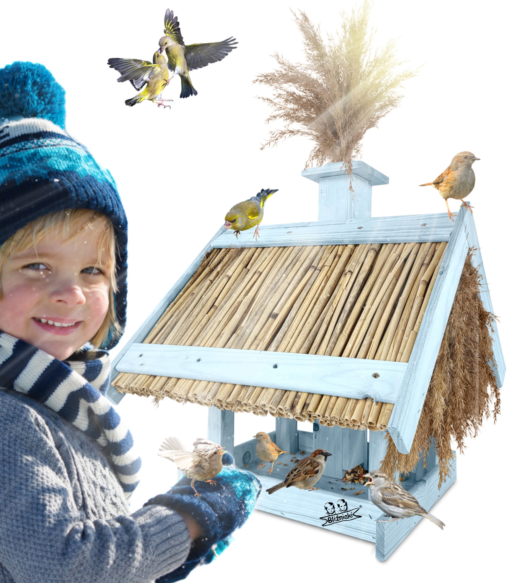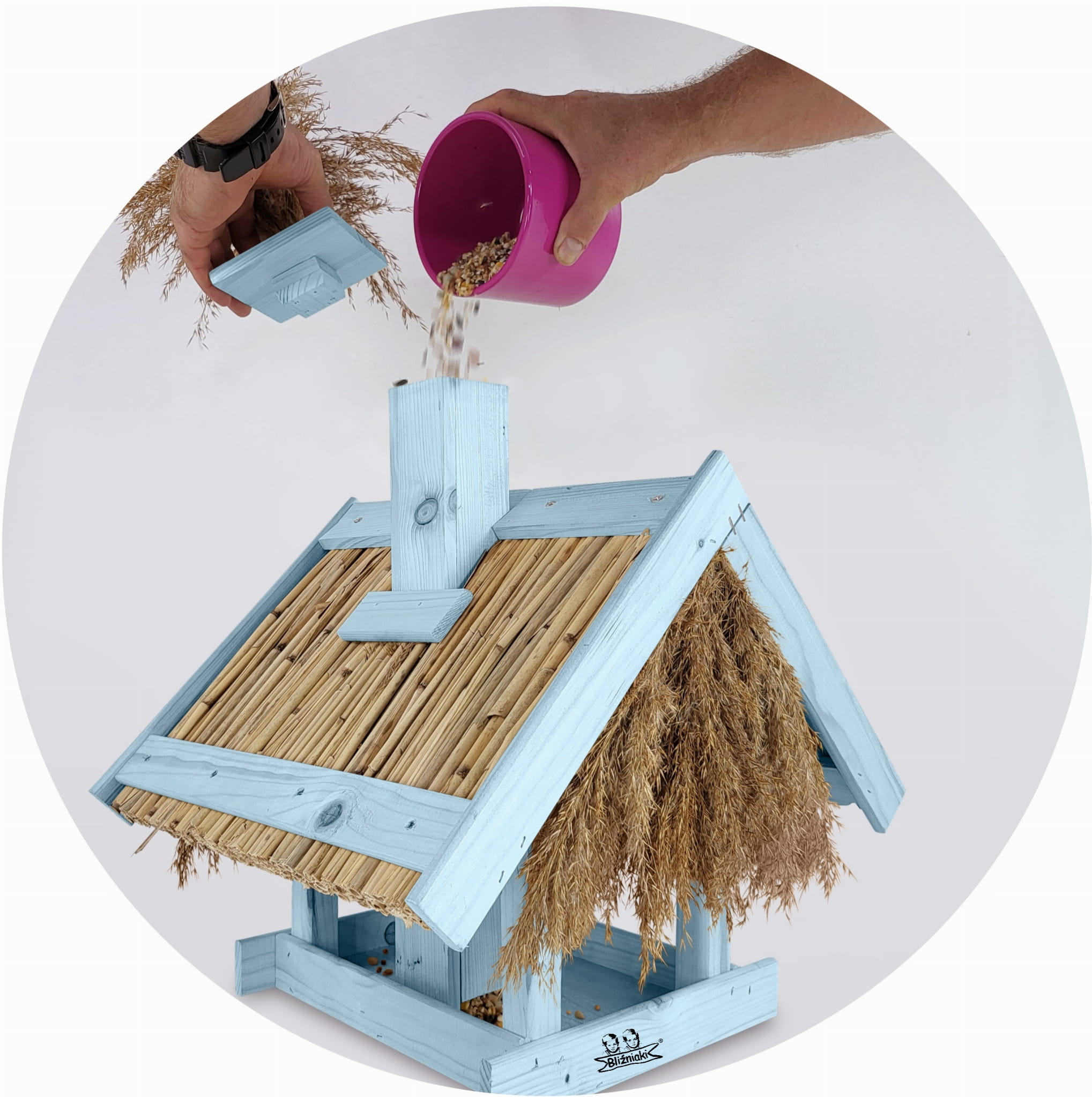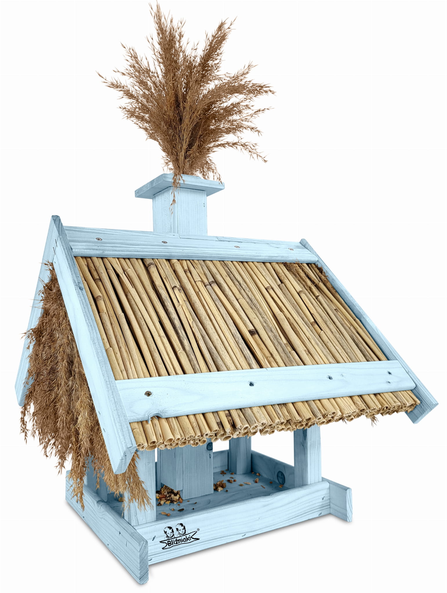Karmnik Dla Ptaków Ekologiczny Duży Domek Na Zimę Pastelowy Niebieski Budka na ziarno Dozownik na karmę Ekologiczny karmnik z trzciny i drewnaK2 NBPP