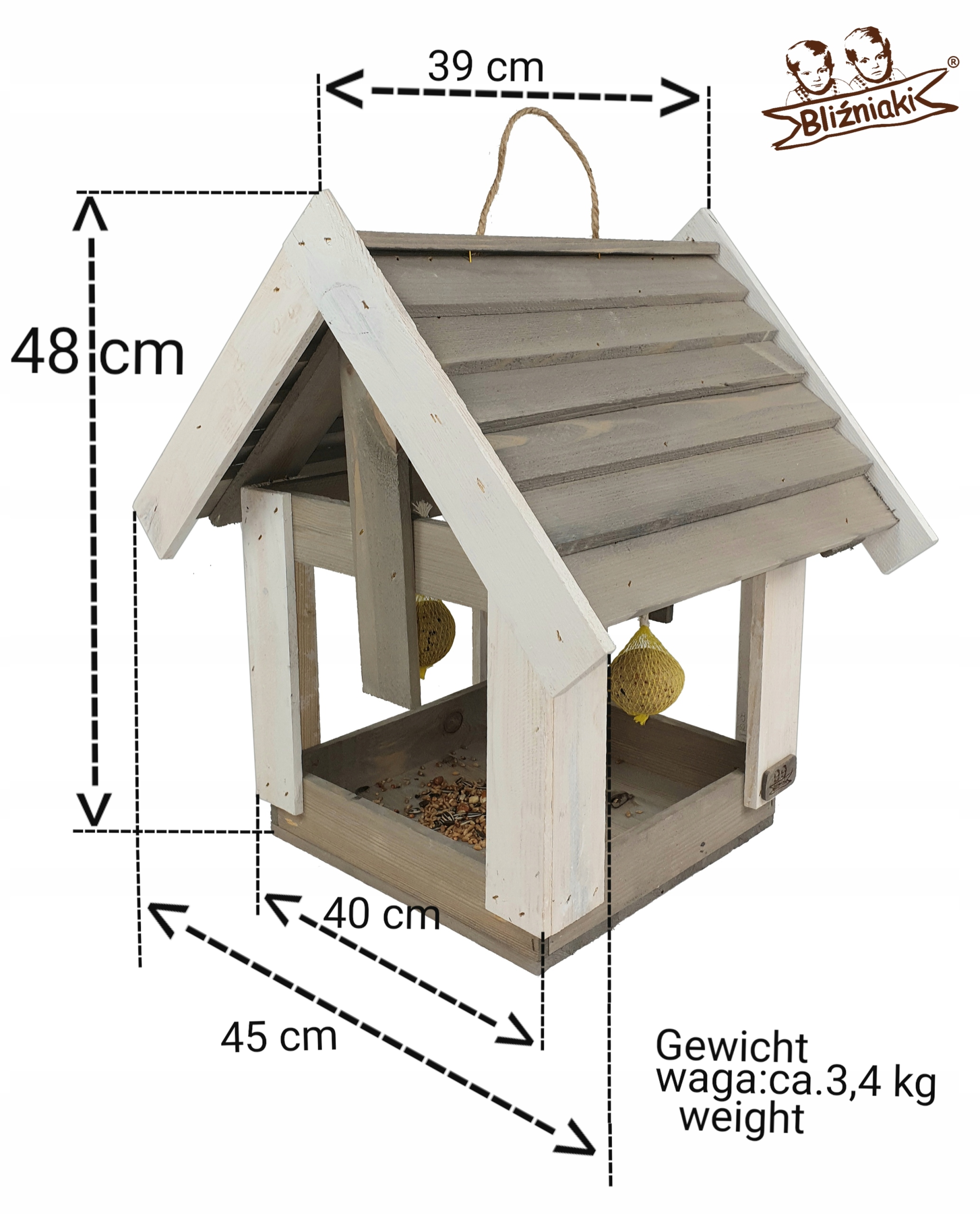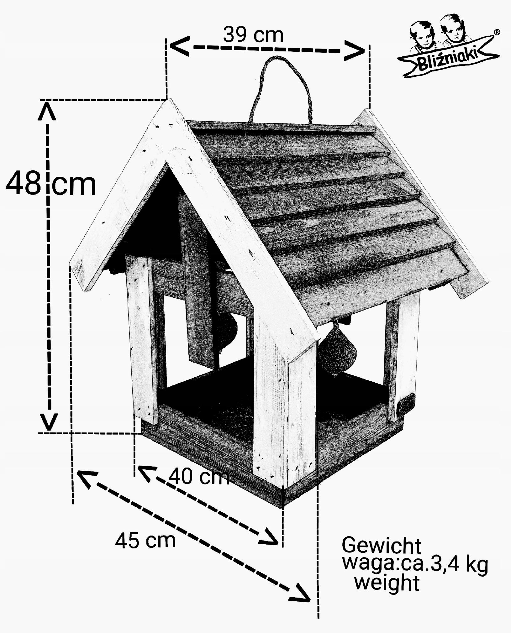 - Posiada szeroki dach chroniący karmę przed deszczem oraz innymi czynnikami atmosferycznymi