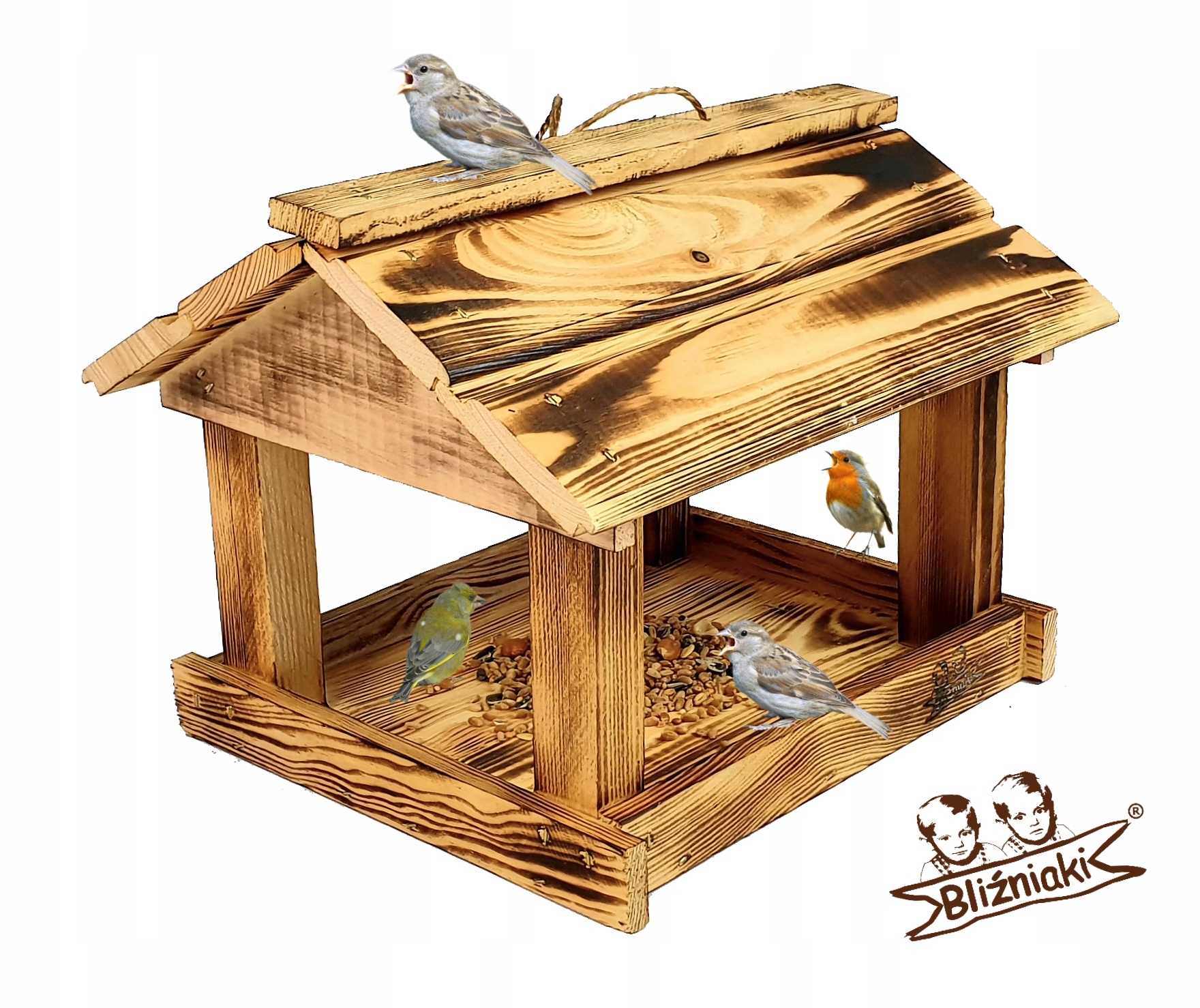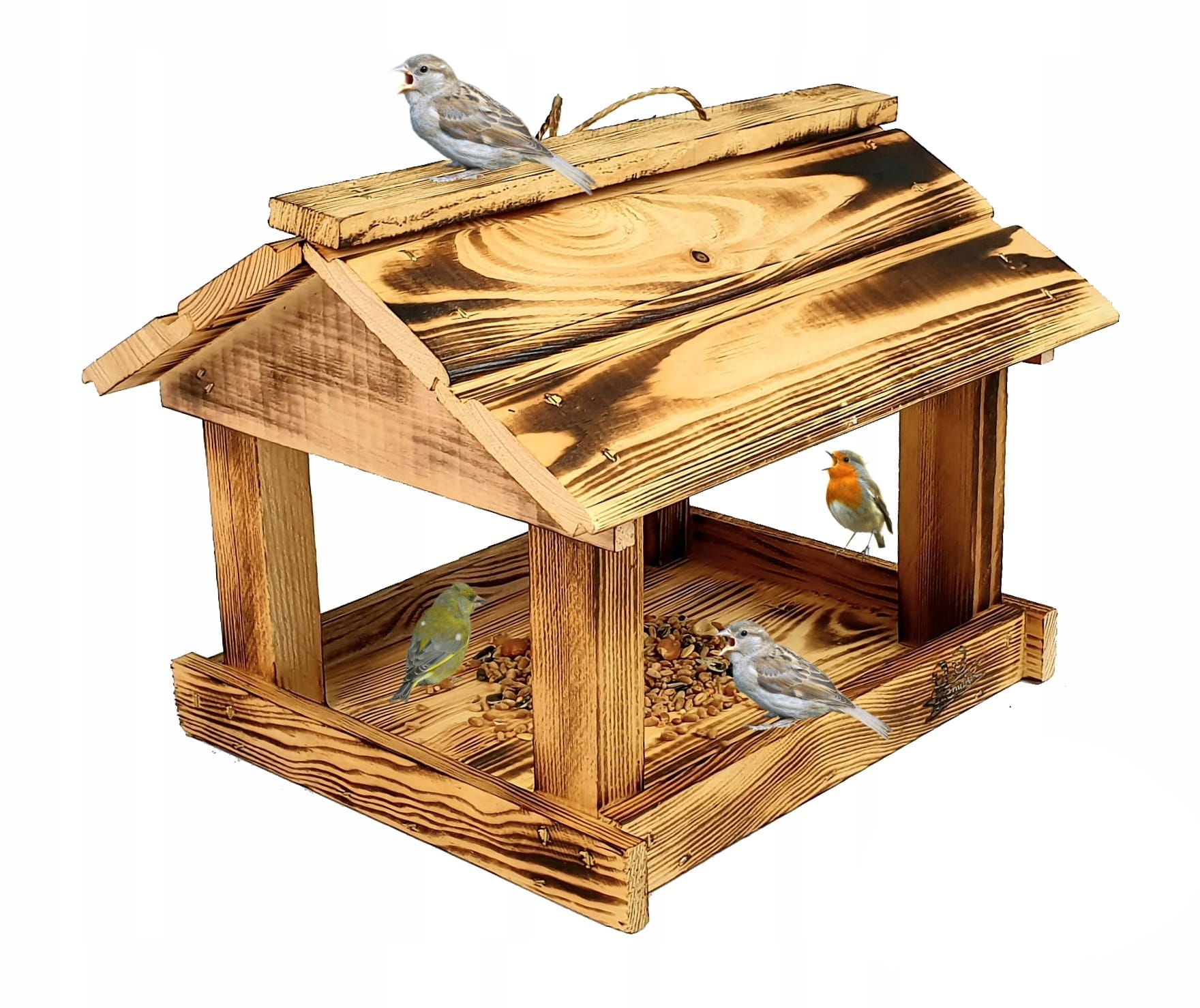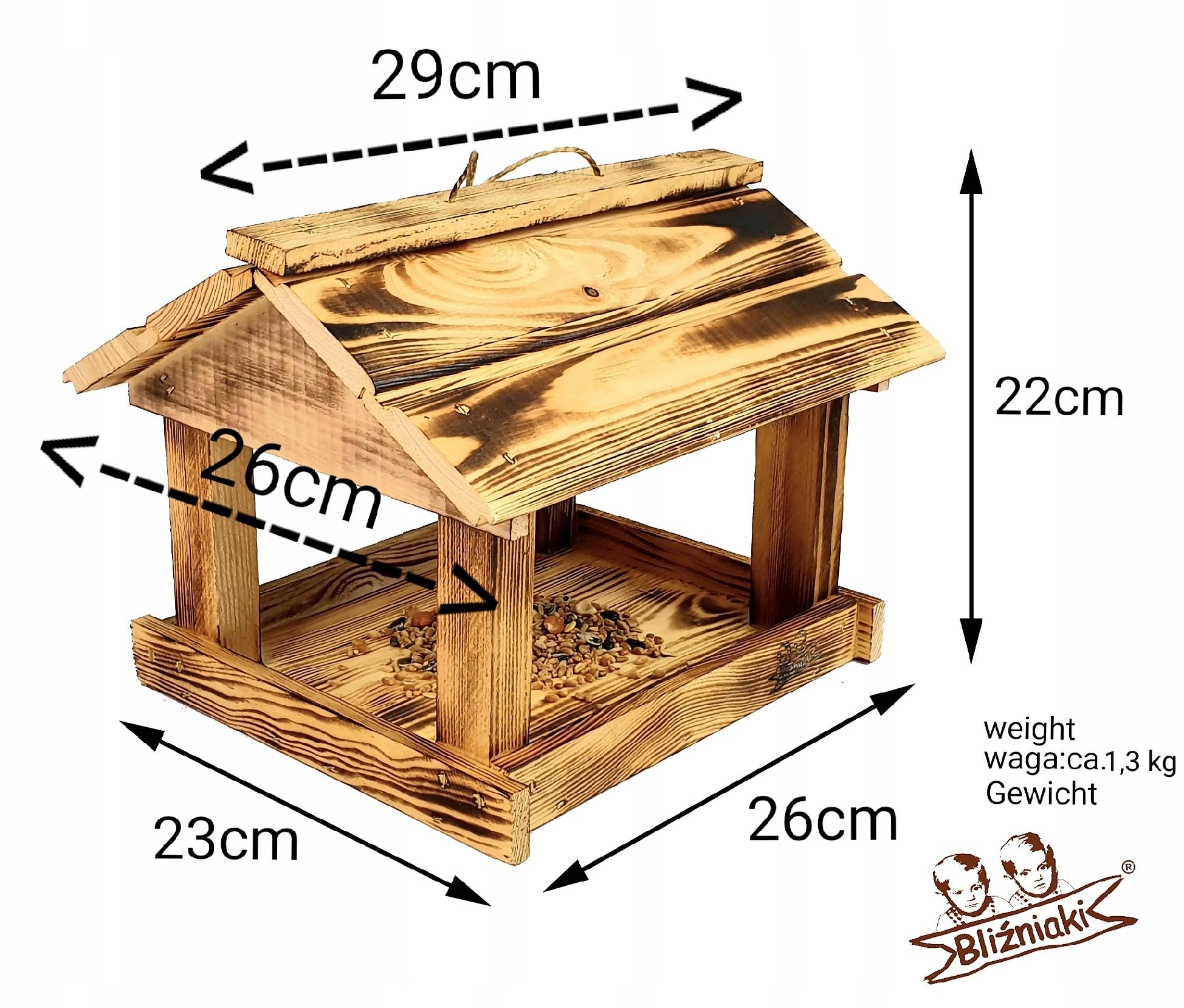 Wyposażony w szeroki dach, karmnik skutecznie chroni pożywienie przed deszczem i śniegiem. Dzięki temu zapewnia dłuższą świeżość dostarczanego pokarmu. Wykonany z drewna opalanego ogniem metodą ShouSugiBan, karmnik zachwyca estetyką oraz gwarantuje trwałość przez wiele sezonów zimowych. Posiada haczyk na karmę oraz zawieszkę na dachu ułatwiającą montaż budki na drzewie lub krzewach.