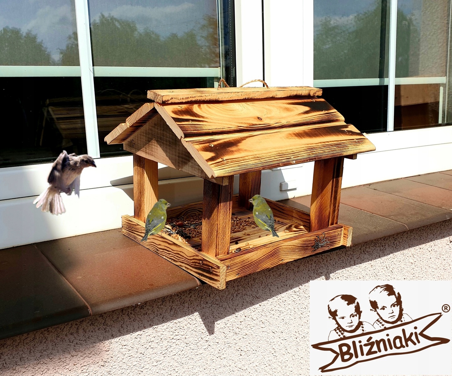 Impregnacja ogniem sprawia, że karmnik jest odporny na szkodliwe działanie wody oraz wilgoci, promieni UV, a także grzybów i pleśni, może być więc przechowywany przez cały rok na zewnątrz.