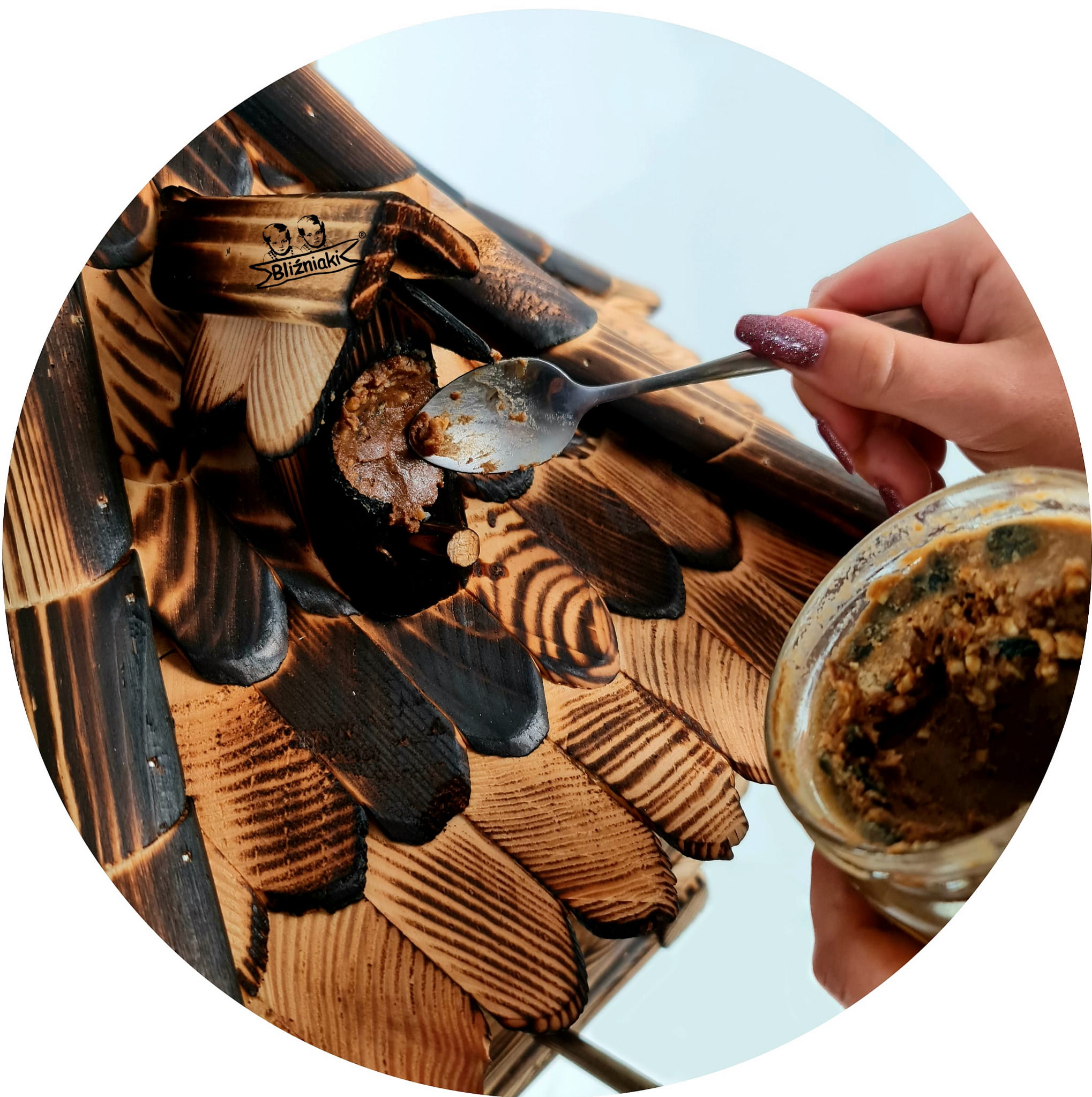 Dwa okienka w dachu ułatwiają umieszczenie w nich karmy tłuszczowej typu słonina, smalec lub kule tłuszczowe.