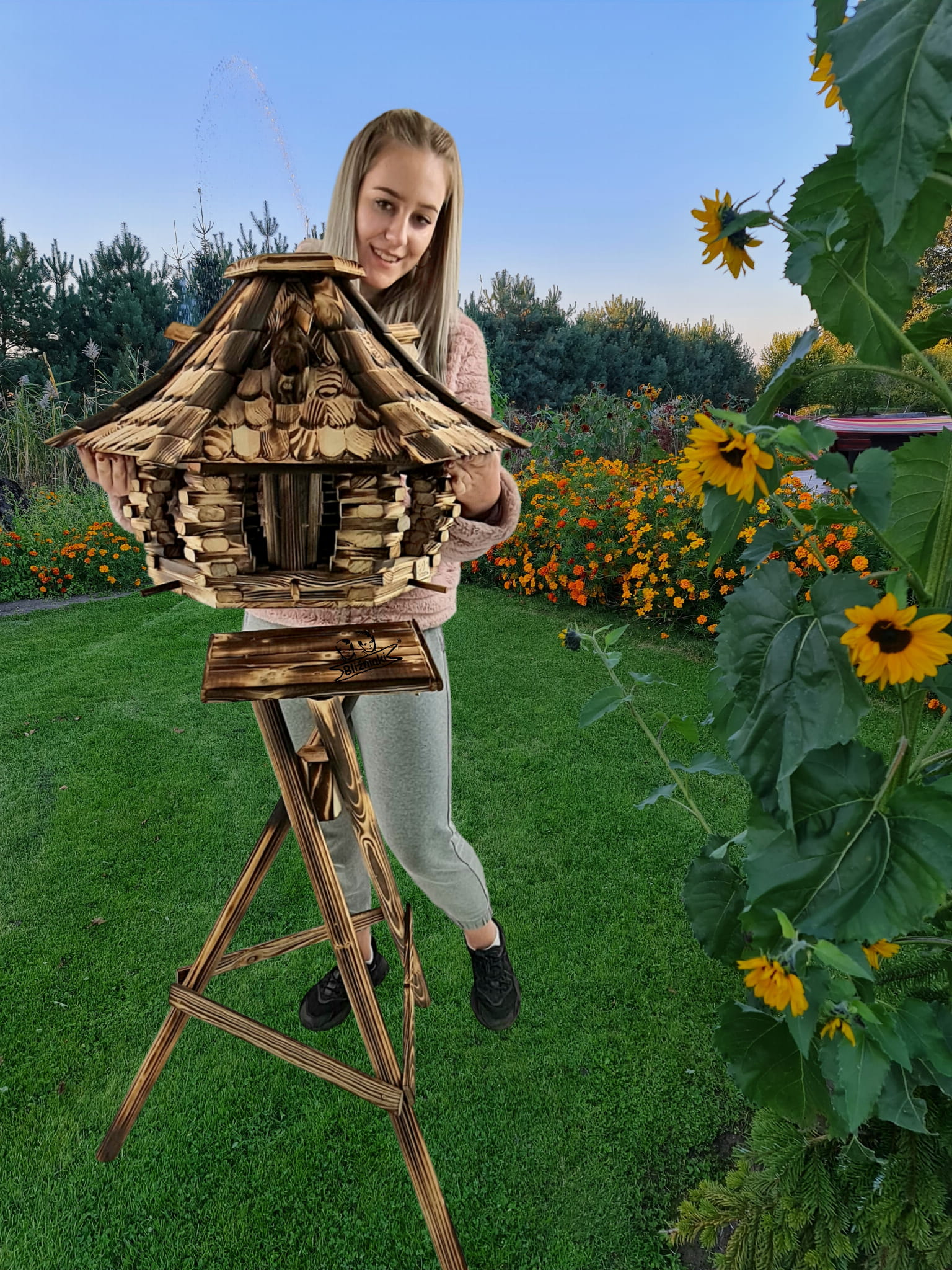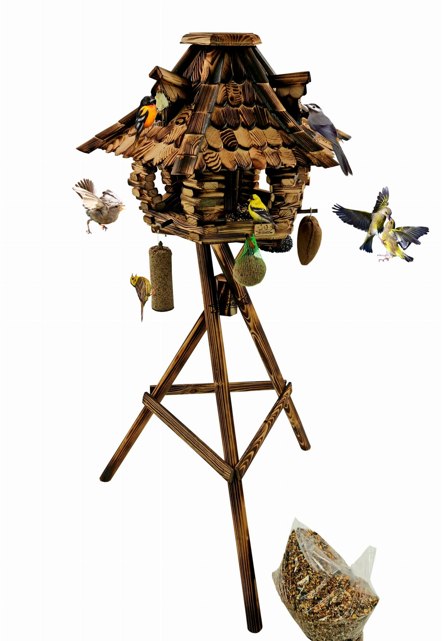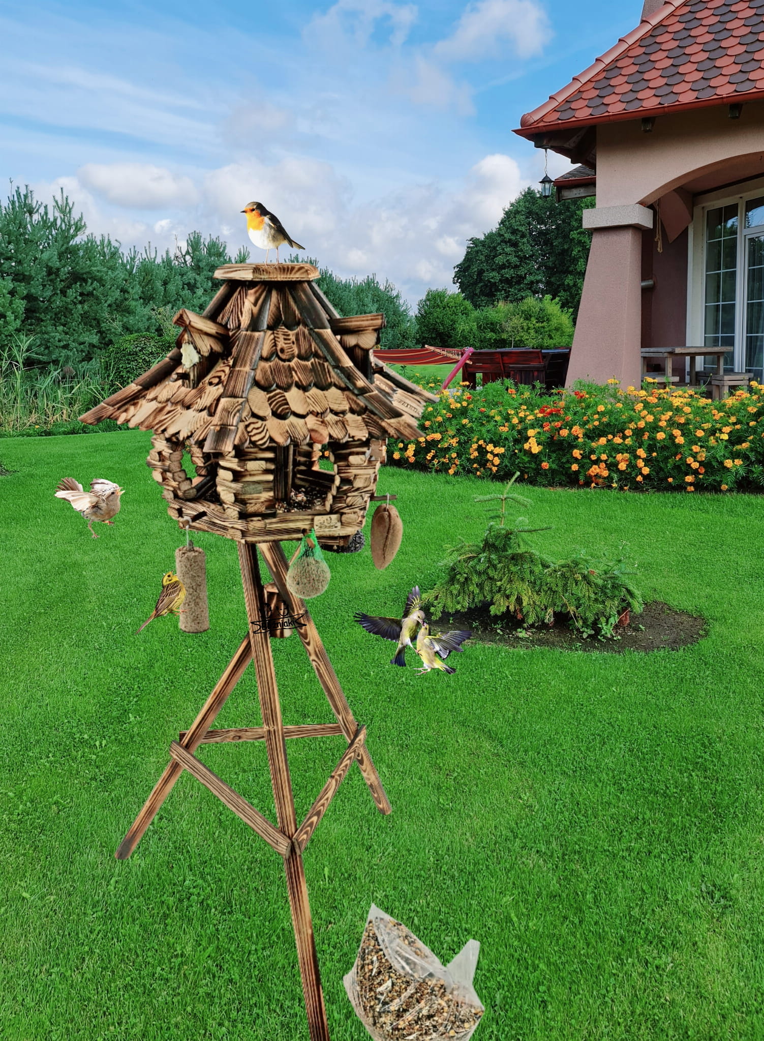 Przedmiotem oferty jest KARMNIK DLA PTAKÓW BUDKA LĘGOWA DREWNIANY DOMEK NA STOJAKU