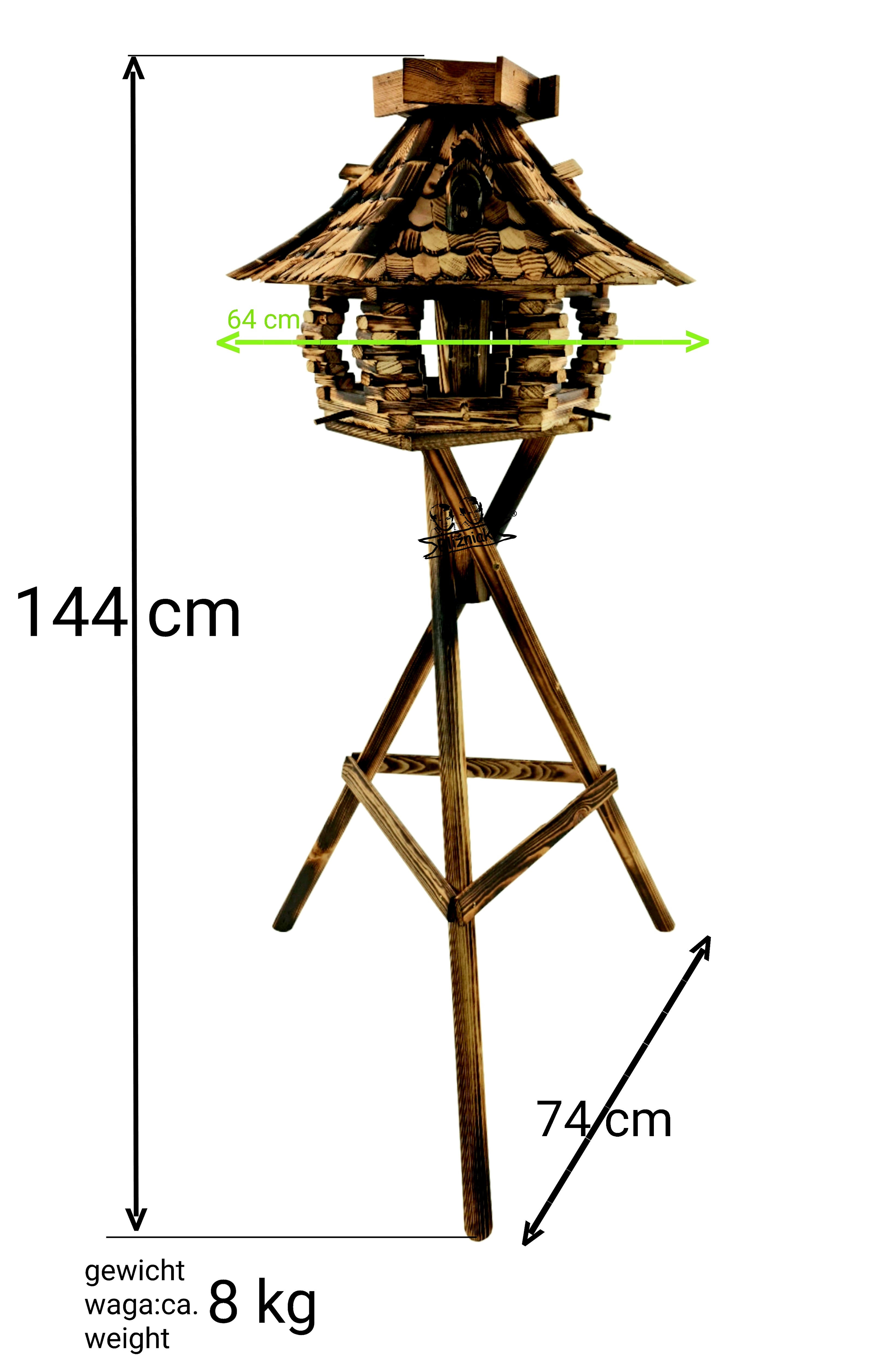 - Szeroka jak i prosta podstawa ułatwia ptakom dostęp do znajdującego się w nim pokarmu, natomiast szeroki dach ochroni je przed mrozem, deszczem oraz śniegiem, sprawdza się również świetnie jako ochrona przed słońcem w gorące dni.