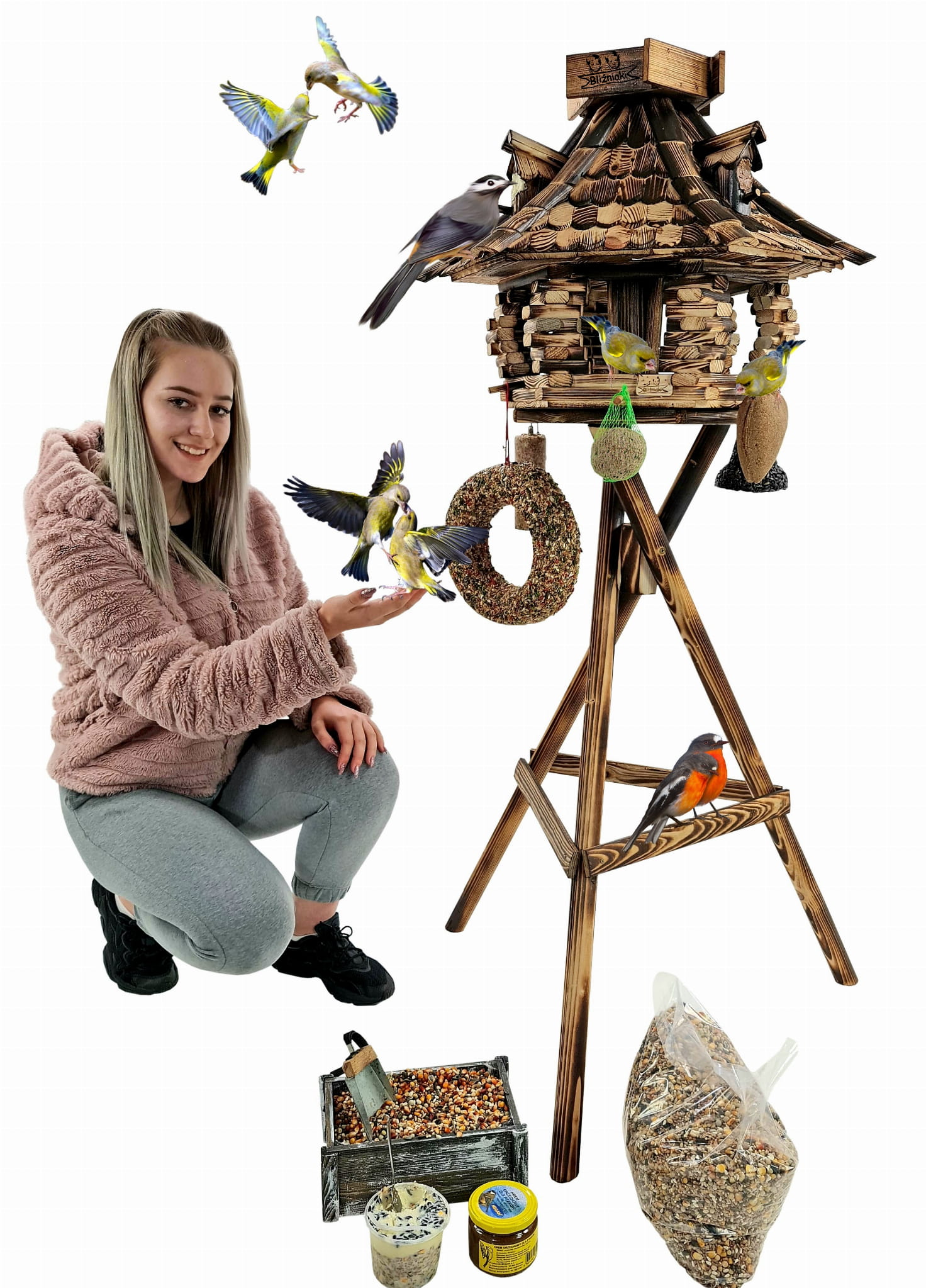 W tej ofercie kupują Państwo karmnik w komplecie ze stojakiem trio, pokarm nie jest częścią zestawu. Zdjęcia przedstawiające karmnik wraz z pokarmem mają charakter poglądowy, aby zaprezentować produkt i możliwości jego wykorzystania.