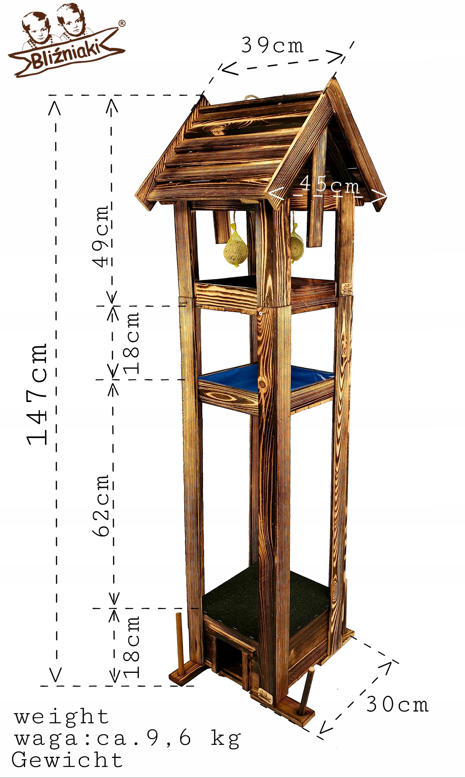 Kupując nasz wielofunkcyjny zestaw otrzymujesz: duży karmnik, który możesz zawiesić w dowolnym miejscu, poidło dla ptaków oraz budkę lęgową dla jeży. Trzy produkty w jednej cenie. Całość zabezpieczona została metodą opalania ogniem.