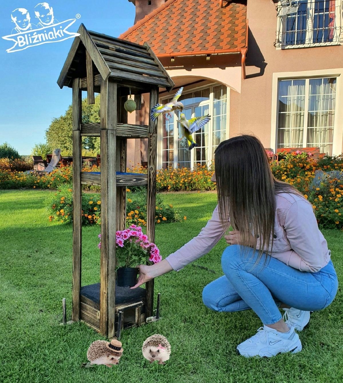 Przedmiotem sprzedaży jest ozdobny drewniany Karmnik dla ptaków z poidłem oraz domkiem dla jeża w zestawie. Model K200 STJP OPAL.