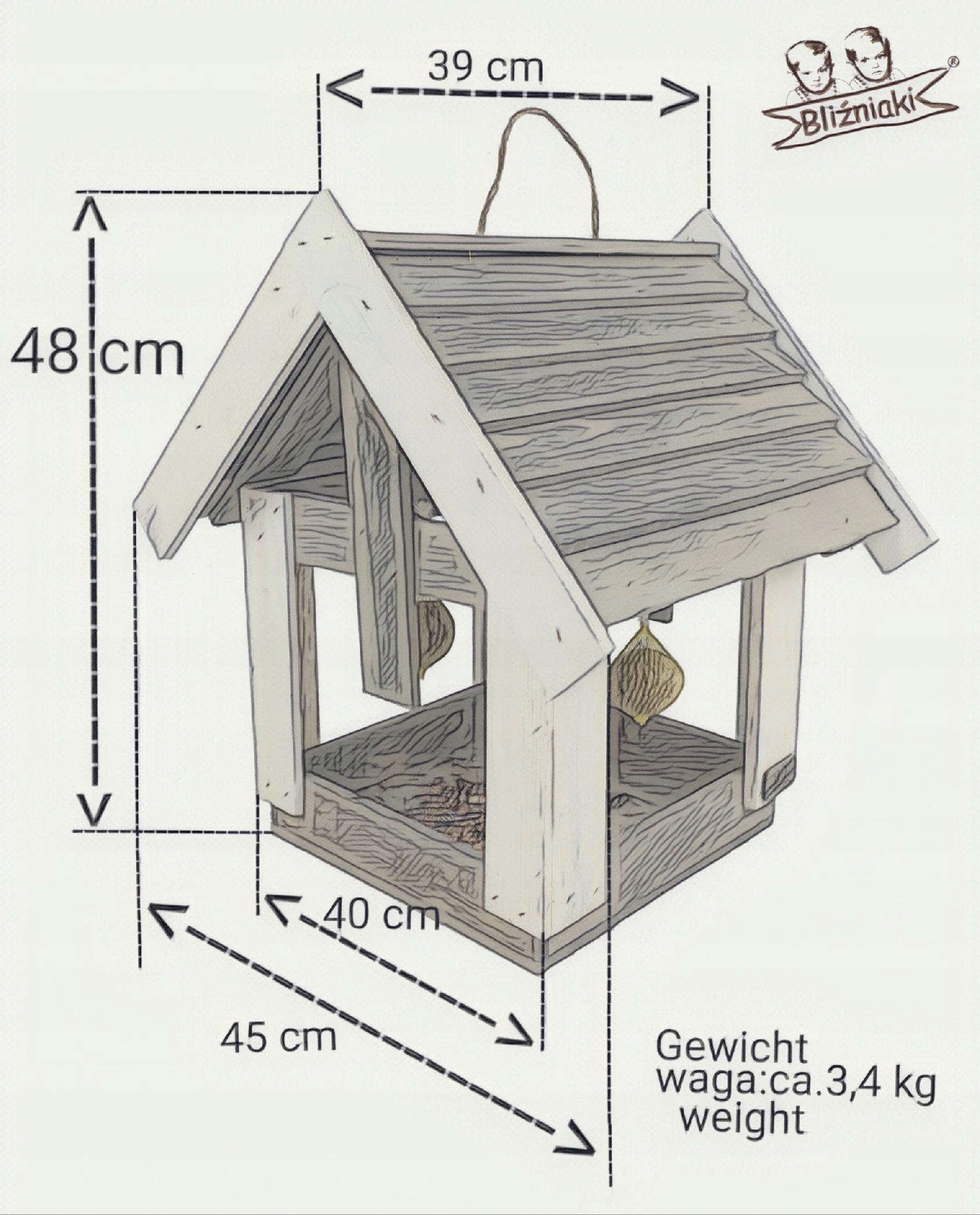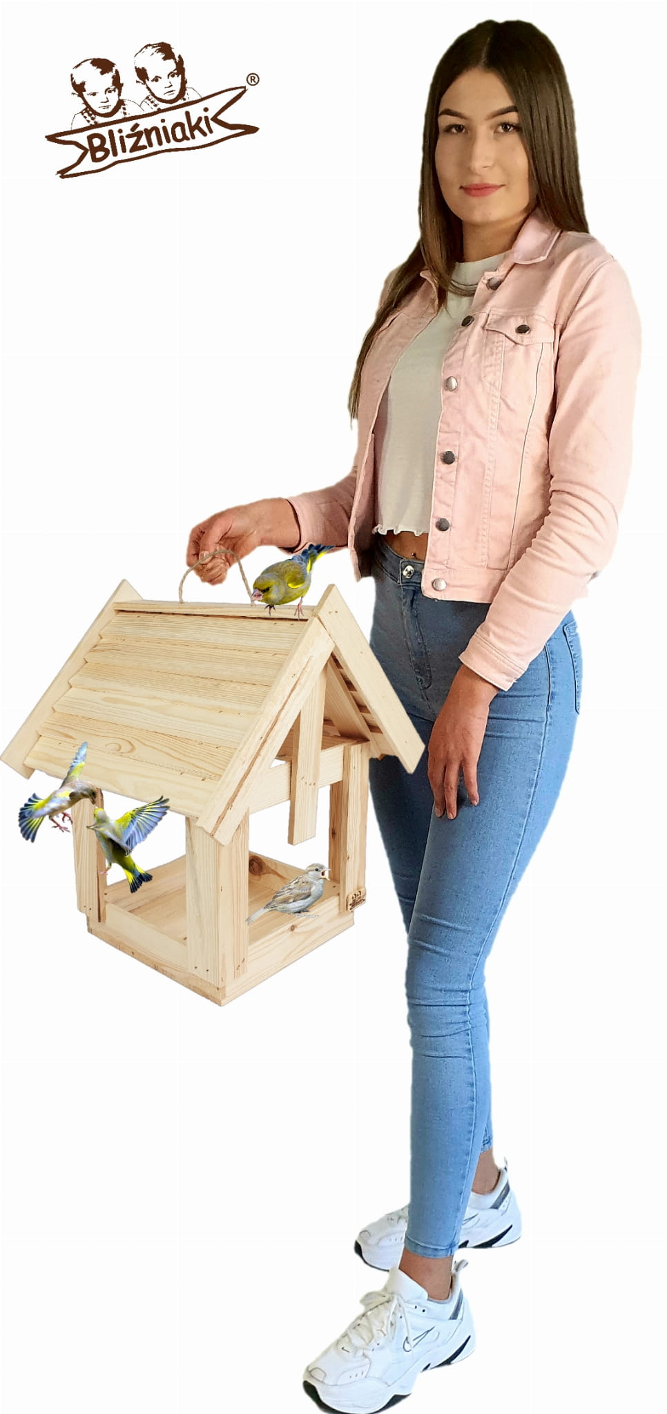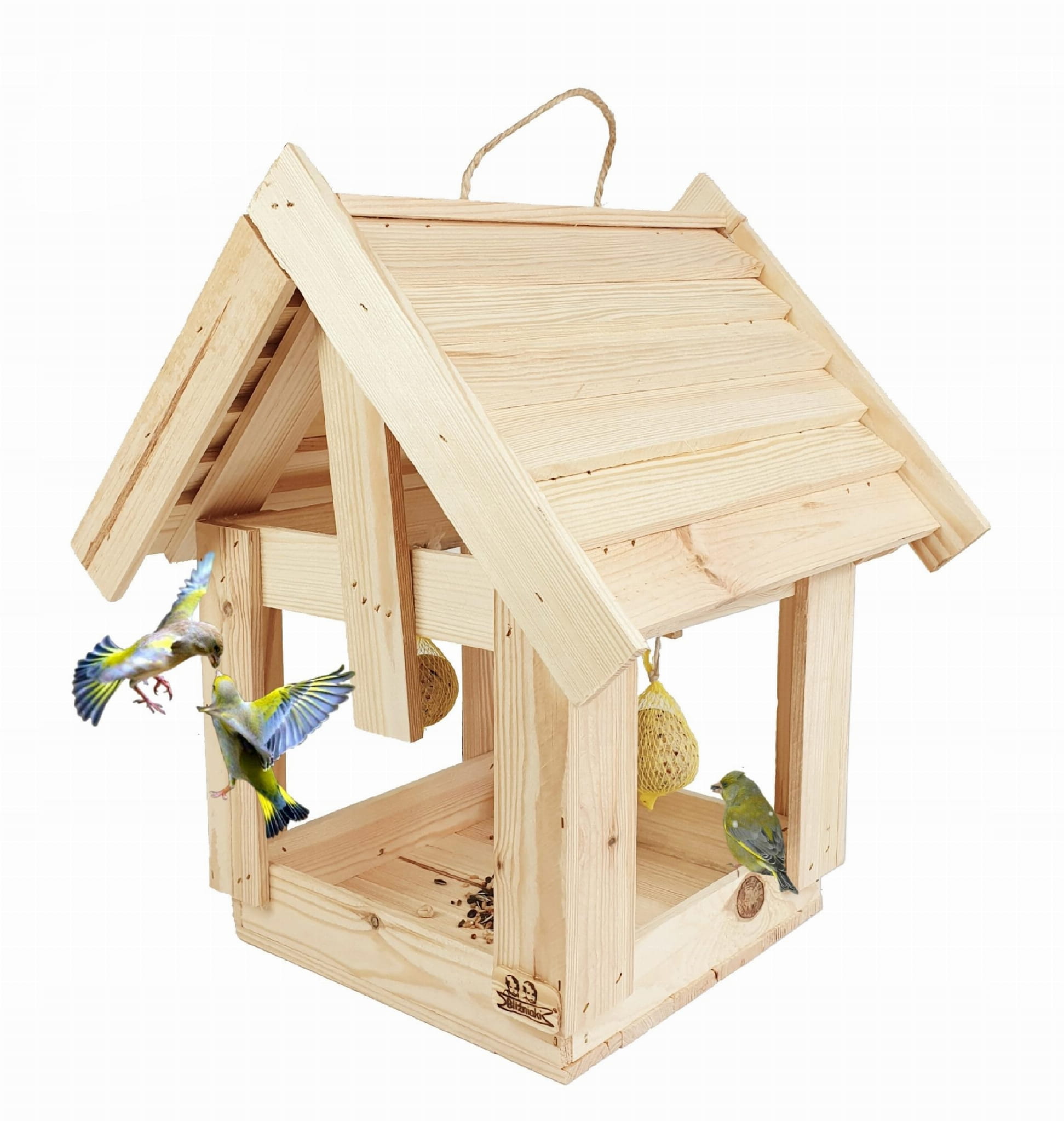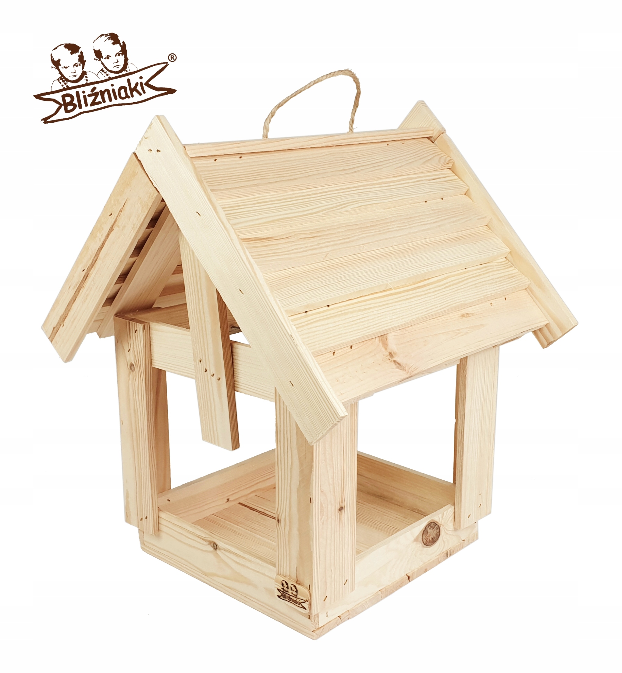 Wyposażony w szeroki dach, karmnik skutecznie chroni pożywienie przed deszczem i śniegiem. Dzięki temu zapewnia dłuższą świeżość dostarczanego pokarmu. Wykonany z wysokiej jakości drewna sosnowego, karmnik zachwyca estetyką oraz gwarantuje trwałość przez wiele sezonów zimowych. Posiada haczyk na karmę oraz zawieszkę na dachu ułatwiającą montaż budki na drzewie lub krzewach.