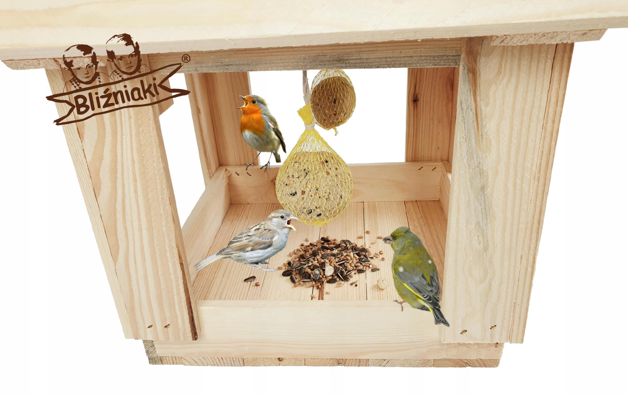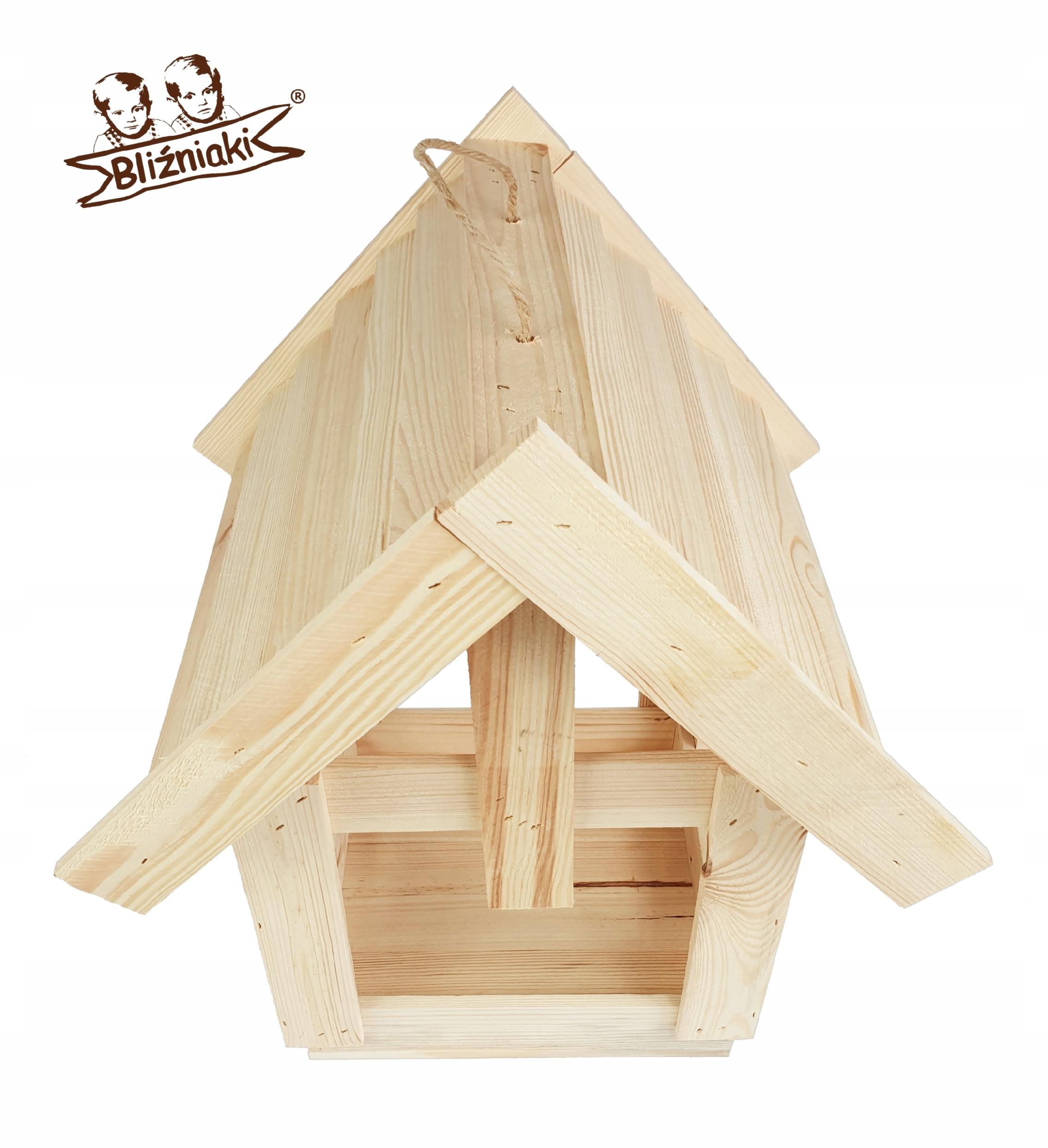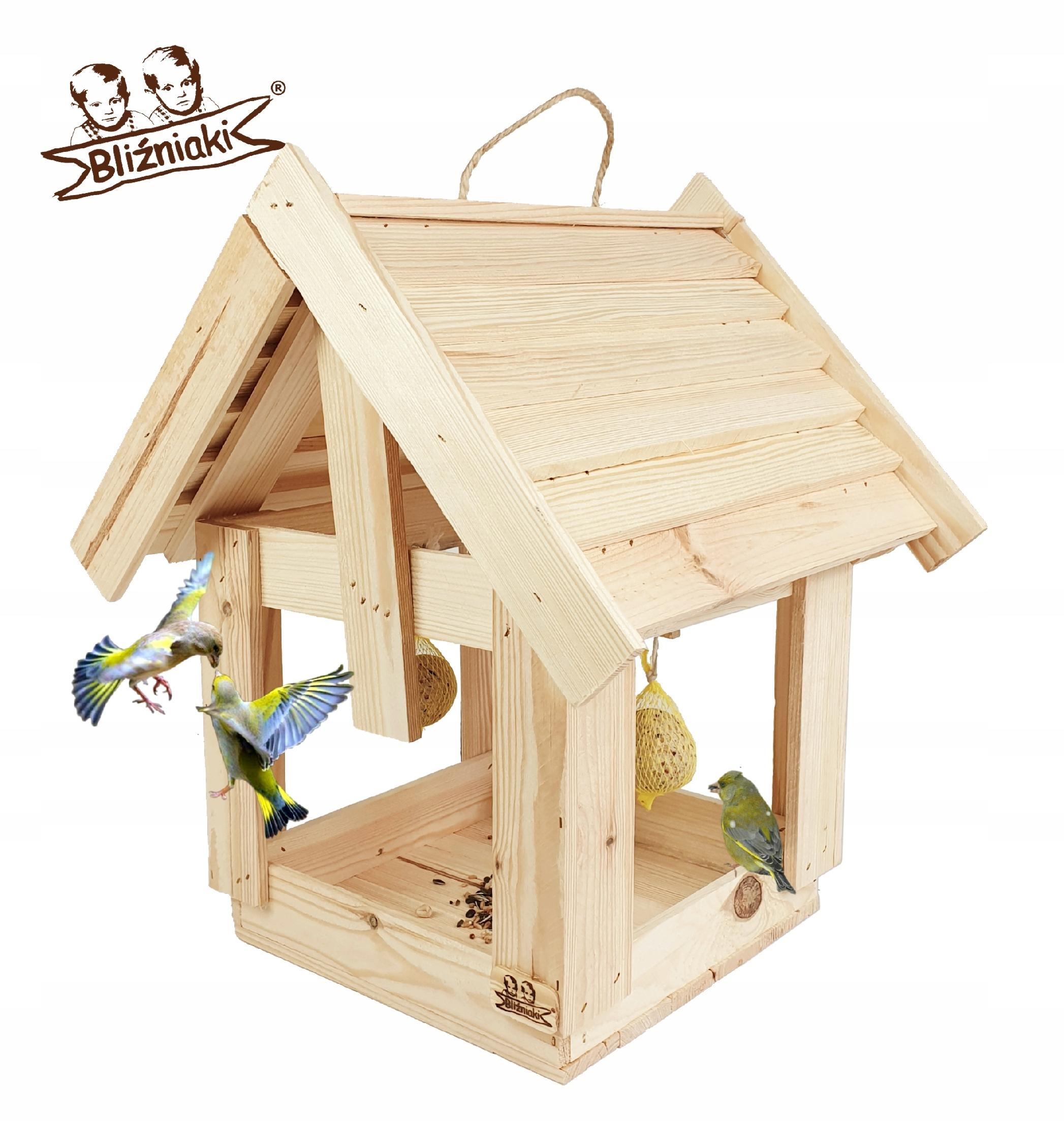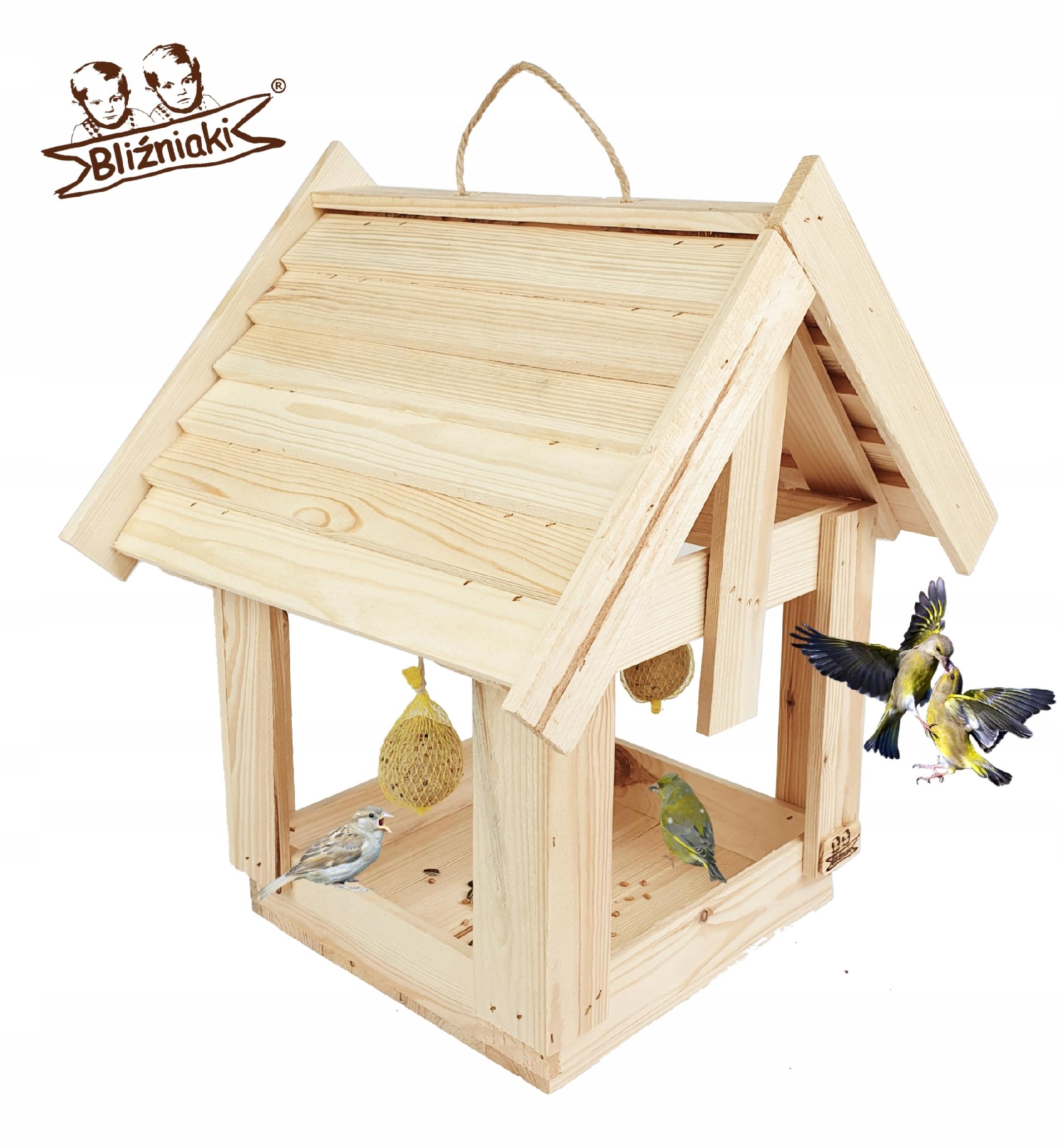 Karmnik Dla Ptaków XXL Na Ziarno Drewniana Budka Stołówka Całoroczne Miejsce Pobierania Pokarmu przez Ptaki Domek Surowe Drewno z Zawieszką i Haczykiem na Karmę (K200 N)