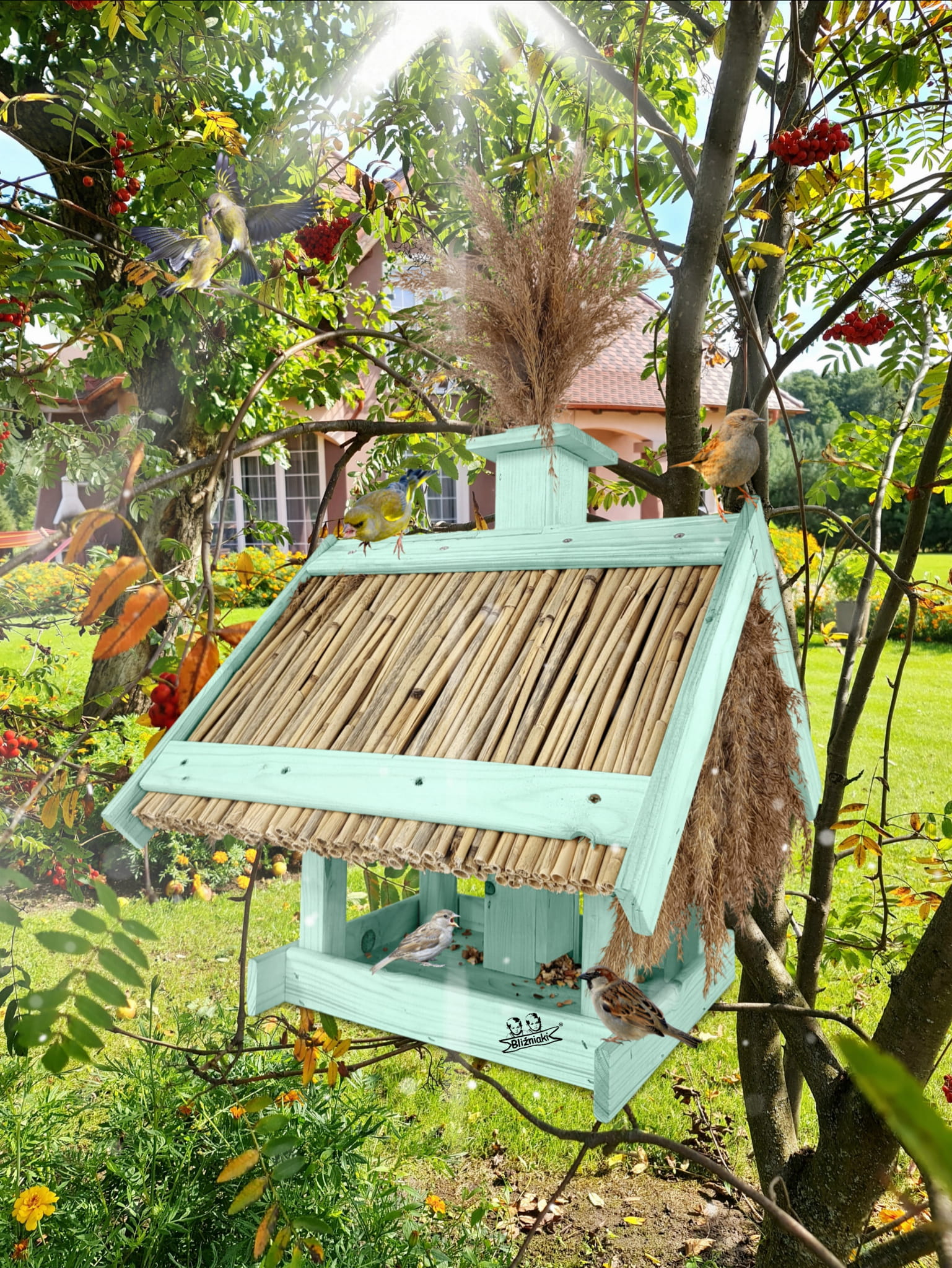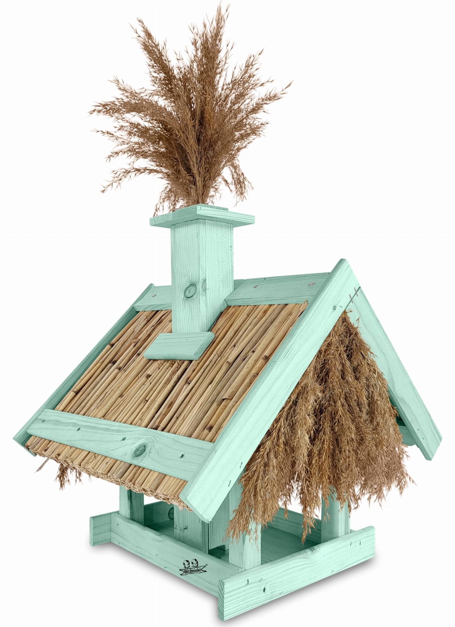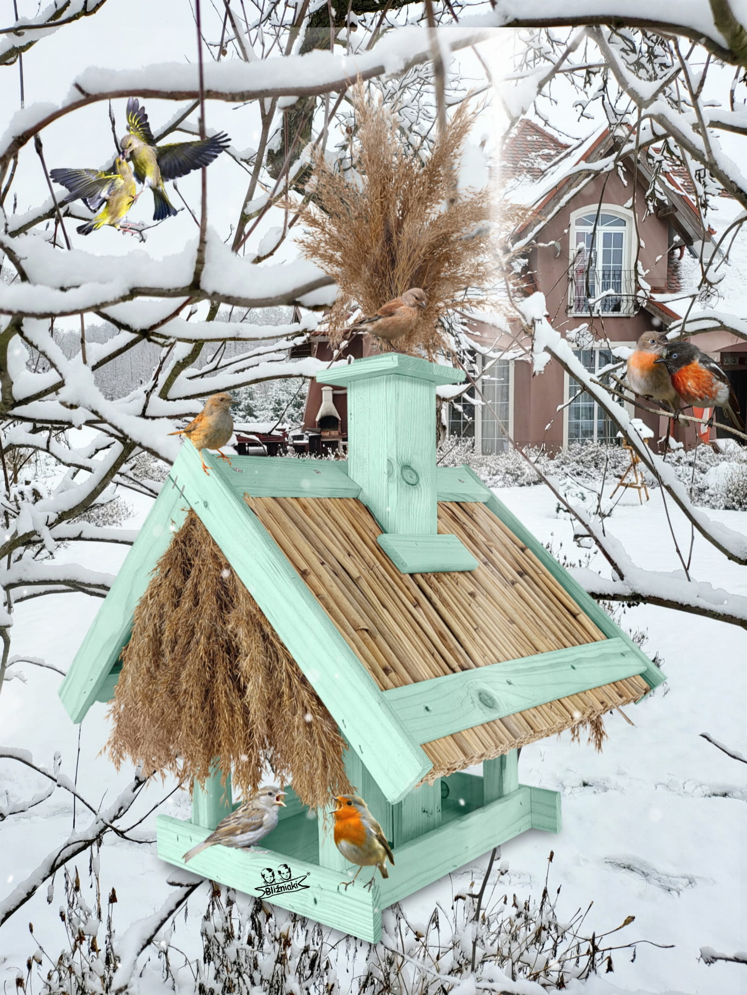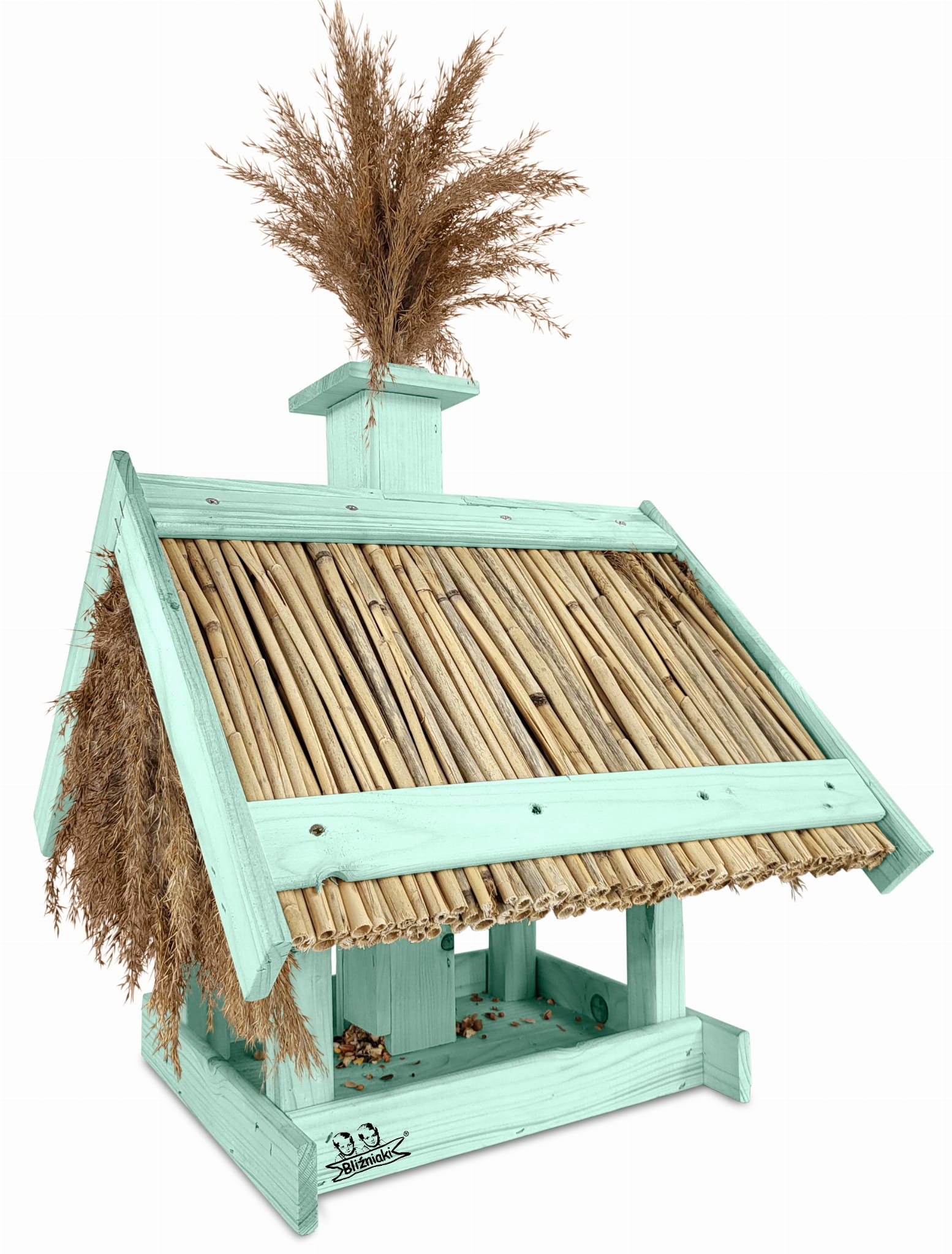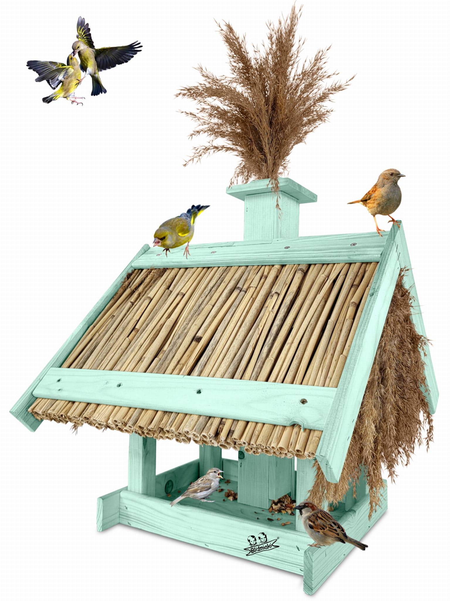 Karmnik Dla Ptaków Z Trzciną Z Dozownikiem Ziaren Zimowy Domek Kolor Morski Zielony Pastelowy Całoroczny karmnik naturalny do ogrodu K2 MRP