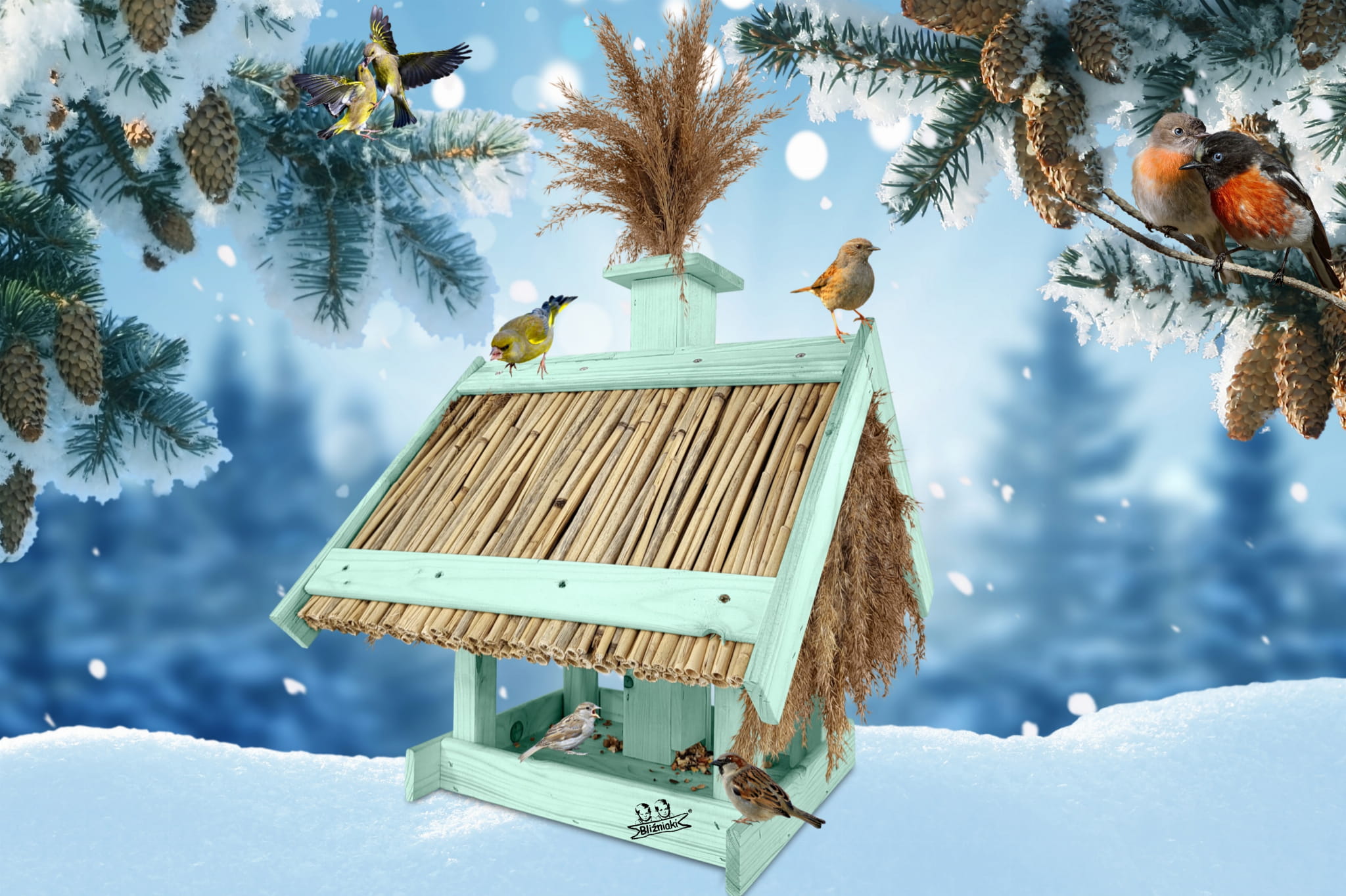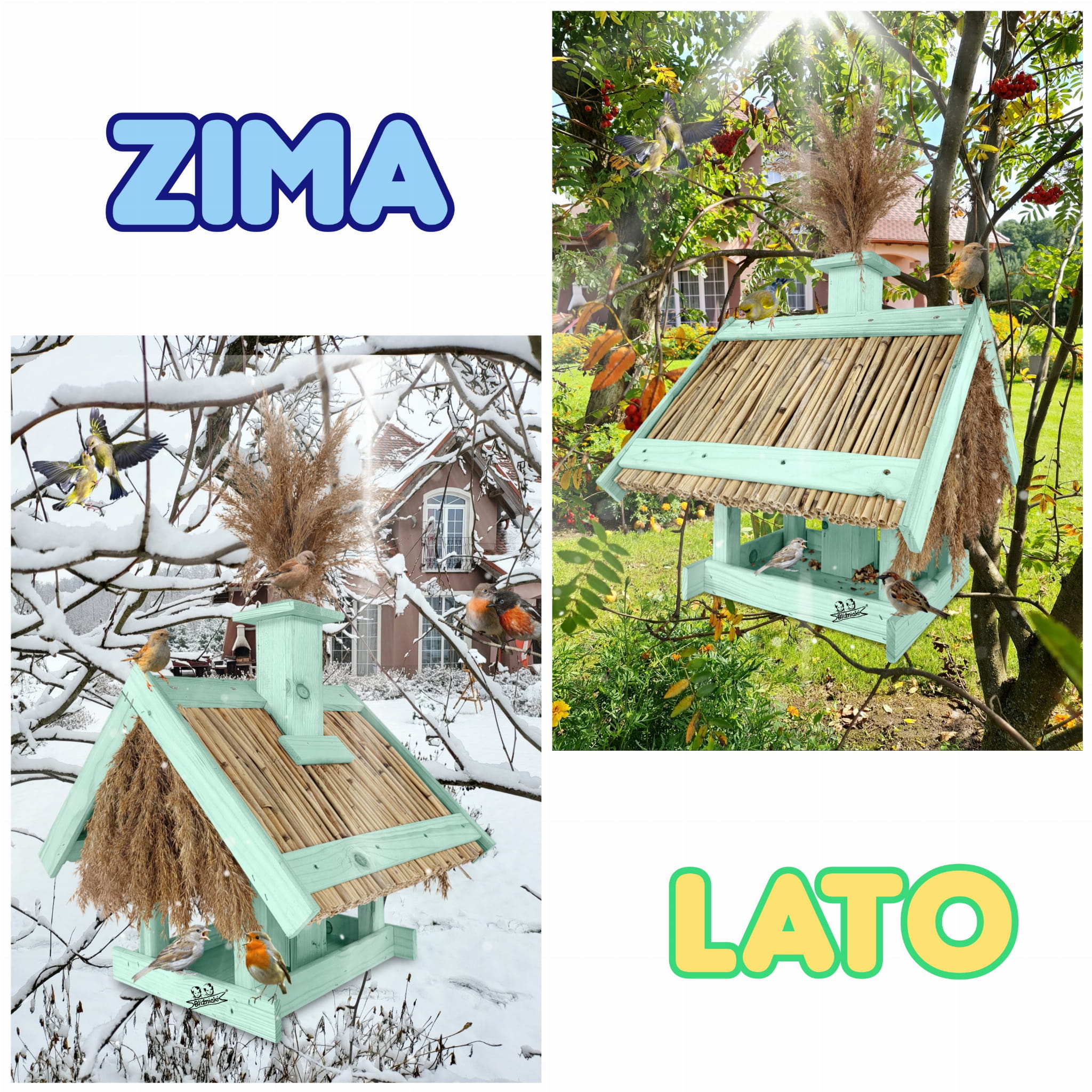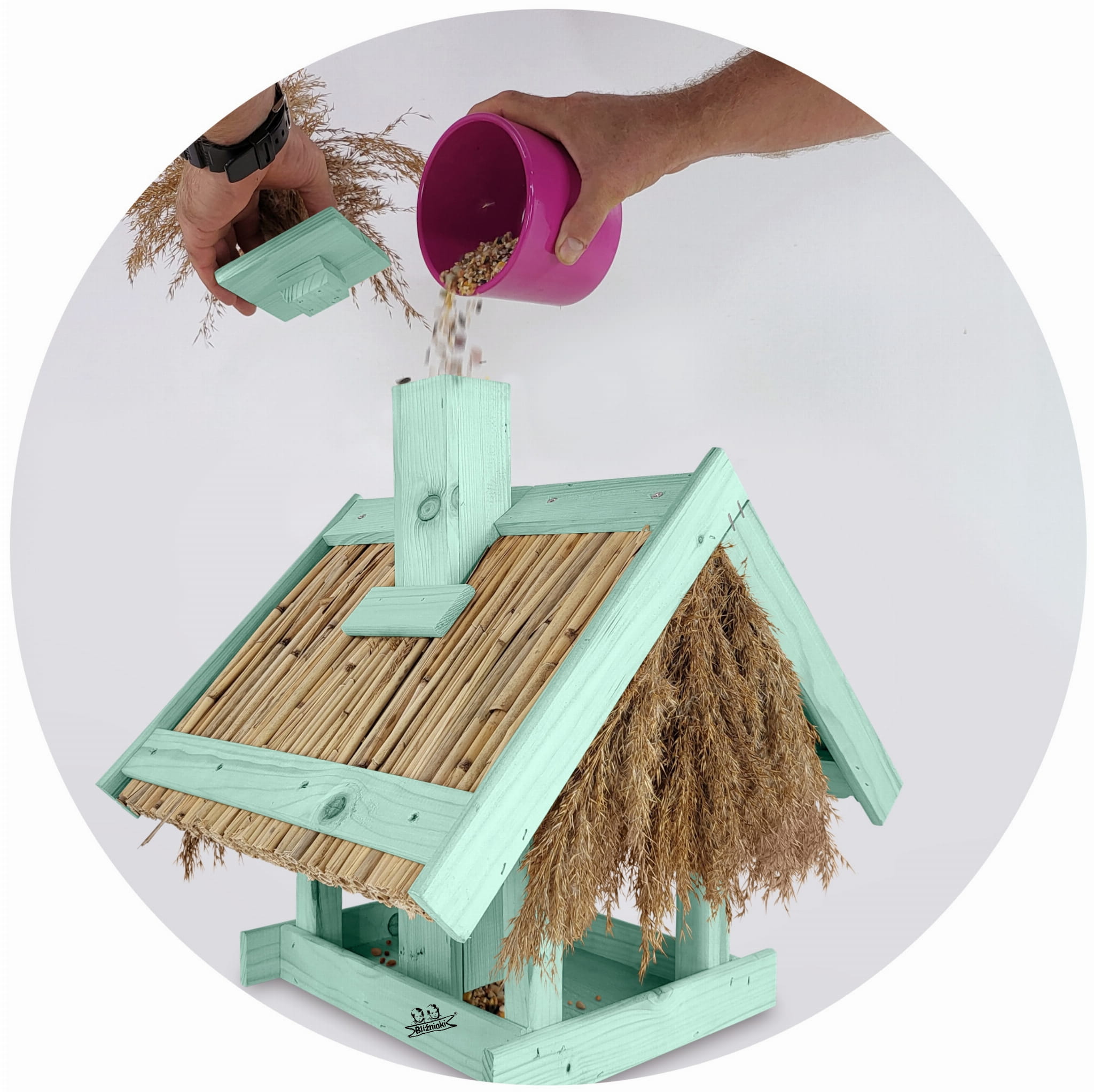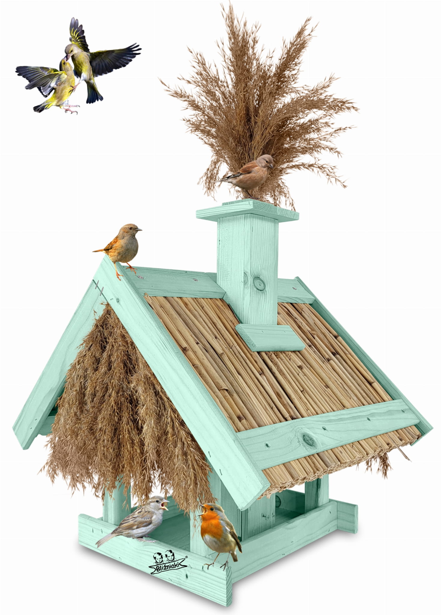 Karmnik Dla Ptaków Z Trzciną Z Dozownikiem Ziaren Zimowy Domek Kolor Morski Zielony Pastelowy Całoroczny karmnik naturalny do ogrodu K2 MRP