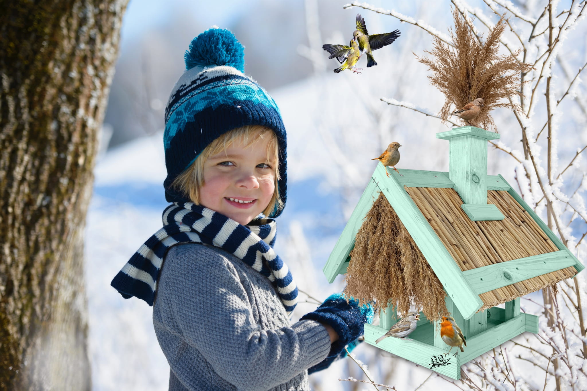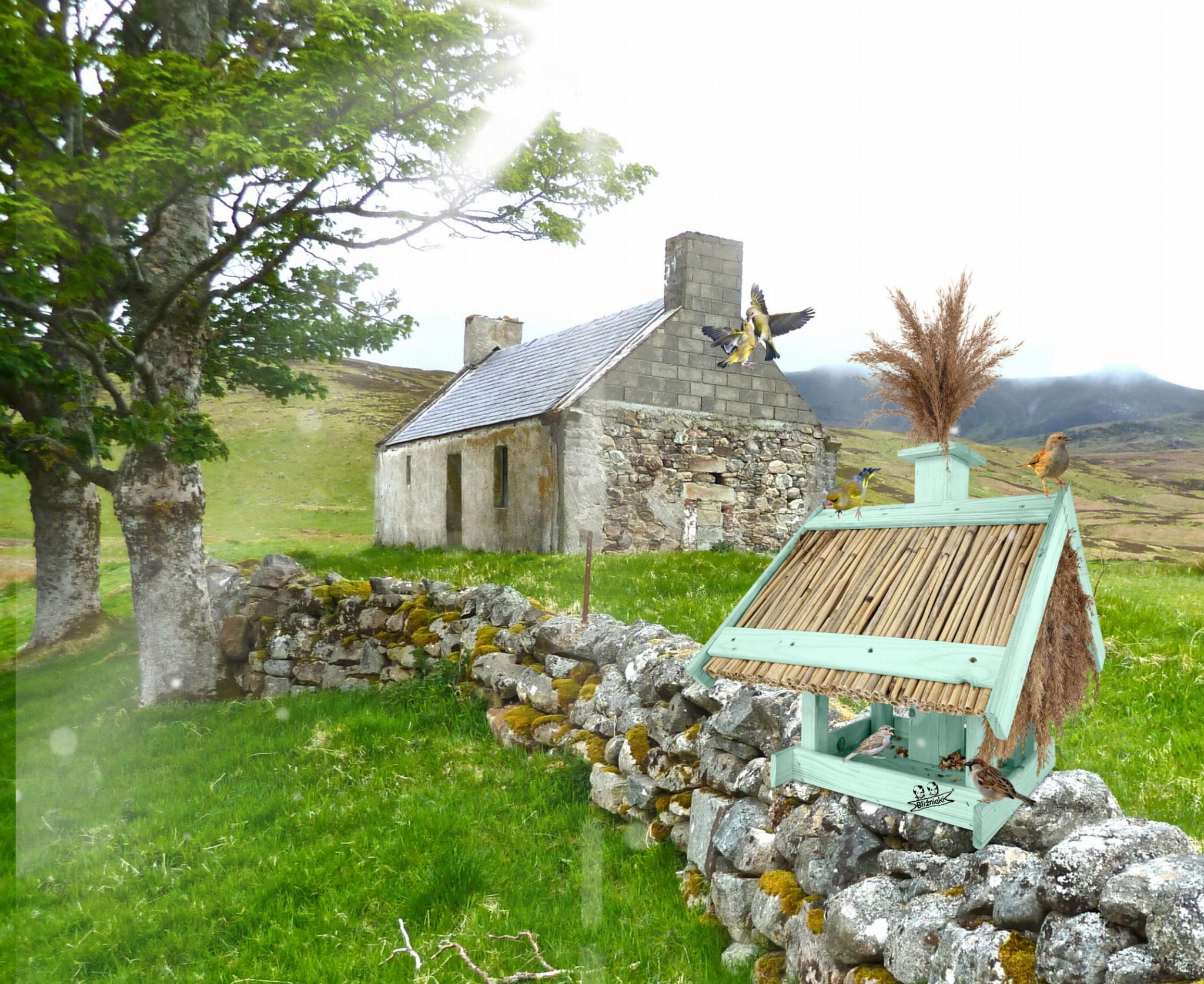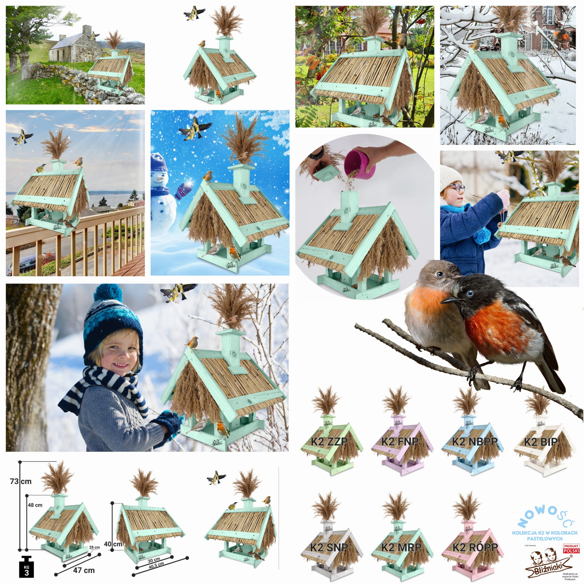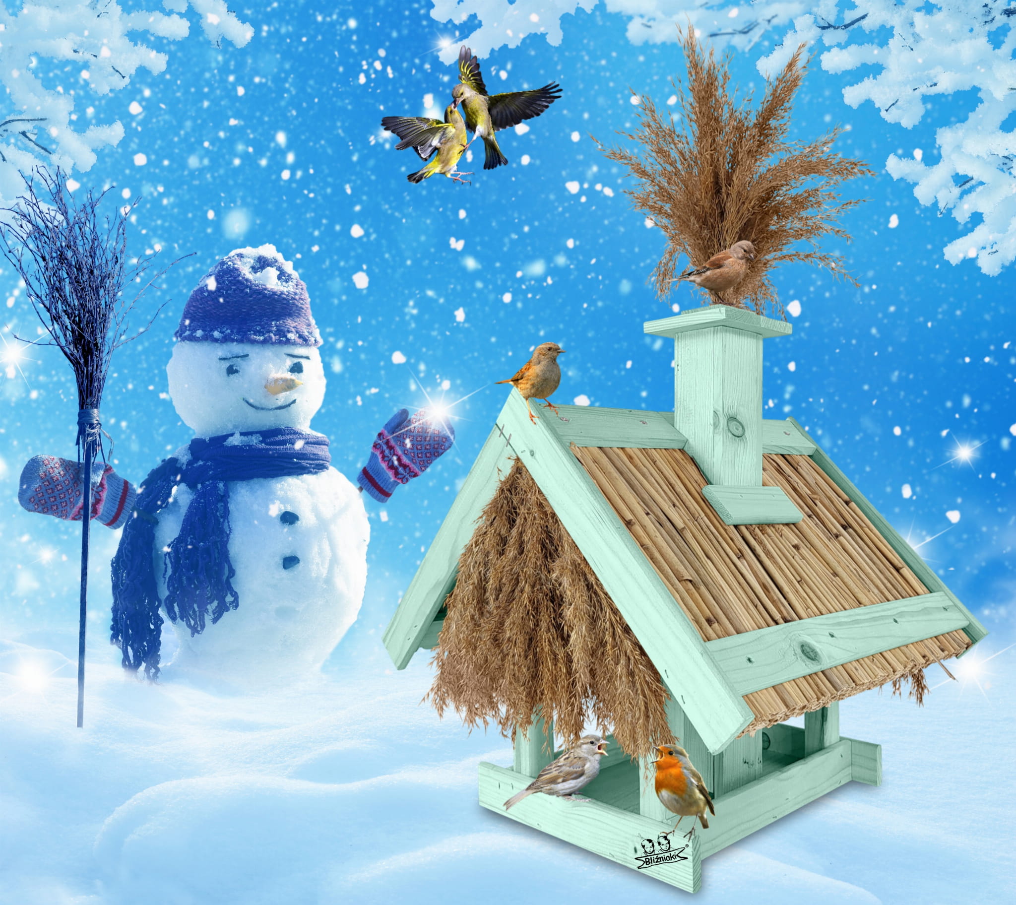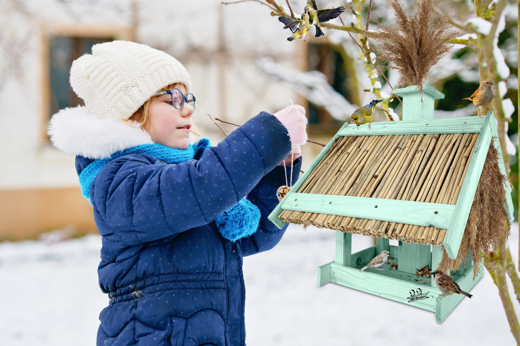 Karmnik Dla Ptaków Z Trzciną Z Dozownikiem Ziaren Zimowy Domek Kolor Morski Zielony Pastelowy Całoroczny karmnik naturalny do ogrodu K2 MRP