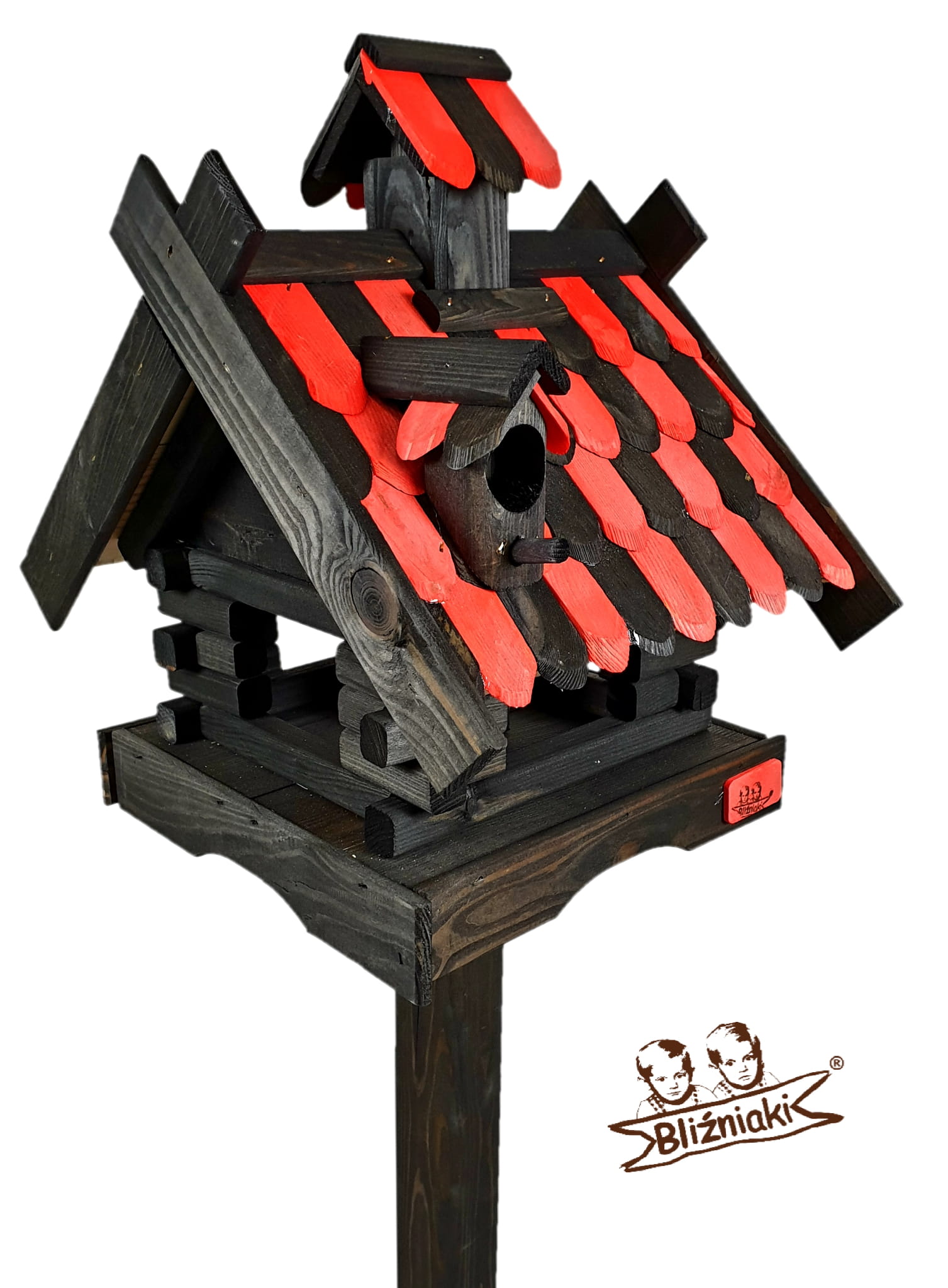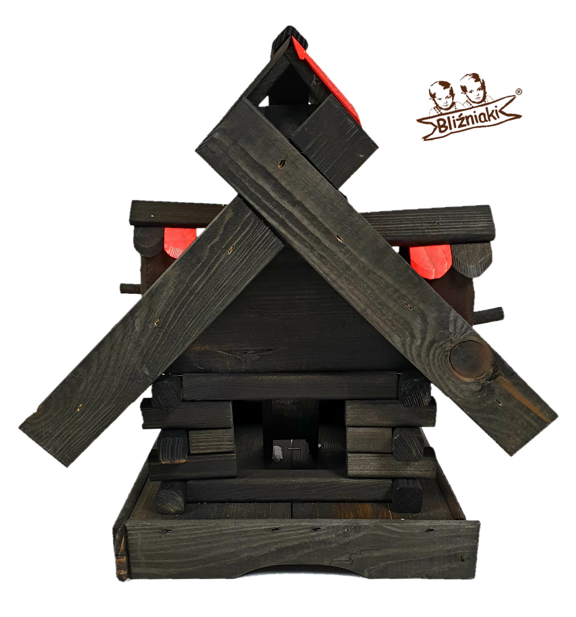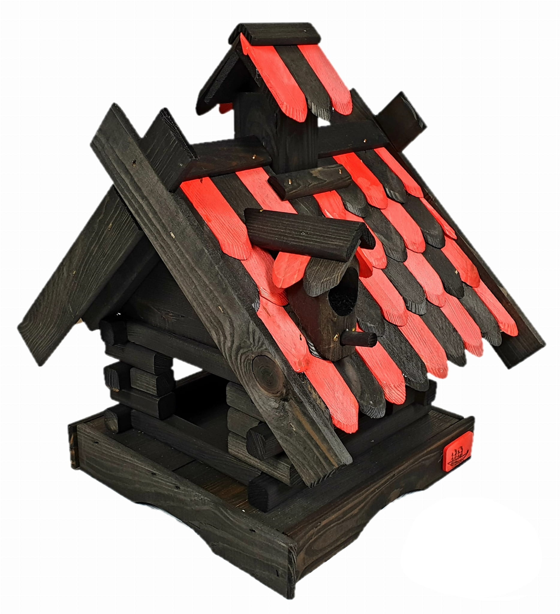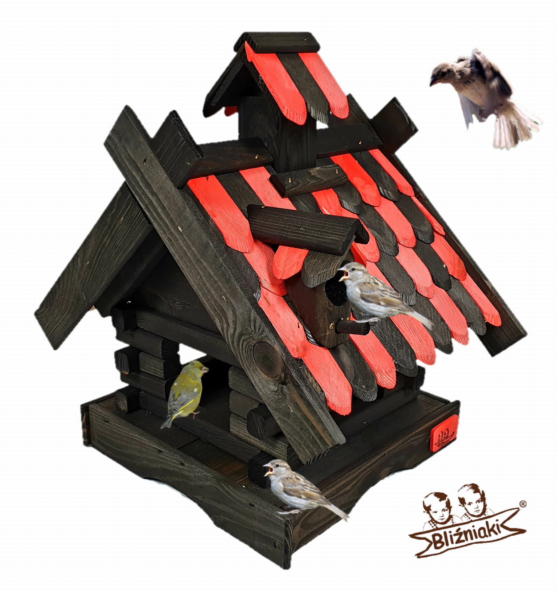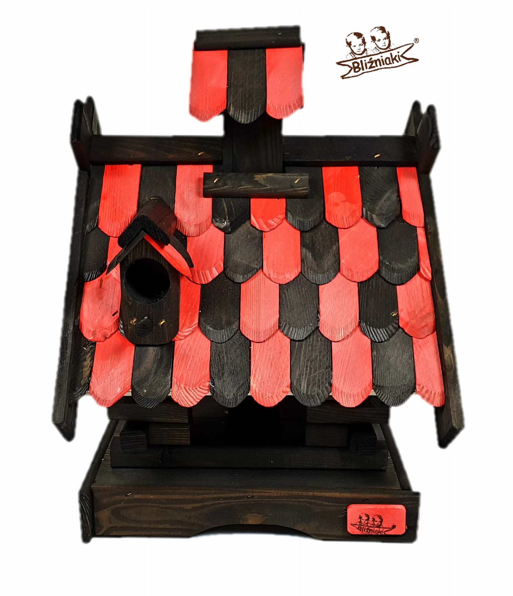 Karmnik dwukolorowy CZARNO - CZERWONY. Środek na bazie wody użyty do impregnacji jest w pełni ekologiczny i bezpieczny dla ludzi i zwierząt. Zabezpieczone w taki sposób drewno sprawia, że karmnik jest odporny na szkodliwe działanie wody oraz wilgoci, promieni UV, a także grzybów i pleśni, może być więc przechowywany przez cały rok na zewnątrz.