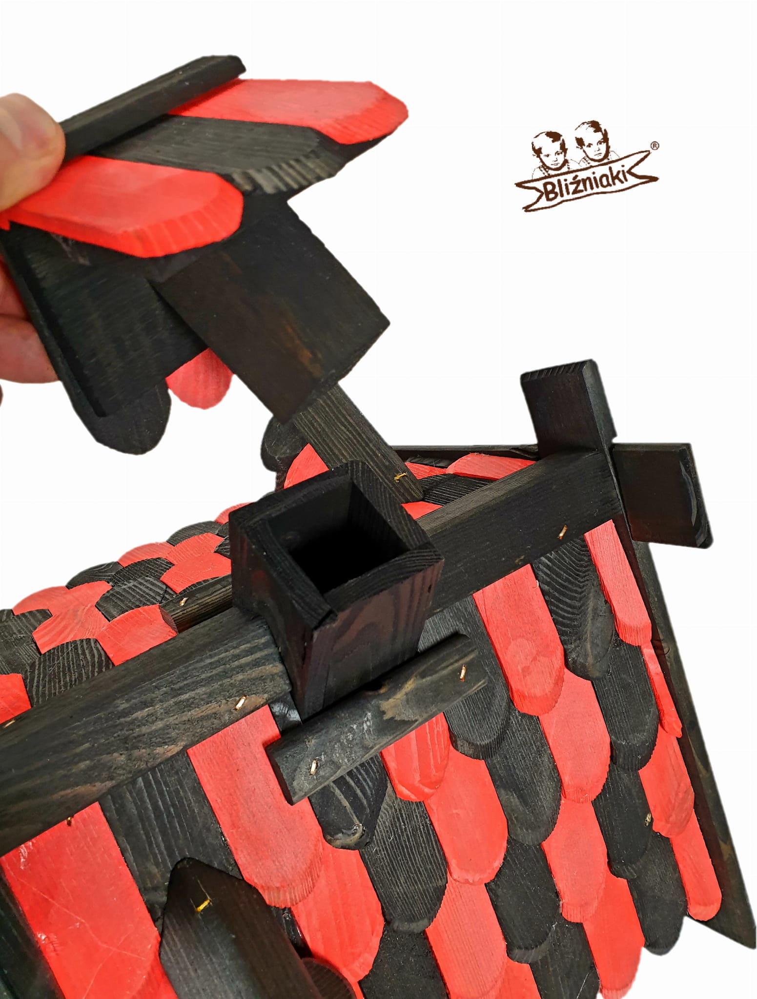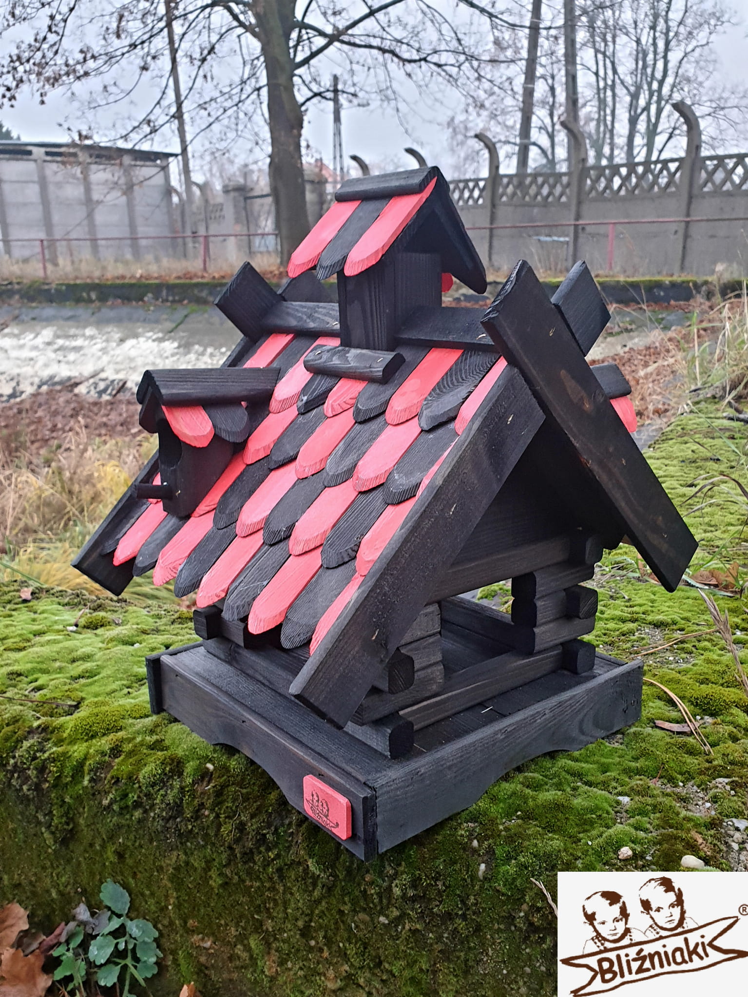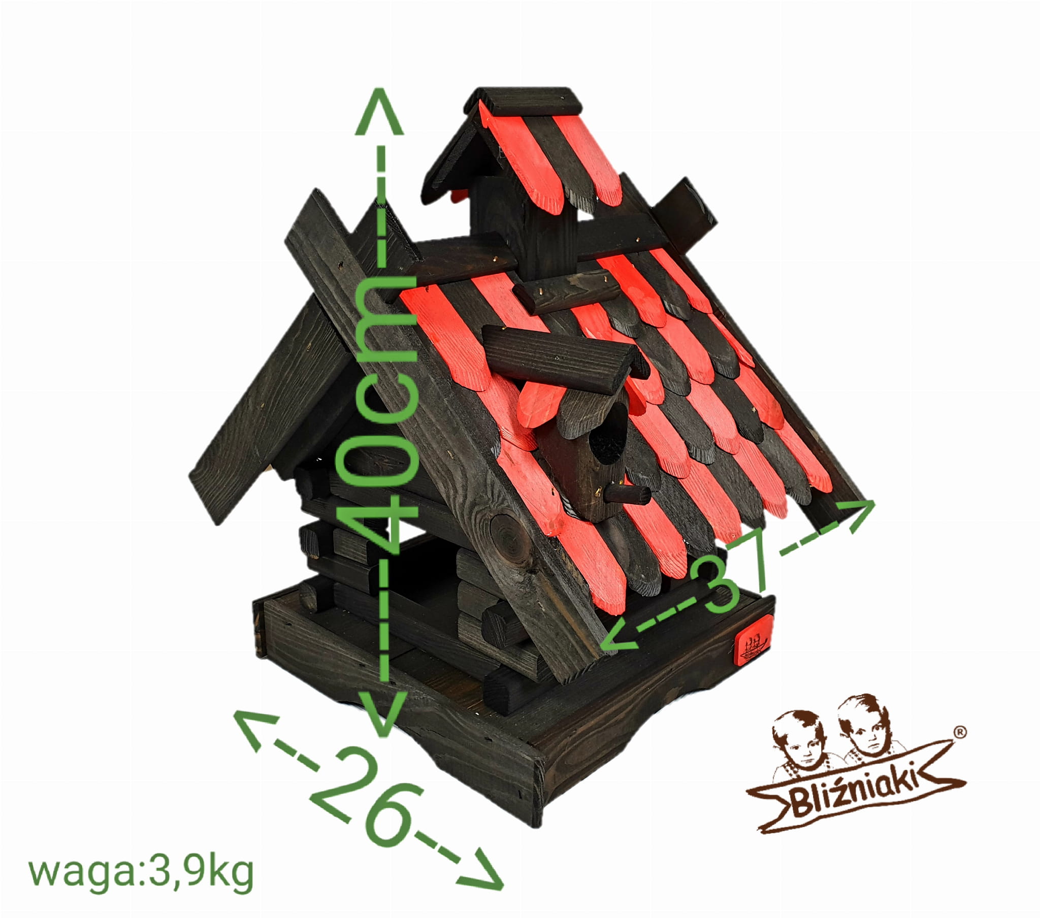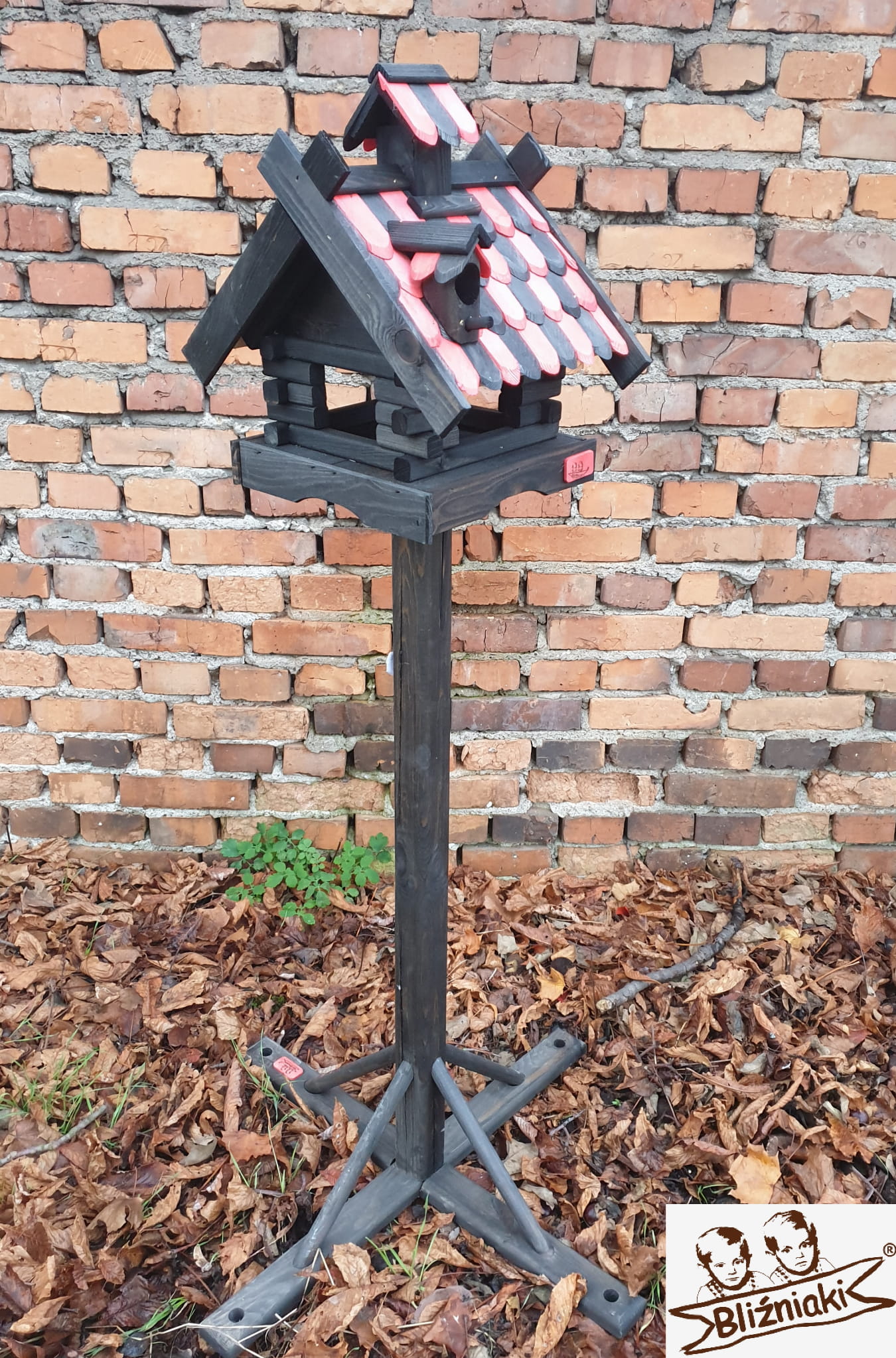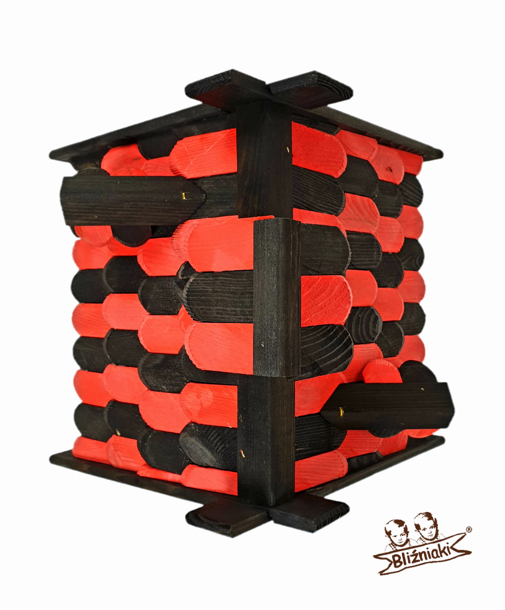 Karmnik dwukolorowy CZARNO - CZERWONY. Środek na bazie wody użyty do impregnacji jest w pełni ekologiczny i bezpieczny dla ludzi i zwierząt. Zabezpieczone w taki sposób drewno sprawia, że karmnik jest odporny na szkodliwe działanie wody oraz wilgoci, promieni UV, a także grzybów i pleśni, może być więc przechowywany przez cały rok na zewnątrz.