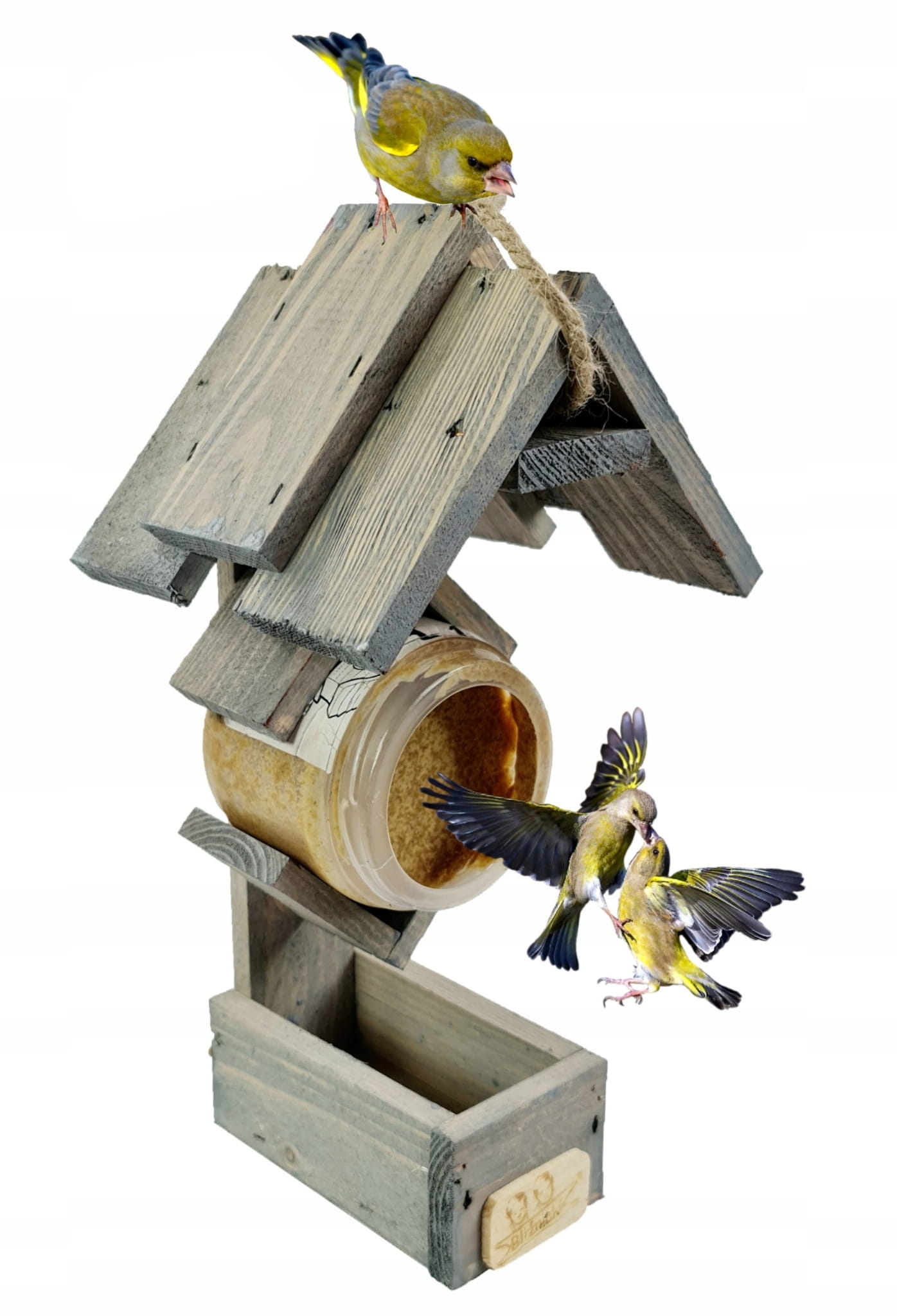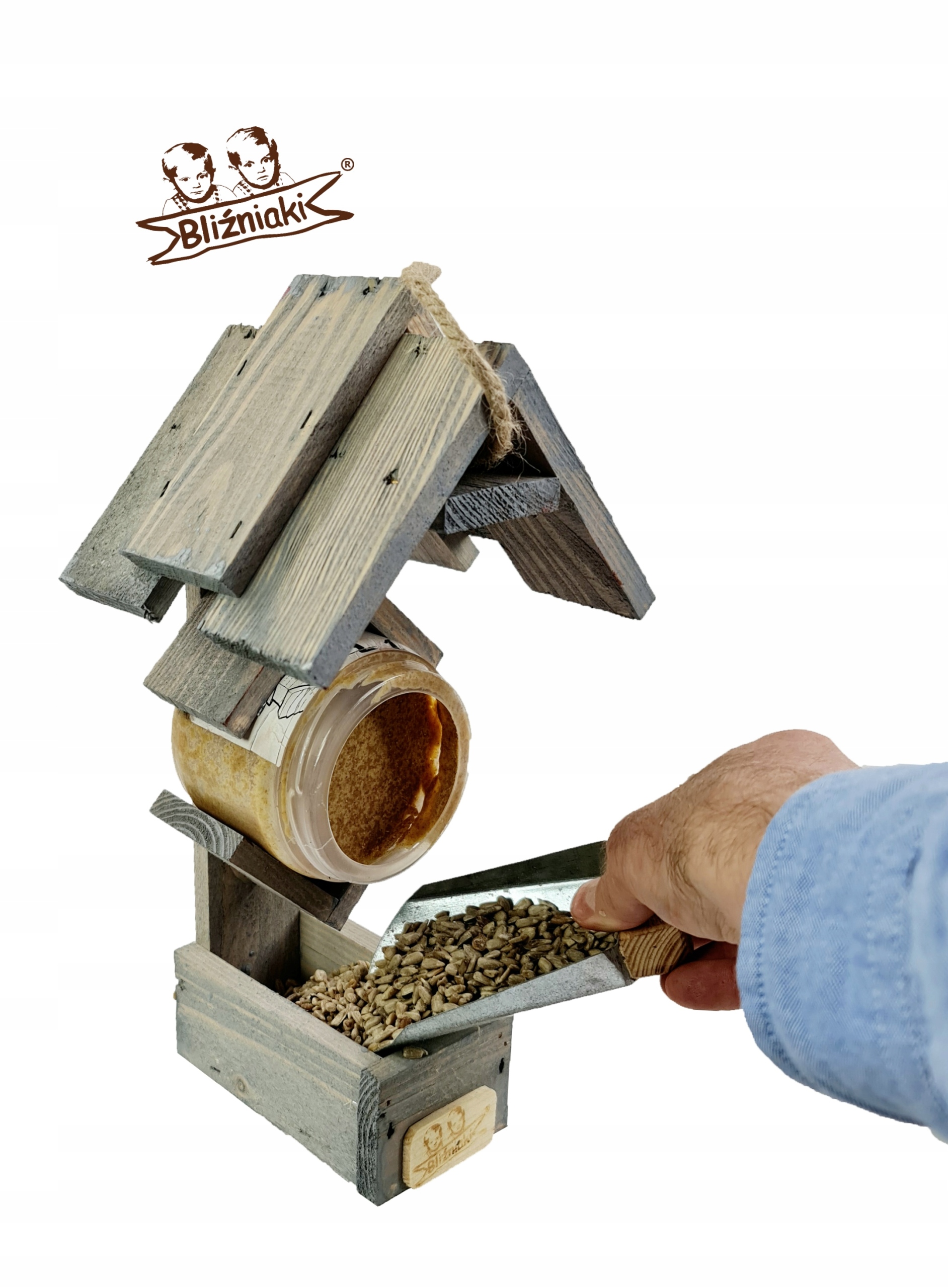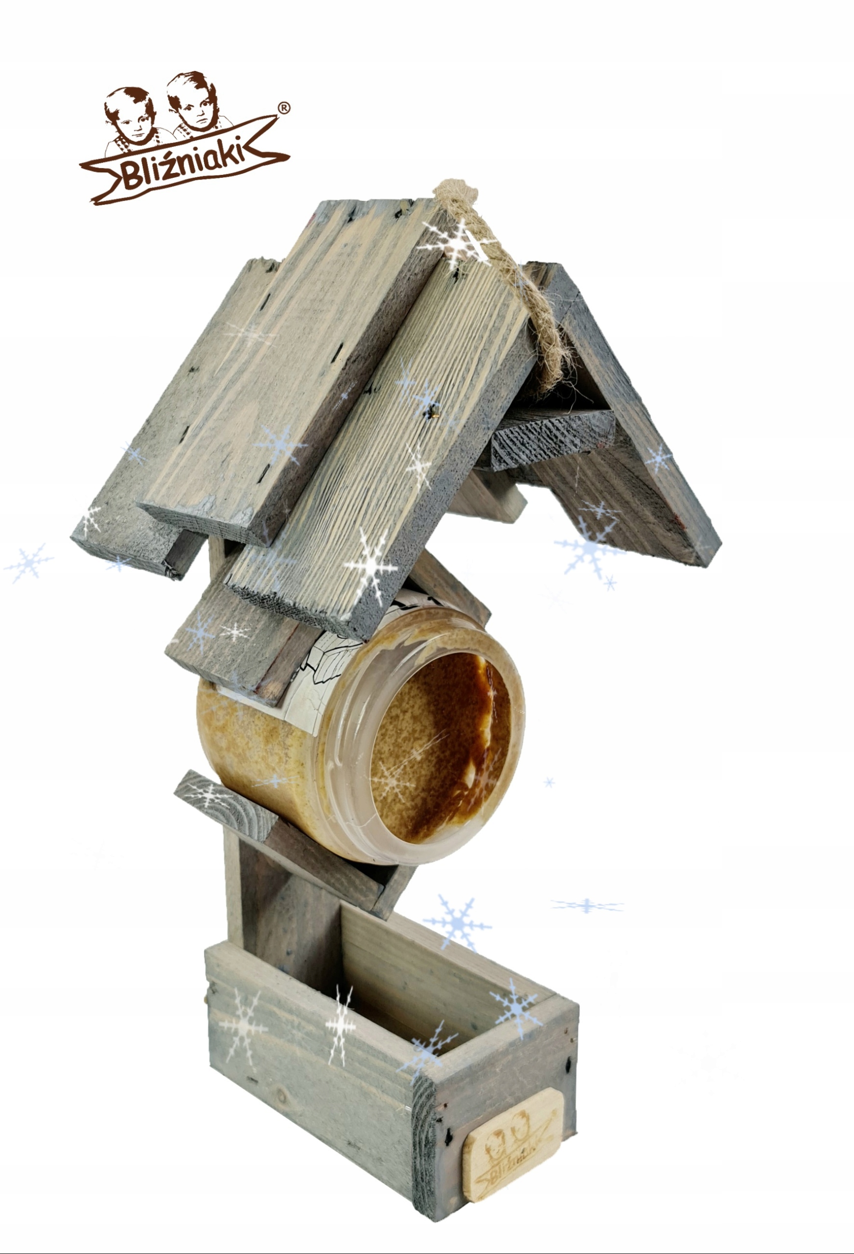 Karmnik dla Ptaków w Zestawie z Masłem Orzechowym Karmą dla Ziarnojadów Drewniany Stelaż Pojemnik na Pokarm Zawieszka Dodatkowe Miejsce na Kule Tłuszczowe lub Słoik z Mieszanką Energetyczną dla Ptaków ( K208 SN )