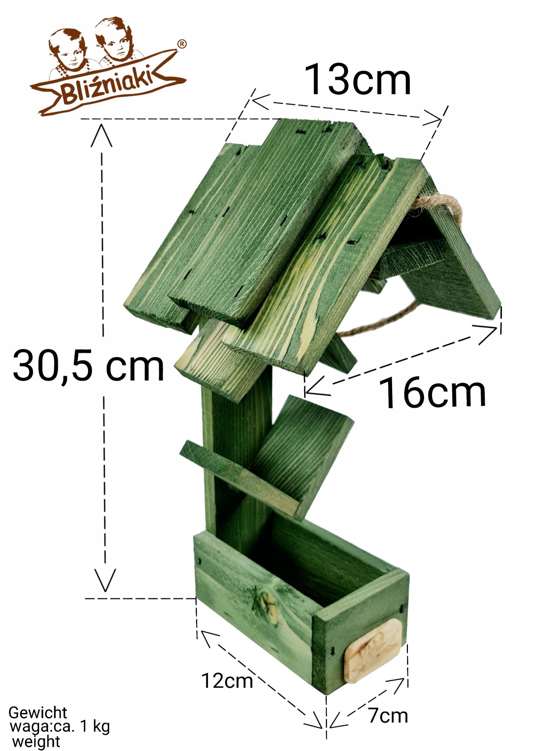 Wyposażony w szeroki dach, karmnik skutecznie chroni pożywienie przed deszczem i śniegiem. Dzięki temu zapewnia dłuższą świeżość dostarczanego pokarmu. Wykonany z wysokiej jakości drewna, karmnik zachwyca estetyką oraz gwarantuje trwałość przez wiele sezonów zimowych. Ze wględu na swe wymiary idealnie nadaje się do ogrodu, na balkon lub okienny parapet.