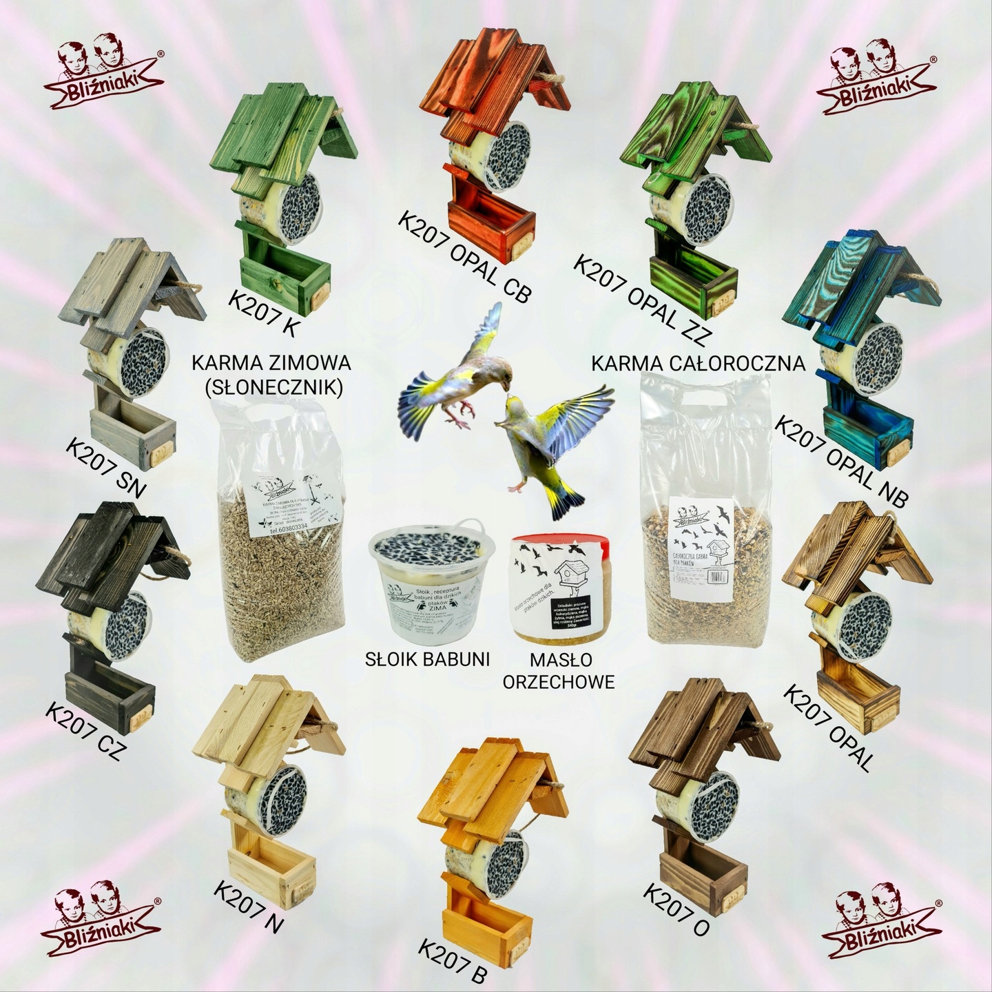 słonecznik ziarnisty łuszczony i niełuszczony, i wiele innych smakołyków w wygodnej formie pozwalającej powiesić produkt w dowolnym miejscu w ogrodzie, a także niezbędne do dokarmiania ptaków karmniki.