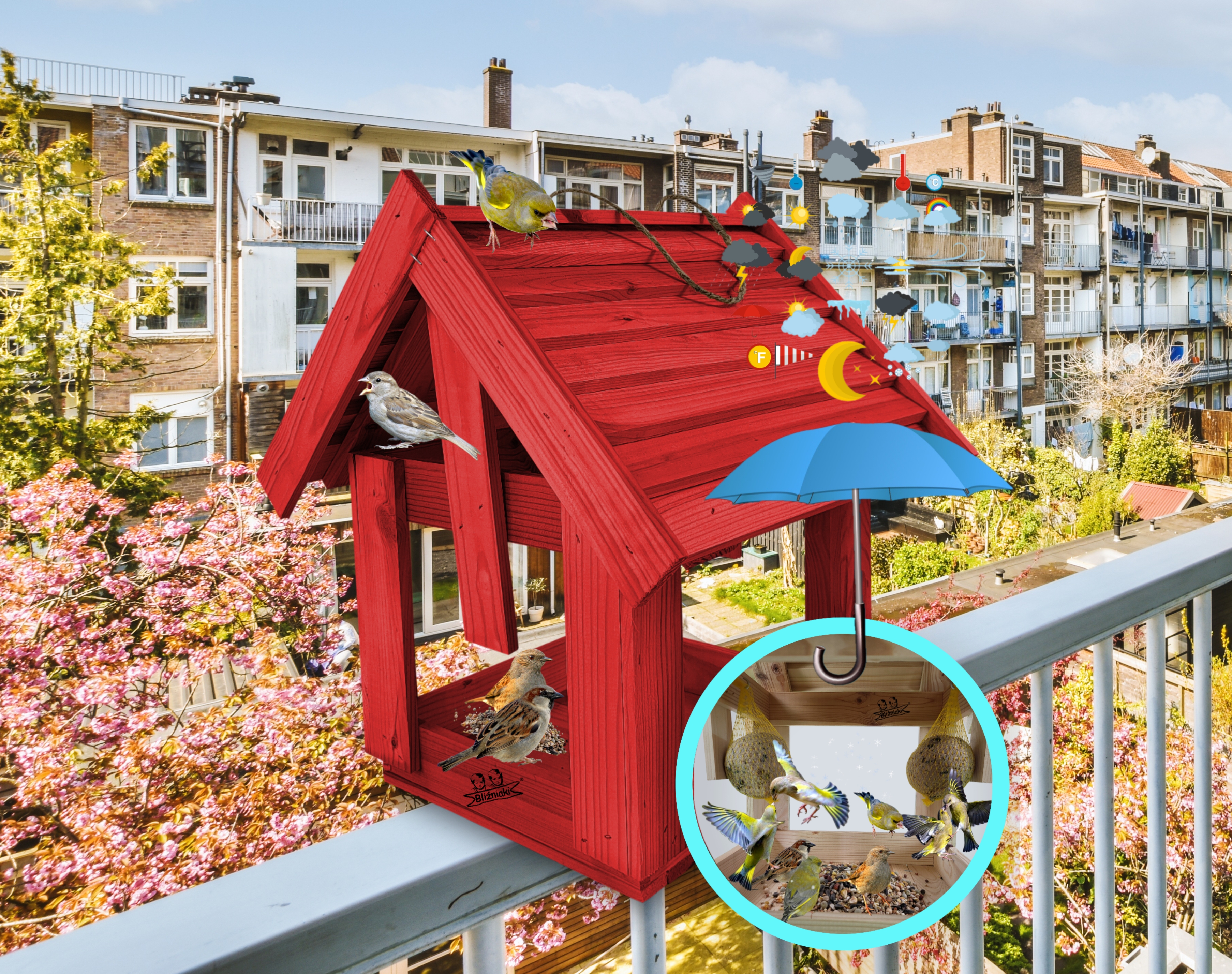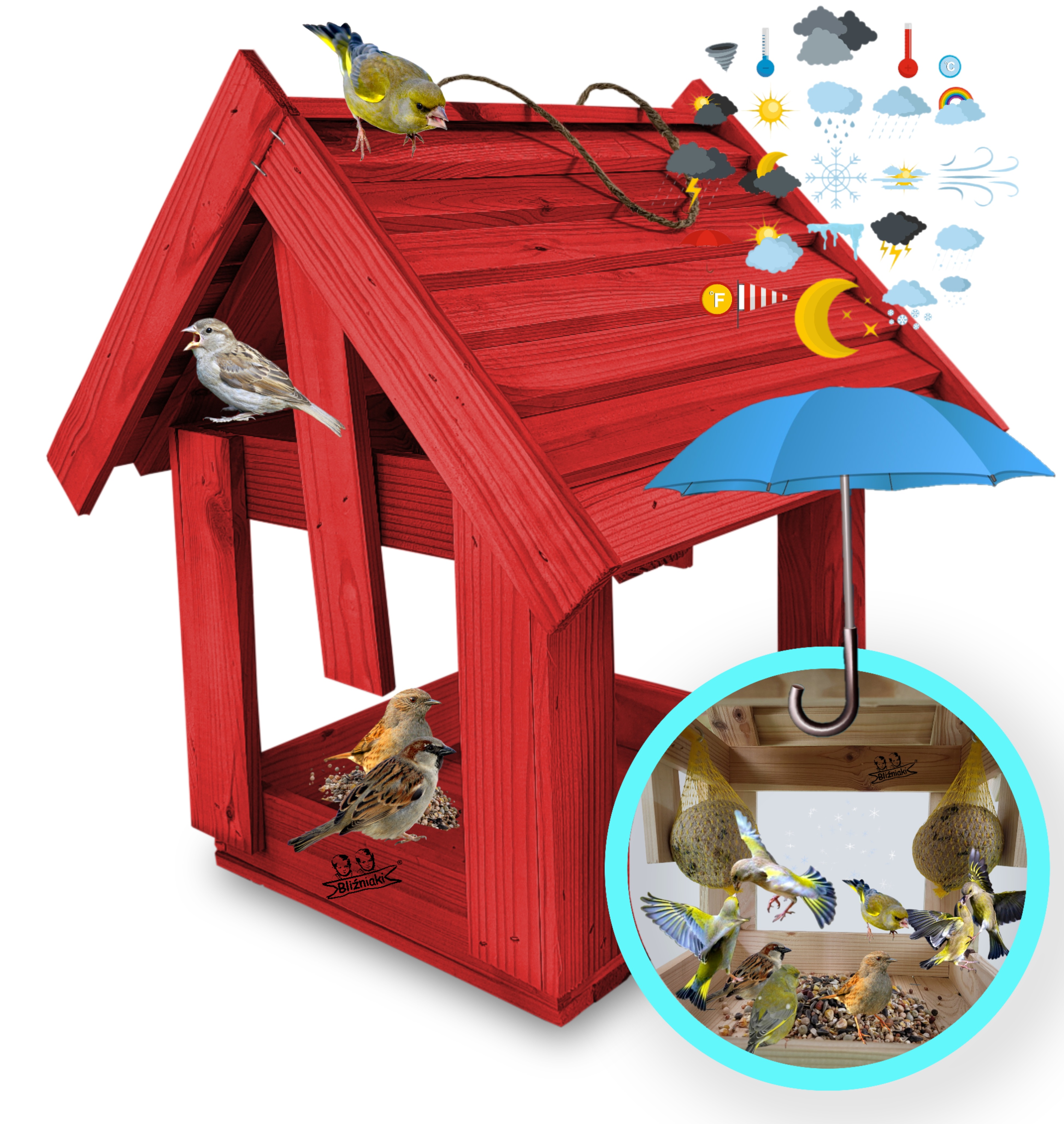 - Posiada szeroki dach chroniący karmę przed deszczem oraz innymi czynnikami atmosferycznymi