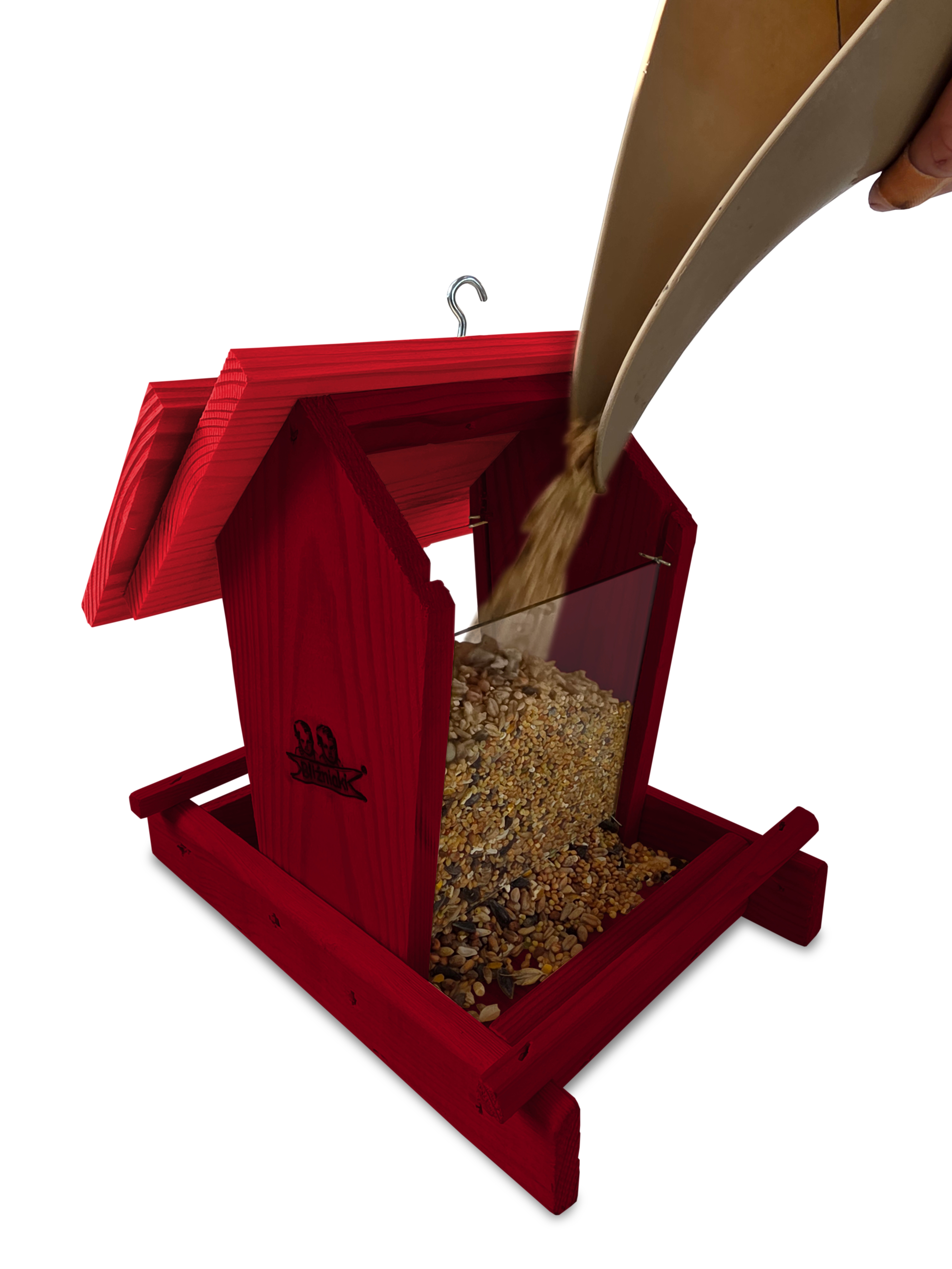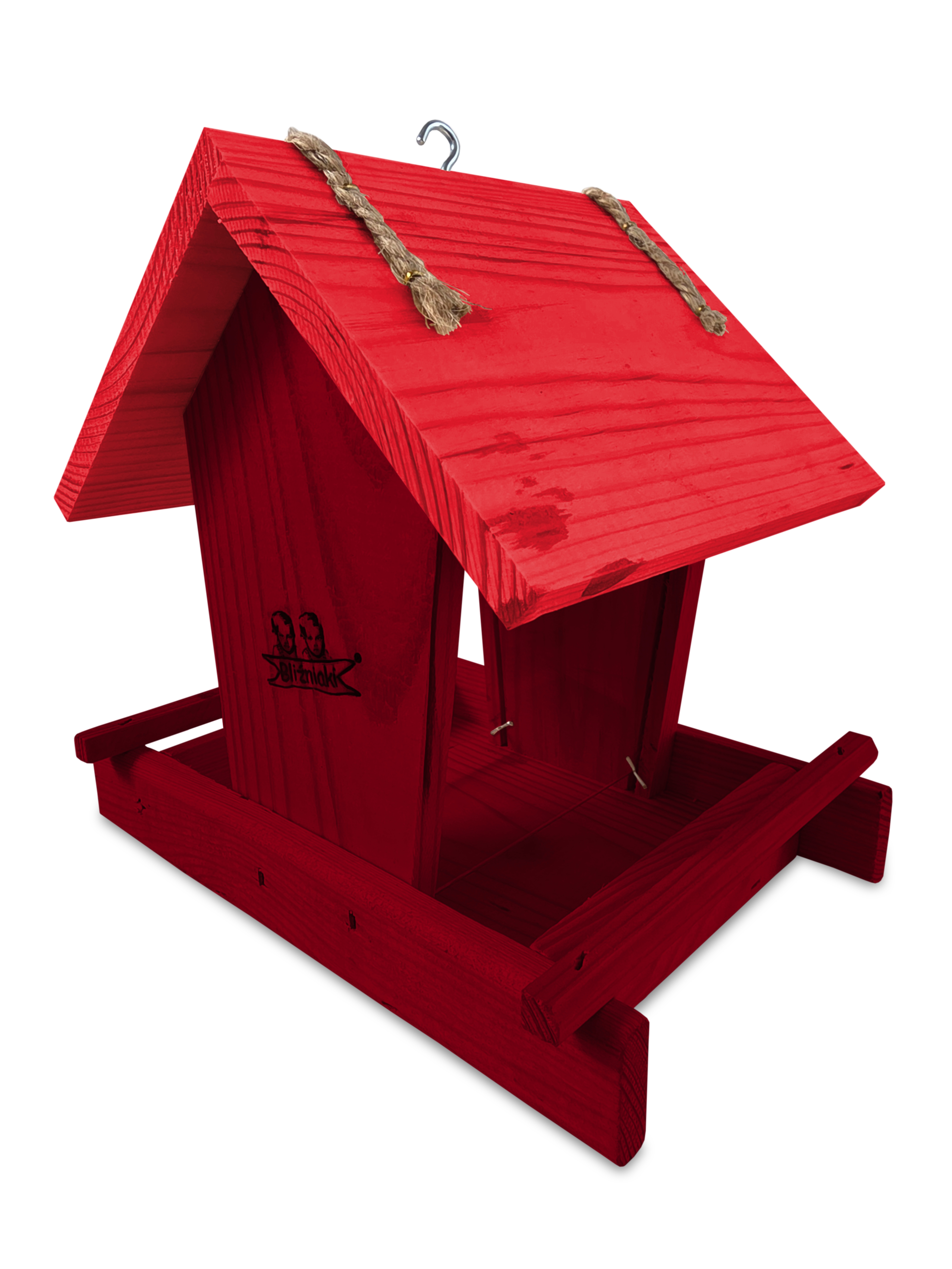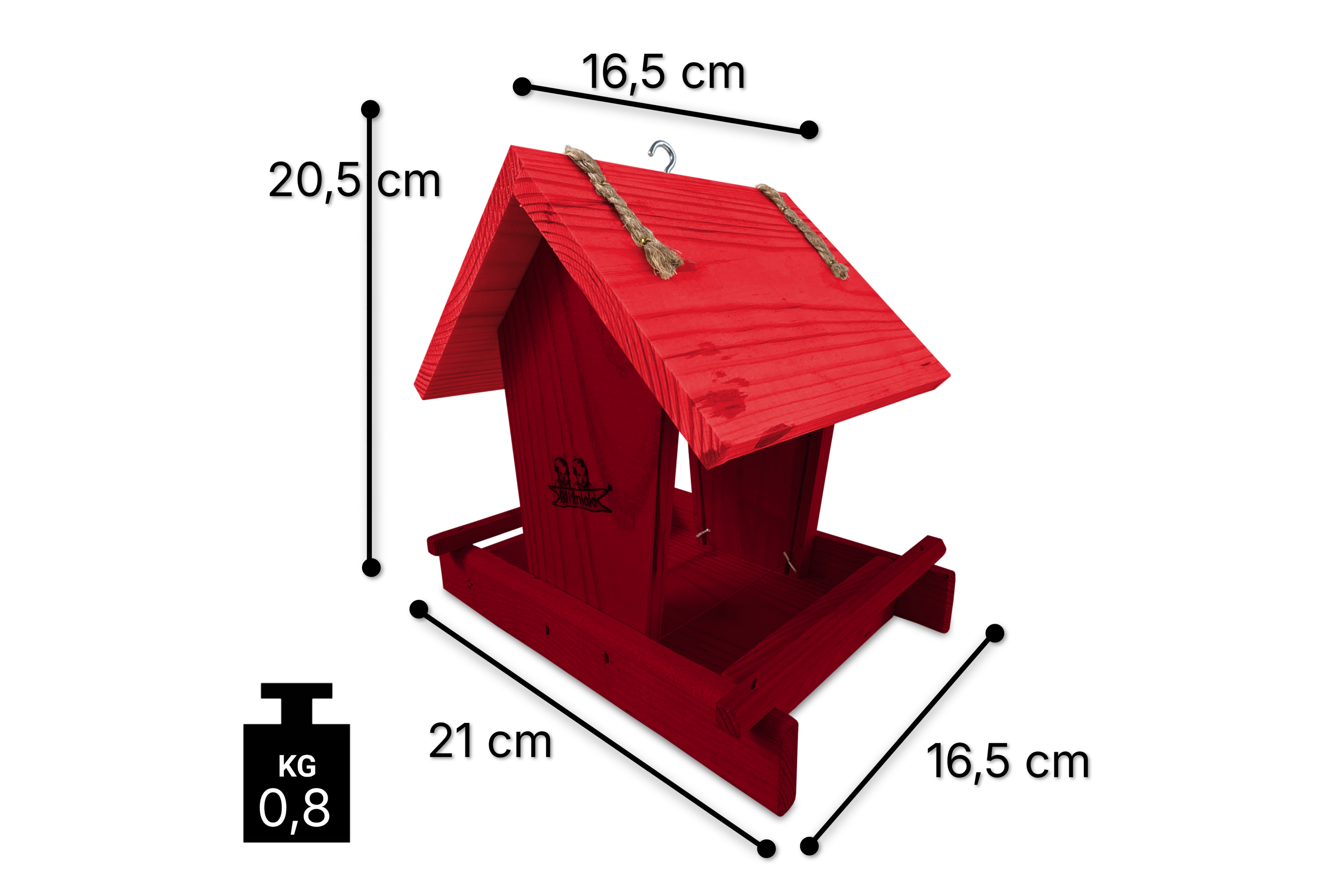 - Karmnik wykonany jest w całości z drewna iglastego, KOLOR MAHONIOWY Z CZERWONYM DACHEM
