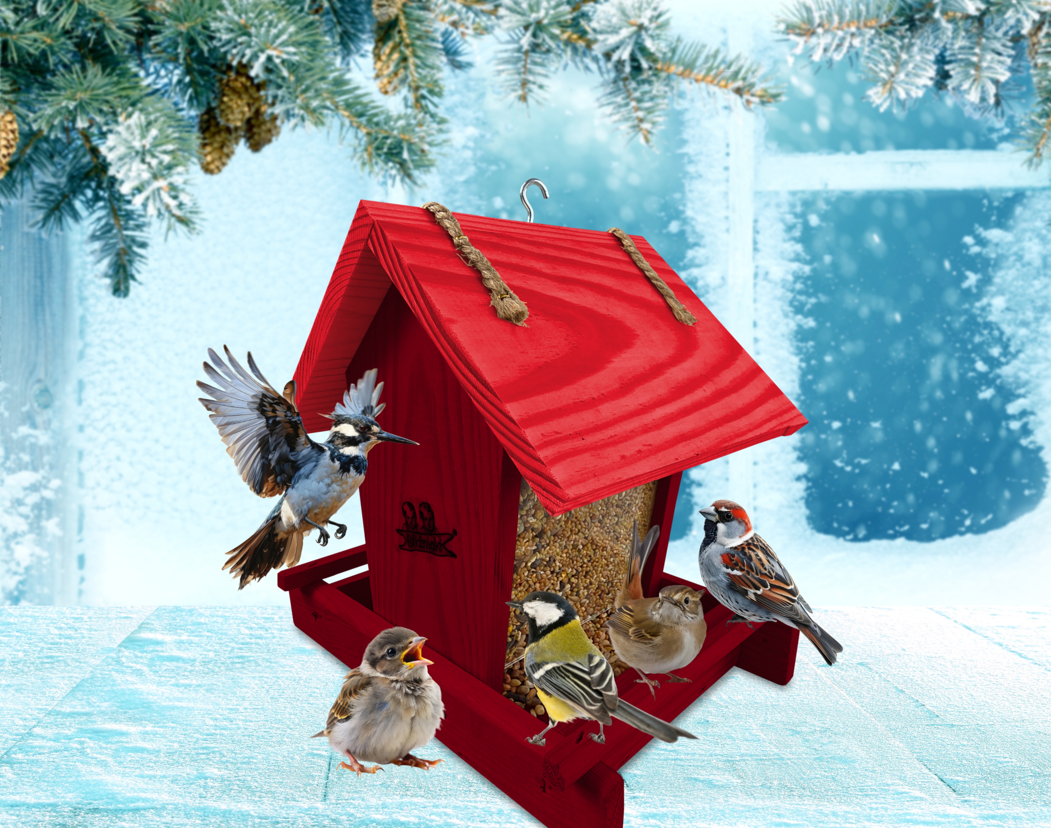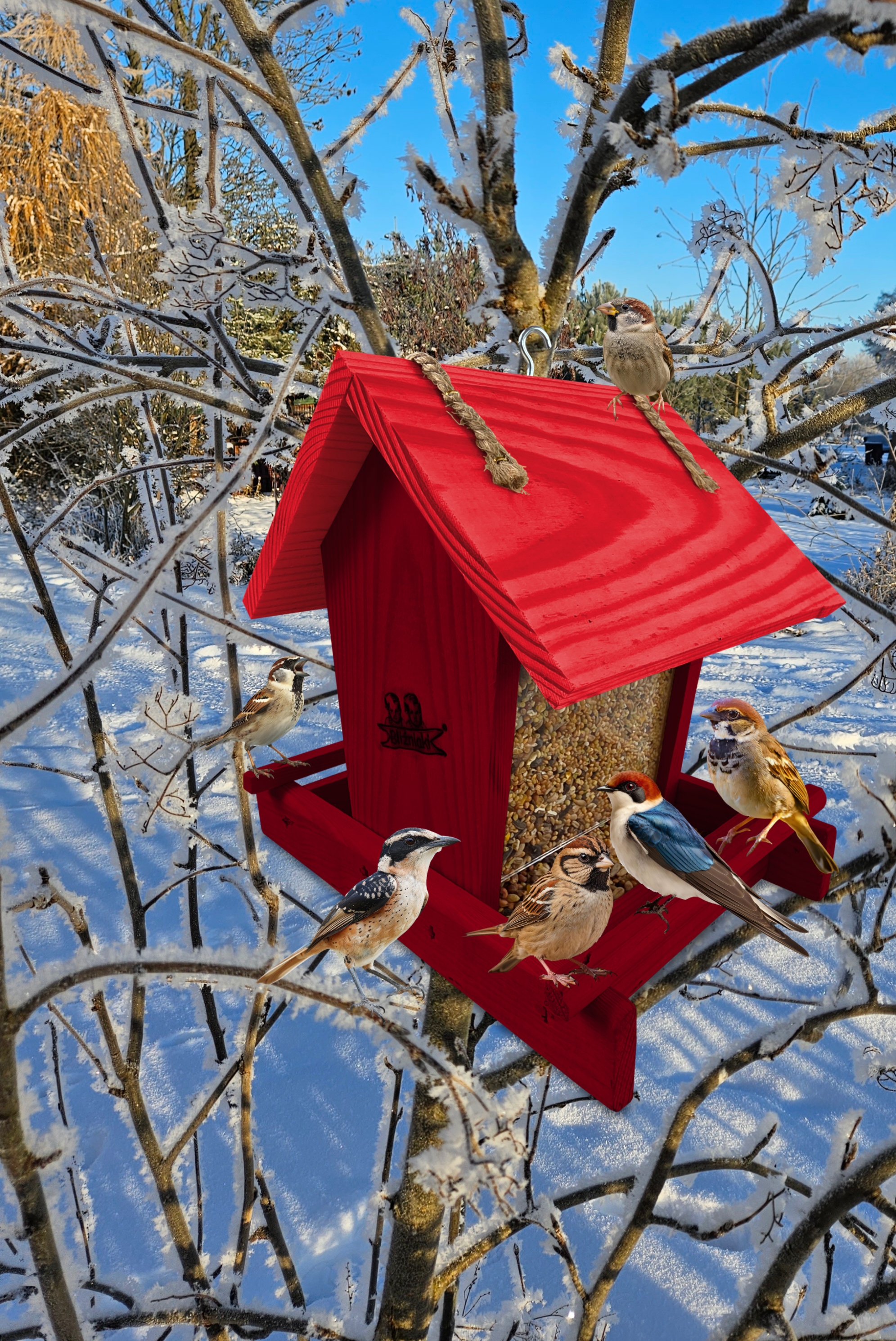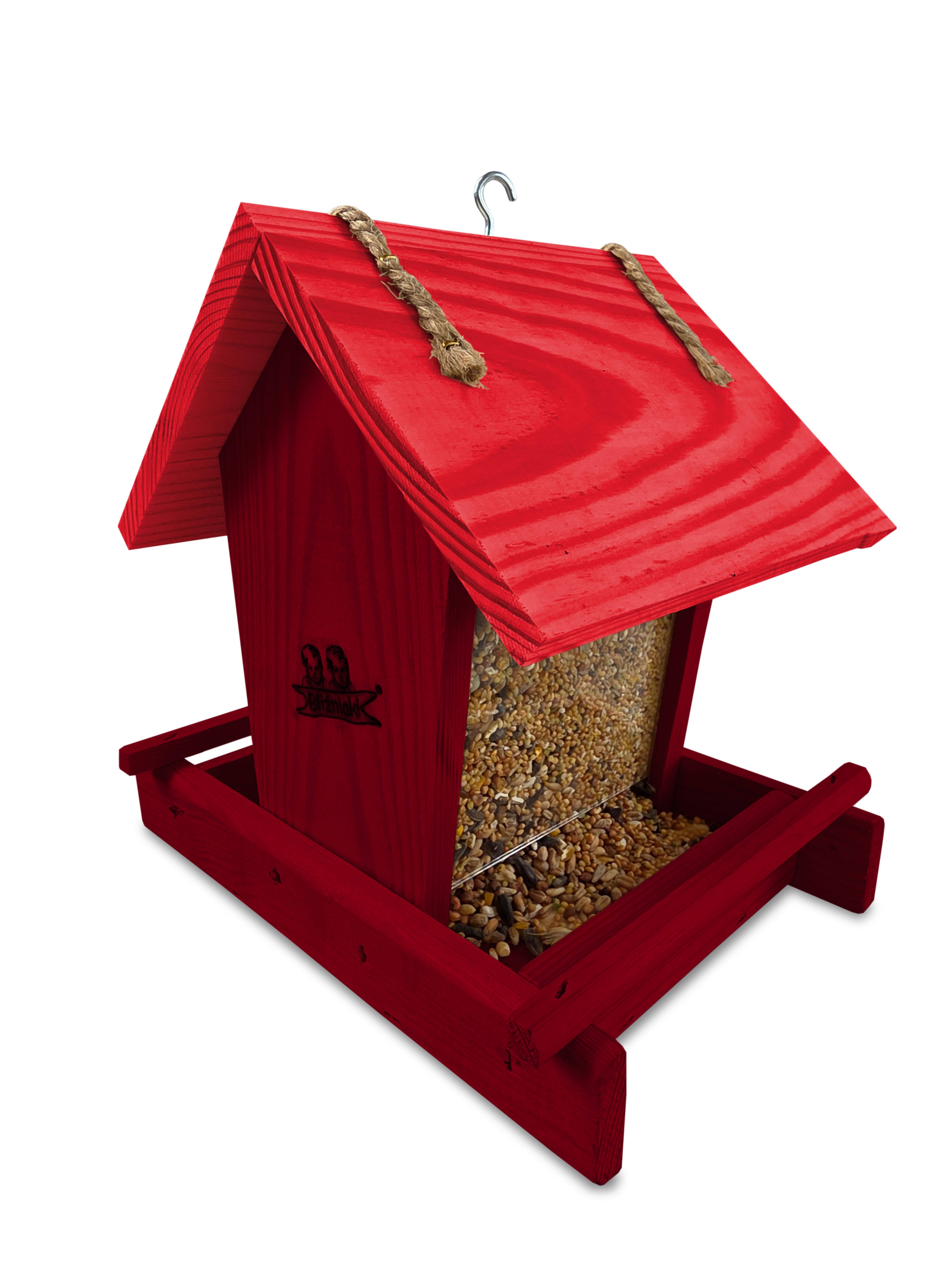 - Karmnik wykonany jest w całości z drewna iglastego, KOLOR MAHONIOWY Z CZERWONYM DACHEM