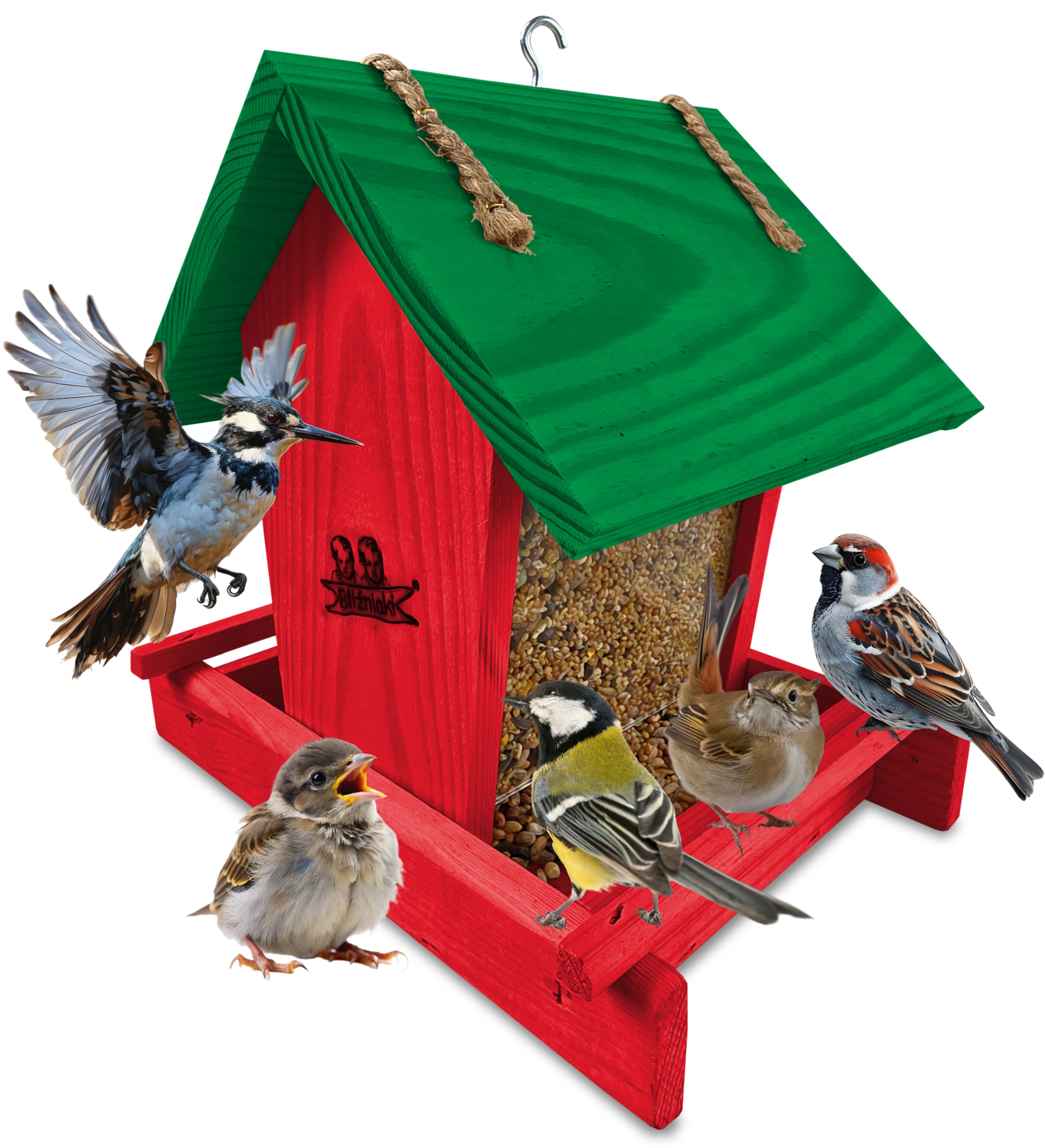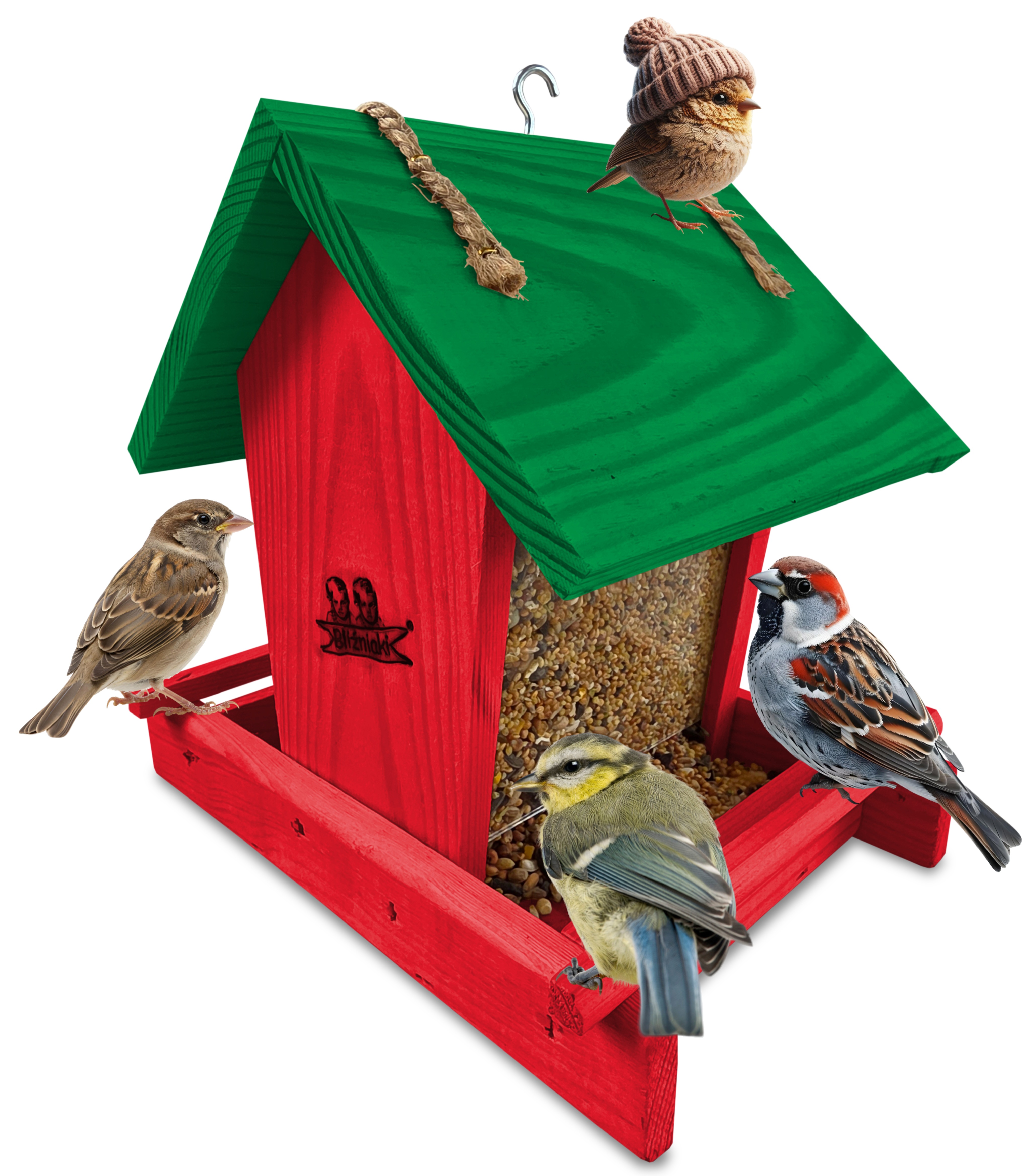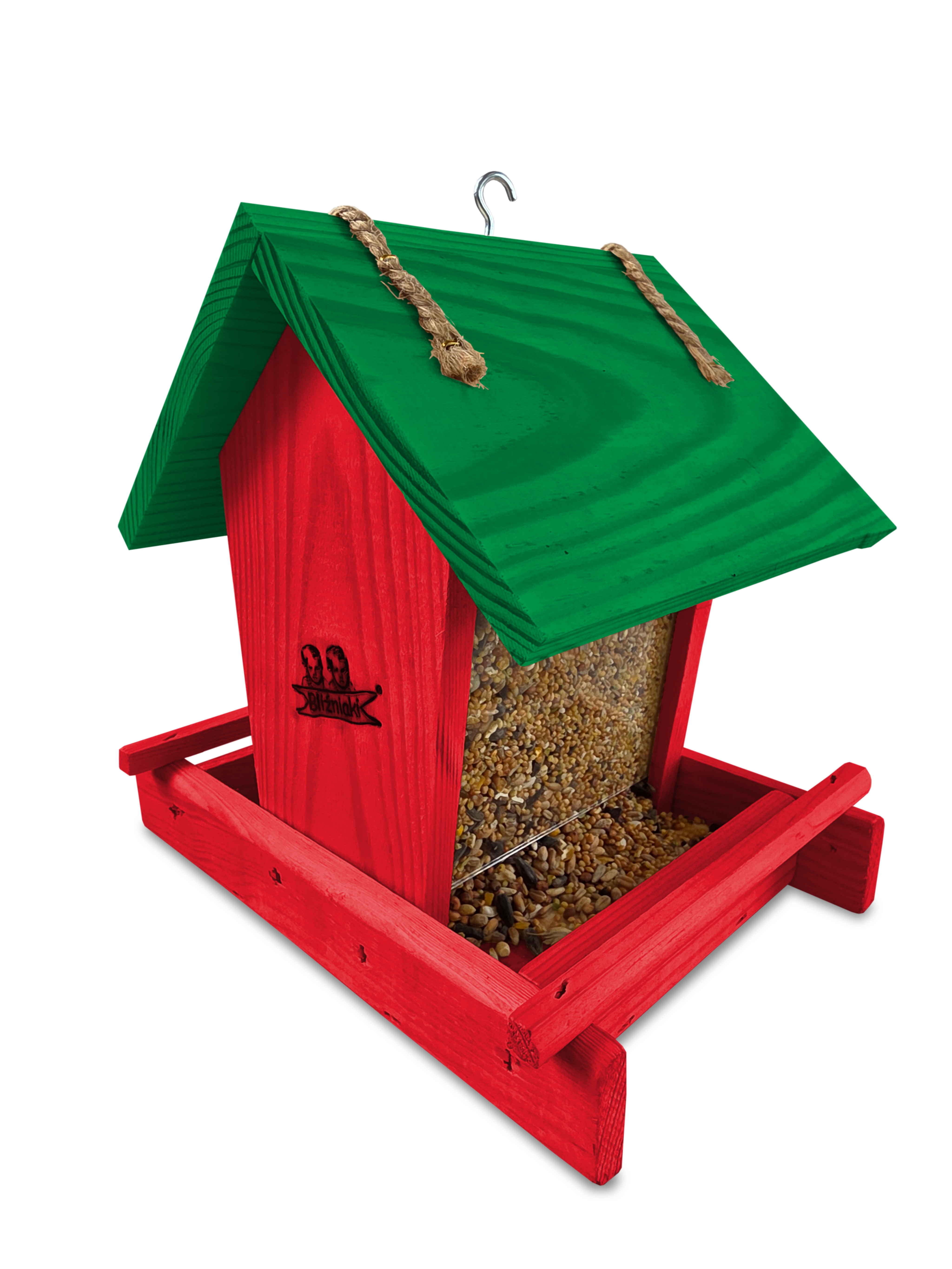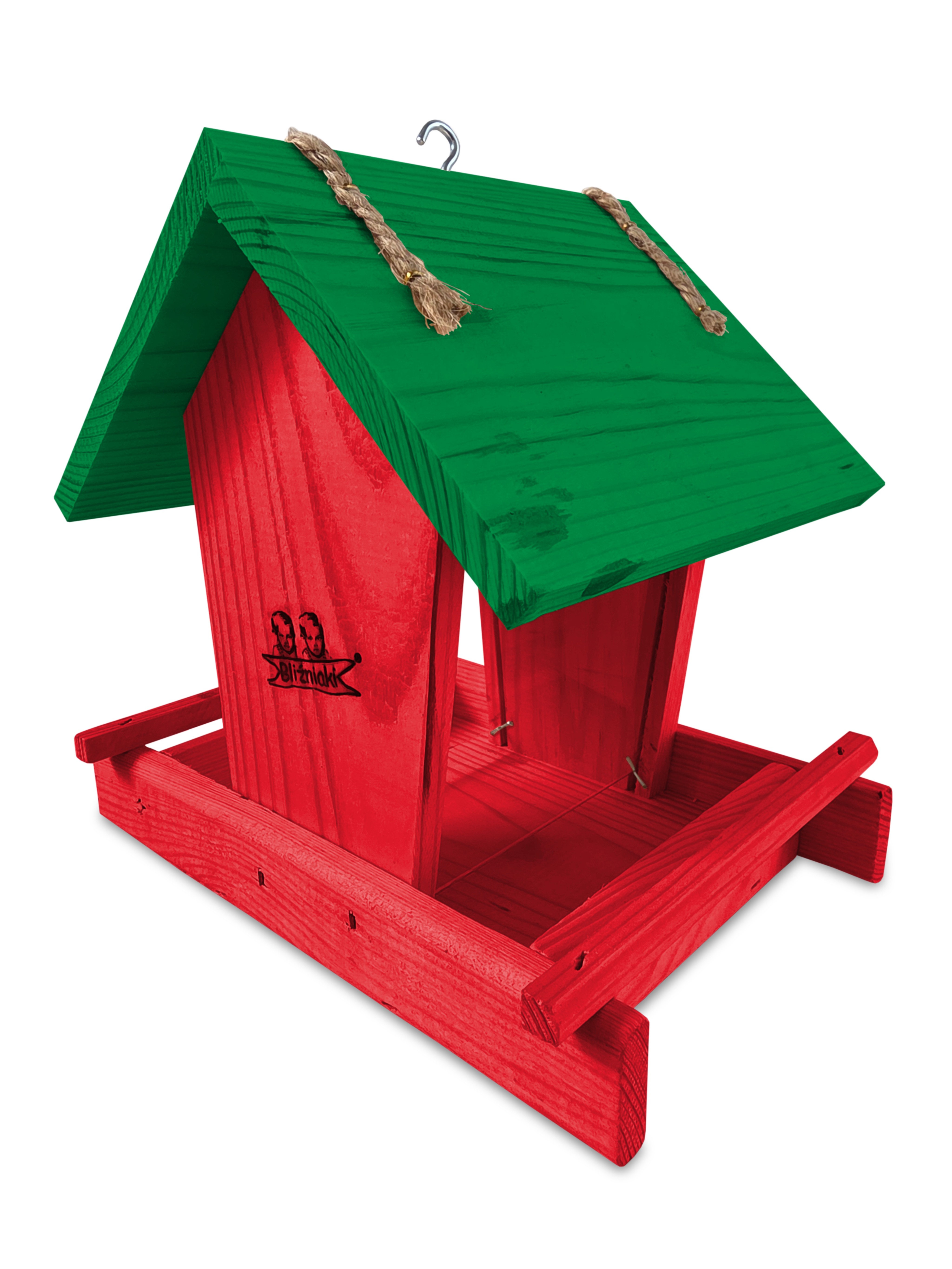 - Karmnik wykonany jest w całości z drewna iglastego, KOLOR CZERWONY Z CIEMNOZIELONYM DACHEM